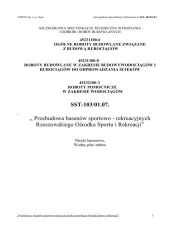 “MWM” Sp. z o.o. Sp.k. Szczegółowa Specyfikacja Techniczna nr SST-103/01.07. SZCZEGÓŁOWA SPECYFIKACJA TECHNICZNA WYKONANIA I ODBIORU ROBÓT BUDOWLANYCH 45231100-6 OGÓLNE ROBOTY BUDOWLANE ZWIĄZANE Z BUDOWĄ RUROCIĄGÓW 45231300-8 ROBOTY BUDOWLANE W ZAKRESIE BUDOWYWODOCIĄGÓW I RUROCIĄGÓW DO ODPROWADZANIA ŚCIEKÓW 45232100-3 ROBOTY POMOCNICZE W ZAKRESIE WODOCIĄGÓW SST-103/01.07. , ,, Przebudowa basenów sportowo - rekreacyjnych Rzeszowskiego Ośrodka Sportu i Rekreacji” Niecki basenowe, Wodny plac zabaw „Przebudowa basenów sportowo-rekreacyjnych Rzeszowskiego Ośrodka Sportu i Rekreacji” 1 “MWM” Sp. z o.o. Sp.k. Szczegółowa Specyfikacja Techniczna nr SST-103/01.07. 1. WSTĘP 1.1. Nazwa zadania „Przebudowa basenów sportowo- rekreacyjnych Rzeszowskiego Ośrodka Sportu i Rekreacji “ 1.2. Przedmiot i zakres stosowania Specyfikacji Przedmiotem niniejszej Specyfikacji Technicznej są wymagania dotyczące wykonania i odbioru robót związanych z budową rurociągów technologicznych realizowanych w ramach w.w.inwestycji Specyfikacja Techniczna jest stosowana jako dokument przetargowy i kontraktowy przy zlecaniu i realizacji robót wymienionych w punkcie 1.5. 1.3. Podstawa opracowania Niniejsza SST jest opracowana na podstawie dokumentów wymienionych w ST-KT 103/A/00.00. „Wymagania ogólne” pkt.1.3 . 1.4. Podstawowe definicje i pojęcia Określenia podane w niniejszej SST są zgodne z obowiązującymi normami, przepisami oraz z pkt 1.4. zawartym w Specyfikacji Technicznej „Wymagania Ogólne” ST-KT 103/A/00.00. 1.5. Zakres robót objętych Specyfikacją Roboty, których dotyczy Specyfikacja, obejmują wszystkie czynności umożliwiające i mające na celu budowę: • rurociągów technologicznych wody basenowej tj. – rurociągi przelewowe basenów: wyczynowego, rekreacyjnego i brodzików, – rurociągi tłoczne wody surowej dla basenów: wyczynowego, rekreacyjnego i brodzików, – rurociągi tłoczne wody uzdatnionej dla basenów: wyczynowego, rekreacyjnego i brodzików. – rurociągi zasilające brodziki do dezynfekcji stóp. rurociągów technologicznych atrakcji basenowych tj. – rurociągi atrakcji basenowych dla basenu rekreacyjnego, – rurociągi atrakcji basenowych dla brodzików. – rurociągi powietrzne leżanek i gejzerów powietrznych • • rurociągów technologicznych oraz montaż armatury i urządzeń technologicznych Wodnego Placu Zabaw 1.6. Nazwy i kody CPV wg wspólnego słownika zamówień 45231100-6 OGÓLNE ROBOTY BUDOWLANE ZWIĄZANE Z BUDOWĄ RUROCIĄGÓW 45231300-8 ROBOTY BUDOWLANE W ZAKRESIE BUDOWYWODOCIĄGÓW I RUROCIĄGÓW DO ODPROWADZANIA ŚCIEKÓW „Przebudowa basenów sportowo-rekreacyjnych Rzeszowskiego Ośrodka Sportu i Rekreacji” 2 “MWM” Sp. z o.o. Sp.k. Szczegółowa Specyfikacja Techniczna nr SST-103/01.07. 45232100-3 ROBOTY POMOCNICZE W ZAKRESIE WODOCIĄGÓW 2. MATERIAŁY Warunki ogólne stosowania materiałów podano w specyfikacji ST-KT-103/A/00.00 "Wymagania ogólne" pkt 2. Przy wykonywaniu robót należy stosować wyroby, które zostały dopuszczone do obrotu i powszechnego stosowania w budownictwie. Wszystkie użyte wyroby muszą posiadać aktualne polskie aprobaty techniczne lub odpowiadać Polskim Normom. Do każdej partii materiałów dostawca (producent) powinien dołączyć deklaracje zgodności wyrobów z właściwymi Polskimi Normami lub Aprobatami Technicznymi. Wykonawca uzyska przed zastosowaniem wyrobu akceptację Inspektora Nadzoru. Odbiór techniczny materiałów powinien być dokonywany według wymagań i w sposób określony aktualnymi normami. 2.1. Rurociągi technologiczne wody basenowej • • • • Do budowy rurociągów przelewowych- grawitacyjnych stosować: - rury i kształtki z PE100 SDR17 PN10 o zmiennej średnicy od Dy 200mm do Dy 500 mm. Do budowy rurociągów tłocznych wody surowej stosować: - stosować rury i kształtki z PE100 SDR17 PN10 o średnicy od Dy 225 do Dy355 mm. Do budowy rurociągów tłocznych wody uzdatnionej stosować: - rury i kształtki z PE 100 SDR17 PN10 o średnicy od Dy225mm do 355 mm Do budowy rurociągów zasilających brodziki do płukania stóp stosować: - rury PE100 SDR17 PN10 o średnicy Dy 63 x 3,8 mm 2.2. Rurociągi technologiczne atrakcji basenowych • • • Rurociągi ssawne dla basenu rekreacyjnego - ,,dzika rzeka “ -zastosować 2 rury z PE 100 SDR17 PN10 o Dy315x18,7mm - stacja hydromasażu ściennego –zastosować rurę z PE 100 SDR 17 PN10 o Dy 315 x18,7 mm - r.ss. wspólny dla zespołu tryskaczy, parasola wodnego i kurtyny groty – stosować rurę z PE100 SDR17PN10 o średnicy Dy =315x18,7mm. - zjeżdżalni wodnej – zastosować rurę z PE 100SDR 17 PN10 o średnicy Dy= 280x 16,6mm. Rurociągi ssawne dla brodzików - r.ss.wspólny dla zespołu tryskaczy i ,,jeżyków wodnych” – zastosować rurę z PE100 SDR17 PN10 o średnicy Dy= 90x 5,4 mm - r.ss. ,,grzybka wodnego”- zastosować rurę z PE100 SDR17 PN10 o średnicy Dy= 110x6,6mm Rurociągi tłoczne dla basenu rekreacyjnego - ,,dzika rzeka” –zastosować 2 rury z PE 100 SDR17 PN10 o średnicy Dy = 280x16,6 mm - stacja hydromasażu ściennego – zastosować rurę z PE 100 SDR17 PN10 o średnicy Dy=280x16,6mm. - zespół trzech tryskaczy armatek – zastosować rurę z PE100 SDR17 PN10 o średnicy Dy = 225x 13,4 mm. - zespół dwóch tryskaczy cascada – zastosować rurę o średnicy Dy= 160x9,5 mm - ,,parasol wodny” –zastosować rurę z PE100 SDR17 PN10 o średnicy Dy=160 x 9,5 mm „Przebudowa basenów sportowo-rekreacyjnych Rzeszowskiego Ośrodka Sportu i Rekreacji” 3 “MWM” Sp. z o.o. Sp.k. • • Szczegółowa Specyfikacja Techniczna nr SST-103/01.07. - kurtyna groty – zastosowć rurę z PE100 SDR17 PN10 o średnicy Dy = 125x 7,5 mm. - zjeżdżalnia wodna – stosować rurę z PE100 SDR17 PN10 Oo średnicy Dy = 160 x9,5 mm. Rurociągi tłoczne dla brodzików - zespół dwóch tryskaczy ,, Delfin “i ,, Pelikan” – zastosować rurę z PE100 SDR17