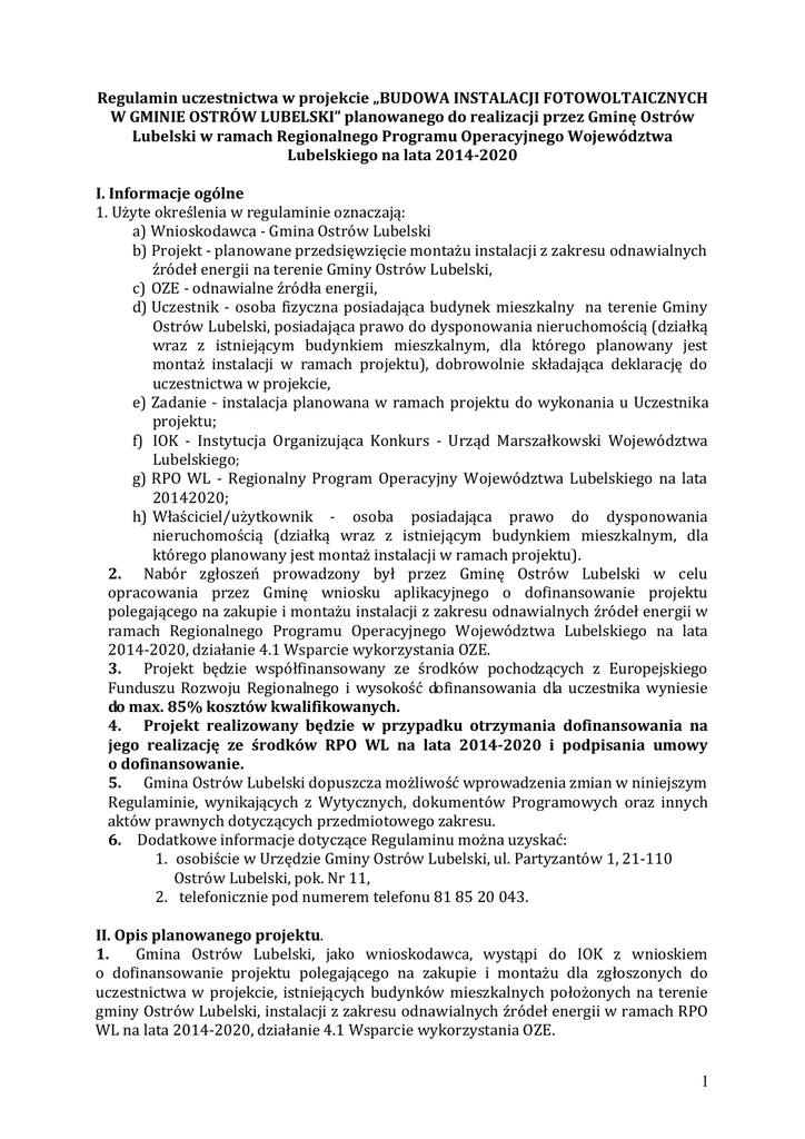 Regulamin uczestnictwa w projekcie „BUDOWA INSTALACJI FOTOWOLTAICZNYCH W GMINIE OSTRÓW LUBELSKI” planowanego do realizacji przez Gminę Ostrów Lubelski w ramach Regionalnego Programu Operacyjnego Województwa Lubelskiego na lata 2014-2020 I. Informacje ogólne 1. Użyte określenia w regulaminie oznaczają: a) Wnioskodawca - Gmina Ostrów Lubelski b) Projekt - planowane przedsięwzięcie montażu instalacji z zakresu odnawialnych źródeł energii na terenie Gminy Ostrów Lubelski, c) OZE - odnawialne źródła energii, d) Uczestnik - osoba fizyczna posiadająca budynek mieszkalny na terenie Gminy Ostrów Lubelski, posiadająca prawo do dysponowania nieruchomością (działką wraz z istniejącym budynkiem mieszkalnym, dla którego planowany jest montaż instalacji w ramach projektu), dobrowolnie składająca deklarację do uczestnictwa w projekcie, e) Zadanie - instalacja planowana w ramach projektu do wykonania u Uczestnika projektu; f) IOK - Instytucja Organizująca Konkurs - Urząd Marszałkowski Województwa Lubelskiego; g) RPO WL - Regionalny Program Operacyjny Województwa Lubelskiego na lata 20142020; h) Właściciel/użytkownik - osoba posiadająca prawo do dysponowania nieruchomością (działką wraz z istniejącym budynkiem mieszkalnym, dla którego planowany jest montaż instalacji w ramach projektu). 2. Nabór zgłoszeń prowadzony był przez Gminę Ostrów Lubelski w celu opracowania przez Gminę wniosku aplikacyjnego o dofinansowanie projektu polegającego na zakupie i montażu instalacji z zakresu odnawialnych źródeł energii w ramach Regionalnego Programu Operacyjnego Województwa Lubelskiego na lata 2014-2020, działanie 4.1 Wsparcie wykorzystania OZE. 3. Projekt będzie współfinansowany ze środków pochodzących z Europejskiego Funduszu Rozwoju Regionalnego i wysokość dofinansowania dla uczestnika wyniesie do max. 85% kosztów kwalifikowanych. 4. Projekt realizowany będzie w przypadku otrzymania dofinansowania na jego realizację ze środków RPO WL na lata 2014-2020 i podpisania umowy o dofinansowanie. 5. Gmina Ostrów Lubelski dopuszcza możliwość wprowadzenia zmian w niniejszym Regulaminie, wynikających z Wytycznych, dokumentów Programowych oraz innych aktów prawnych dotyczących przedmiotowego zakresu. 6. Dodatkowe informacje dotyczące Regulaminu można uzyskać: 1. osobiście w Urzędzie Gminy Ostrów Lubelski, ul. Partyzantów 1, 21-110 Ostrów Lubelski, pok. Nr 11, 2. telefonicznie pod numerem telefonu 81 85 20 043. II. Opis planowanego projektu. 1. Gmina Ostrów Lubelski, jako wnioskodawca, wystąpi do IOK z wnioskiem o dofinansowanie projektu polegającego na zakupie i montażu dla zgłoszonych do uczestnictwa w projekcie, istniejących budynków mieszkalnych położonych na terenie gminy Ostrów Lubelski, instalacji z zakresu odnawialnych źródeł energii w ramach RPO WL na lata 2014-2020, działanie 4.1 Wsparcie wykorzystania OZE. 1 2. Zaplanowany rodzaj instalacji w projekcie: a) panele fotowoltaiczne: - służą do produkcji energii elektrycznej na potrzeby gospodarstwa domowego, - szacunkowy koszt brutto instalacji oraz wartość udziału uczestnika projektu będzie zależała od wielkości zamontowanej instalacji solarnej oraz miejsca lokalizacji i będzie określony w umowie Uczestnictwa w projekcie, która będzie podpisywana po pozytywnym przejściu procedury aplikacyjnej przez Gminę Ostrów Lubelski, - nie ma możliwości montażu instalacji na dachach pokrytych eternitem, - planowany jest montaż instalacji przede wszystkim na połaciach dachowych. Ze względu na wydajność instalacji, wariantem najbardziej korzystnym jest strona południowa dachu, południowo-wschodnia lub południowo-zachodnia. III. Warunki i ograniczenia 1. Instalacje oraz ich efekty mogą być wykorzystywane wyłącznie na potrzeby gospodarstwa domowego (nie mylić z potrzebami gospodarstwa rolnego), czyli do zasilania urządzeń codziennego użytku, np. pralka, lodówka, itp. 2. Dopuszcza się montaż instalacji fotowoltaicznej na gruncie. 3. Miejsce przewidziane do wykonania montażu instalacji, może być zweryfikowane przez osoby upoważnione przez Gminę Ostrów Lubelski pod kątem możliwości wykonania instalacji. 4. Ostateczny dobór urządzenia, które zostanie zainstalowane, dokonany zostanie na podstawie zweryfikowanych informacji podanych w deklaracji oraz oceny wykonawcy. 5. W trakcie realizacji projektu oraz okresie trwałości tj. w ciągu 5 lat od zatwierdzenia końcowego wniosku o płatność (przewidywany termin do końca 2023r.) uczestnik zobowiązuje się do: - wykorzystywania instalacji oraz jej efektów wyłącznie na potrzeby gospodarstwa domowego; - właściwej eksploatacji instalacji, tj. zgodnej z pierwotnym przeznaczeniem i parametrami technicznymi; - niedokonywania żadnych przeróbek i zmian w instalacji bez wiedzy i zgody Gminy Ostrów Lubelski; 6. Moc zainstalowanej instalacji fotowoltaicznej nie może przekroczyć mocy przyłączeniowej wynikającej z umowy na dostawę energii elektrycznej oraz wartości 5 kW. 7. Właściciel/użytkownik budynku zobowiązuje się do wykonania wszystkich prac dostosowujących pomieszczenia budynku do montażu OZE na własny koszt. 8. Gmina Ostrów Lubelski nie ma wpływu i nie ponosi odpowiedzialności za warunki wprowadzania energii do sieci, ustalone przez Zakład Energetyczny. 9. Prawa, obowiązki oraz zobowiązanie rzeczowo-finansowe wynkające z umowy o przyłączenie instalacji fotowoltaicznej z Operatorem Systemy Dystrybucyjnego, leżą po stronie Właściciela nieruchomości. 10. Należy pamiętać, że celem udziału w projekcie nie jest sprzedaż energii elektrycznej, tylko zmniejszenie rachunków danego gospodarstwa poprzez częściowe pokrycie zapotrzebowania na energię elektryczną z instalacji OZE. Inwestycji więc nie należy traktować jako szansy na dodatkowy dochód. IV. Koszty instalacji 1. Szacunkowy koszt projektu określony zostanie po wykonaniu dokumentacji projektowe