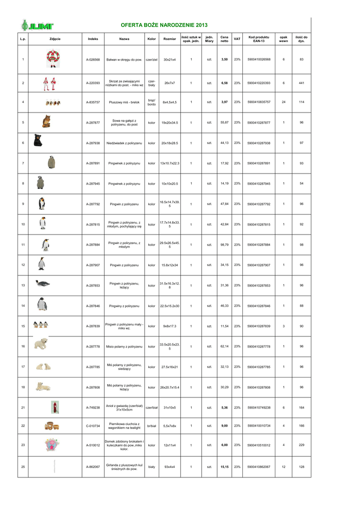 OFERTA BOŻE NARODZENIE 2013 Indeks Nazwa Kolor Rozmiar ilość sztuk w opak. jedn. jedn. Miary Cena netto VAT Kod produktu EAN-13 opak wewn ilość do dys. 1 A-026568 Bałwan w okręgu do pow. czer/ziel 30x21x4 1 szt. 3,50 23% 5900410026568 6 83 2 A-220393 Skrzat ze zwisającymi nóżkami do post. - miks wz czerbiały 26x7x7 1 szt. 6,58 23% 5900410220393 6 441 4 A-835757 Pluszowy miś - brelok brąz/ bordo 8x4,5x4,5 1 szt. 3,97 23% 5900410835757 24 114 5 A-287877 Sowa na gałęzi z poliryzenu, do post kolor 19x20x34.5 1 szt. 55,87 23% 5900410287877 1 96 6 A-287938 Niedźwiadek z poliryzenu kolor 20x18x28.5 1 szt. 44,13 23% 5900410287938 1 97 7 A-287891 Pingwinek z poliryzynu kolor 13x10.7x22.3 1 szt. 17,92 23% 5900410287891 1 93 8 A-287945 Pingwinek z poliryzynu kolor 10x10x20.5 1 szt. 14,19 23% 5900410287945 1 54 9 A-287792 Pingwin z poliryzenu kolor 16.5x14.7x39. 5 1 szt. 47,84 23% 5900410287792 1 96 10 A-287815 Pingwin z poliryzenu, z młodym, pochylający się kolor 17.7x14.8x33. 5 1 szt. 42,84 23% 5900410287815 1 92 11 A-287884 Pingwin z poliryzenu, z młodym kolor 29.5x26.5x45. 5 1 szt. 98,79 23% 5900410287884 1 98 12 A-287907 Pingwin z poliryzenu kolor 15.8x12x34 1 szt. 34,15 23% 5900410287907 1 96 13 A-287853 Pingwin z poliryzenu, leżący kolor 31.5x16.3x12. 8 1 szt. 31,36 23% 5900410287853 1 96 14 A-287846 Pingwiny z poliryzenu kolor 22.5x15.2x30 1 szt. 46,33 23% 5900410287846 1 88 15 A-287839 Pingwin z poliryzenu mały miks wz. kolor 9x8x17.3 1 szt. 11,54 23% 5900410287839 3 90 16 A-287778 Misio polarny z poliryzenu kolor 33.5x20.5x23. 5 1 szt. 62,14 23% 5900410287778 1 96 17 A-287785 Miś polarny z poliryzenu, siedzący kolor 27.5x16x21 1 szt. 32,13 23% 5900410287785 1 96 18 A-287808 Miś polarny z poliryzenu, leżący kolor 26x20.7x15.4 1 szt. 30,29 23% 5900410287808 1 96 21 A-749238 Anioł z gwiazdą (czer/biał) 31x10x5cm czer/biał 31x10x5 1 szt. 5,36 23% 5900410749238 6 164 22 C-010734 Piernikowa ciuchcia z wagonikiem na tealight br/biał 5,5x7x8x 1 szt. 9,00 23% 5900410010734 4 166 23 A-510012 Domek zdobiony brokatem i kuleczkami do pow.,miks kolor. kolor 12x11x4 1 szt. 6,00 23% 5900410510012 4 229 25 A-862067 Girlanda z pluszowych kul śnieżnych do pow. biały 93x4x4 1 szt. 15,15 23% 5900410862067 12 128 L.p. Zdjęcie Indeks Nazwa Kolor Rozmiar ilość sztuk w opak. jedn. jedn. Miary Cena netto VAT Kod produktu EAN-13 opak wewn ilość do dys. 26 K-226555 Harfa dekorowana brokatem do pow. białozł/białosr 12.9x2.5x8.5 1 szt. 3,58 23% 5900410226555 36 572 27 K-862258 Ozdoba w kształcie śnieżynki z frędzlem z akrylu do pow. biały 21x7x1 1 szt. 4,53 23% 5900410862258 24 384 28 K-862272 Ozdoba w kształcie śnieżynki z frędzlem do pow. sr 23x8x1 1 szt. 5,63 23% 5900410862272 24 380 29 A-123076 Kula mała i ozdobna kula z cekinami, koralikami do pow kolor fioletowy 8x8x8 cm fiolet 8x8x8 1 szt. 3,30 23% 5900410123076 12 149 30 A-838307 Bombki bogato dekorowane ziel 8x8x8 1 szt. ziel 8x8x8 1 szt. 1,99 23% 5900410838307 18 84 31 A-448131 Duża bombka ze sznurka do powieszenia, 3 wzory czer,ziel, brąz 10 1 szt. 2,50 23% 5900410448131 12 238 34 A-114876 Prezent opsypany brokatem do pow ziel 6,5x6x3 1 szt. 0,99 23% 5900410114876 24 733 35 A-478602 Pudełko na prezenty - małe czerw 12,5x13x13 1 szt. 9,98 23% 5900410478602 9 225 36 A-478589 Pudełko na prezenty - duże czerw 16x18x18 1 szt. 14,98 5900410478589 8 165 38 A-443693 Papierowa gwiazda do pow. bordo/zie l/brąz 15x15x2 1 szt. 1,60 23% 5900410443693 24 521 40 A-462700 Stożkowa choinka z koralików czer/gran 31x7 1 szt. 6,92 23% 5900410462700 4 243 41 A-835948 Koszyczek z ciemnej wikliny bordo/zie l 17x23x17 1 szt. 3,99 23% 5900410835948 10 262 42 A-835924 1 szt. 3,00 23% 5900410835924 12 189 43 A-550940 Skrzydła do dekoracji róż 15x18 1 szt. 1,00 23% 5900410550940 10 328 45 A-471368 Gwiazdka z dziurką do pow. duża biały 16,5x16,5x2,5 1 szt. 4,90 23% 5900410471368 8 240 46 A-471351 Gwiazdka z dziurką do pow. średnia biały 12,5x12,5x2 1 szt. 3,00 23% 5900410471351 12 138 L.p. Zdjęcie Koszyczek z jasnej wikliny czerw/zie z mikołajem w czapeczce w 16x16,5x8,5 l - mały 47 A-239142 Gwiazdki 18x5,5 cm do pow. biały 15x10x5 18 opak. 8,09 23% 5900410239142 0 60 48 A-239128 Sople do pow. 15cm/8szt. biały 15x10x5 8 opak. 4,79 23% 5900410239128 0 60 5,5x5,5x6,5 4 opak. 4,24 23% 5900410223455 0 78 50 A-223455 Dzwonki ze styropianu dekorowane brokatem do pow. - komplet 4 szt. biały 51 K-829275 Dzwonki oszronione do powieszenia ecru 7 3 opak. 5,76 23% 5900410829275 8 251 52 K-458505 Zestaw 3 dzwonków do powieszenia czerwony 7x7,5 3 opak. 3,99 23% 5900410458505 8 170 53 K-849938 Dzwonki bogato dekorowane zielony 6x5x5 6 opak. 3,99 23% 5900410849938 6 177 54 K-128613 Komplet 3 dzwonków / 2sopli do pow. złoty 8x6,5x6,5 3 opak. 3,99 23% 5900410128613 8 165 Indeks Nazwa Kolor Rozmiar ilość sztuk w opak. jedn. jedn. Miary Cena netto VAT Kod produktu EAN-13 opak wewn ilość do dys. 55 K-564695 Dzwonki z tworzywa bogato dekorowane do pow.8x7,5x7,5 miks 11x18x8 3 opak. 3,66 23% 5900410564695 8 469 56 K-128606 Komplet 3 dzwonków / 2sopli do pow. czer 8x6,5x6,5 3 opak. 3,10 23% 5900410128606 8 268 57 B-466654 Szyszki plastikowe do powieszenia fiolet 6szt fioletowy 8x4 6 opak. 5,52 23% 5900410466654 5 120 58 B-129023 Szyszki do pow. 6szt/8cm sr 9,2x22x3,7 6 opak. 3,89 23% 5900410129023 12 140 60 K-461734 Komplet 4 bombek z frędzlem do pow. czerwony 6x6x6 4 opak. 3,99 23% 5900410461734 6 59 61 K-461611 Komplet 2 bombek dekor. koralikami do pow. brązowy 8x8x8 2 opak. 3,49 23% 5900410461611 8 129 62 K-123878 Komplet 2 bombek dekor. koralikami do pow. kolor 8x8x8 2 opak. 3,49 23% 5900410123878 8 183 63 K-742604 Brokatowa bombka 30mm zł 3 10 opak. 2,30 23% 5900410742604 12 142 64 K-123861 Komplet 2 bączków dekorowanych do pow. kolor 8x8x8 2 opak. 3,49 23% 5900410123861 8 220 65 K-461574 Sople welurowe, dekorowane zielony 12,2*5,2 4 opak. 4,47 23% 5900410461574 8 149 66 B-823518 Bombki plastikowe z "ogonkiem" zł 8
