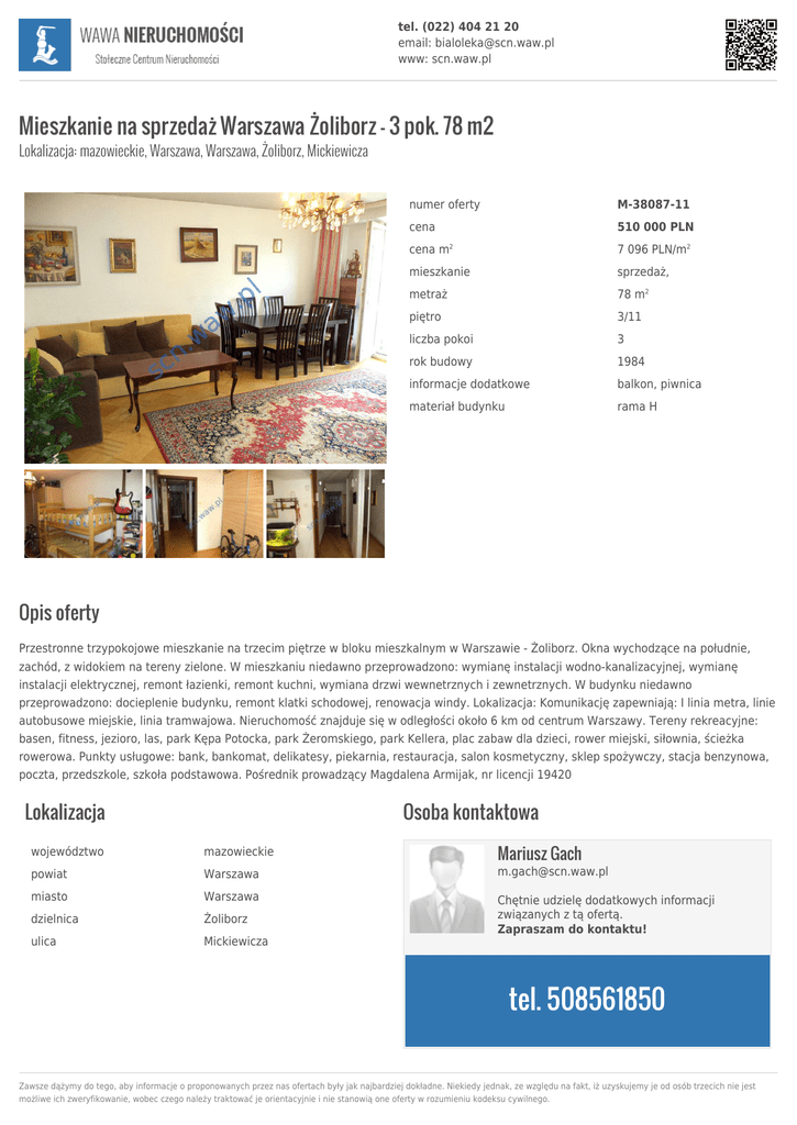 tel. (022) 404 21 20 email: [email protected] www: scn.waw.pl Mieszkanie na sprzedaż Warszawa Żoliborz - 3 pok. 78 m2 Lokalizacja: mazowieckie, Warszawa, Warszawa, Żoliborz, Mickiewicza numer oferty M-38087-11 cena 510 000 PLN cena m 7 096 PLN/m2 mieszkanie sprzedaż, metraż 78 m2 piętro 3/11 liczba pokoi 3 rok budowy 1984 informacje dodatkowe balkon, piwnica materiał budynku rama H 2 Opis oferty Przestronne trzypokojowe mieszkanie na trzecim piętrze w bloku mieszkalnym w Warszawie - Żoliborz. Okna wychodzące na południe, zachód, z widokiem na tereny zielone. W mieszkaniu niedawno przeprowadzono: wymianę instalacji wodno-kanalizacyjnej, wymianę instalacji elektrycznej, remont łazienki, remont kuchni, wymiana drzwi wewnetrznych i zewnetrznych. W budynku niedawno przeprowadzono: docieplenie budynku, remont klatki schodowej, renowacja windy. Lokalizacja: Komunikację zapewniają: I linia metra, linie autobusowe miejskie, linia tramwajowa. Nieruchomość znajduje się w odległości około 6 km od centrum Warszawy. Tereny rekreacyjne: basen, fitness, jezioro, las, park Kępa Potocka, park Żeromskiego, park Kellera, plac zabaw dla dzieci, rower miejski, siłownia, ścieżka rowerowa. Punkty usługowe: bank, bankomat, delikatesy, piekarnia, restauracja, salon kosmetyczny, sklep spożywczy, stacja benzynowa, poczta, przedszkole, szkoła podstawowa. Pośrednik prowadzący Magdalena Armijak, nr licencji 19420 Lokalizacja Osoba kontaktowa Mariusz Gach województwo mazowieckie powiat Warszawa [email protected] miasto Warszawa dzielnica Żoliborz ulica Mickiewicza Chętnie udzielę dodatkowych informacji związanych z tą ofertą. Zapraszam do kontaktu! tel. 508561850 Zawsze dążymy do tego, aby informacje o proponowanych przez nas ofertach były jak najbardziej dokładne. Niekiedy jednak, ze względu na fakt, iż uzyskujemy je od osób trzecich nie jest możliwe ich zweryfikowanie, wobec czego należy traktować je orientacyjnie i nie stanowią one oferty w rozumieniu kodeksu cywilnego.