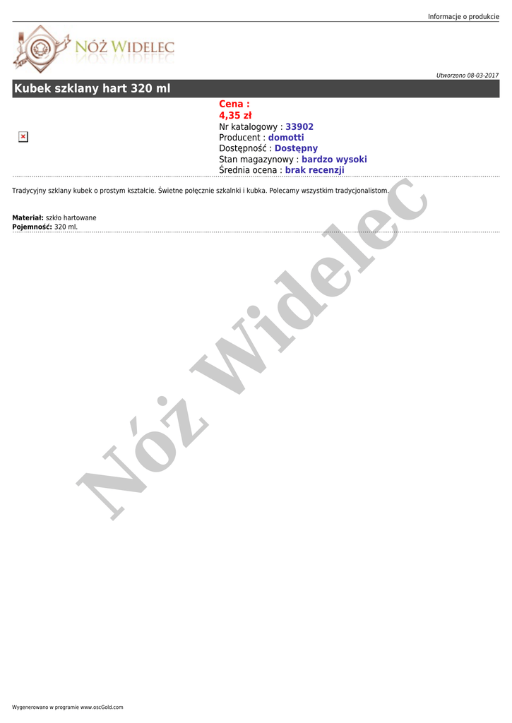 Informacje o produkcie Utworzono 08-03-2017 Kubek szklany hart 320 ml Cena : 4,35 zł Nr katalogowy : 33902 Producent : domotti Dostępność : Dostępny Stan magazynowy : bardzo wysoki Średnia ocena : brak recenzji le c Tradycyjny szklany kubek o prostym kształcie. Świetne połęcznie szkalnki i kubka. Polecamy wszystkim tradycjonalistom. N óż W id e Materiał: szkło hartowane Pojemność: 320 ml. Wygenerowano w programie www.oscGold.com