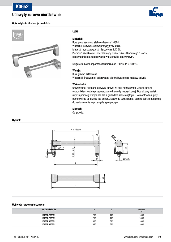 K0652 Uchwyty rurowe nierdzewne Opis artykułu/ilustracje produktu Opis Materiał: Rura połączeniowa, stal nierdzewna 1.4301. Wspornik uchwytu, odlew precyzyjny G 4581. Materiał montażowy, stal nierdzewna 1.4301. Pierścień zaciskowy i uszczelniający z kauczuku silikonowego o jakości odpowiedniej do zastosowania w przemyśle spożywczym. Długoterminowa odporność termiczna od -60 °C do +200 °C. Wersja: Rura gładko szlifowana. Wsporniki śrutowane i polerowane elektrolitycznie na matowy połysk. Wskazówka: Uniwersalne, składane uchwyty rurowe ze stali nierdzewnej. Złącze rury ze wspornikiem jest nieprzepuszczalne dla wody rozpryskowej. Dodatkowy zacisk rury za pomocą wkręta bez łba z gniazdem sześciokątnym. Do montowania przy pomocy śrub od przodu lub od tyłu. Łatwy do czyszczenia, bardzo dobrze nadaje się do zastosowania w przemyśle spożywczym. Montaż: Od przodu. Rysunki Uchwyty rurowe nierdzewne © HEINRICH KIPP WERK KG Nr Zamówienia A L K0652.200301 K0652.250301 K0652.300301 K0652.350301 200 250 300 350 225 275 325 375 Nośność N 1000 1000 1000 1000 www.kipp.com · [email protected] 1/2 K0652 Uchwyty rurowe nierdzewne © HEINRICH KIPP WERK KG Nr Zamówienia A L K0652.400301 K0652.500301 400 500 425 525 Nośność N 1000 1000 www.kipp.com · [email protected] 2/2