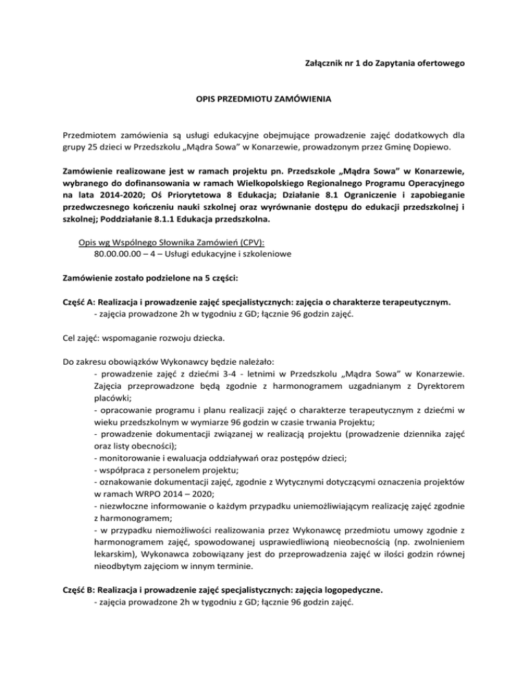 Załącznik nr 1 do Zapytania ofertowego OPIS PRZEDMIOTU ZAMÓWIENIA Przedmiotem zamówienia są usługi edukacyjne obejmujące prowadzenie zajęć dodatkowych dla grupy 25 dzieci w Przedszkolu „Mądra Sowa” w Konarzewie, prowadzonym przez Gminę Dopiewo. Zamówienie realizowane jest w ramach projektu pn. Przedszkole „Mądra Sowa” w Konarzewie, wybranego do dofinansowania w ramach Wielkopolskiego Regionalnego Programu Operacyjnego na lata 2014-2020; Oś Priorytetowa 8 Edukacja; Działanie 8.1 Ograniczenie i zapobieganie przedwczesnego kończeniu nauki szkolnej oraz wyrównanie dostępu do edukacji przedszkolnej i szkolnej; Poddziałanie 8.1.1 Edukacja przedszkolna. Opis wg Wspólnego Słownika Zamówień (CPV): 80.00.00.00 – 4 – Usługi edukacyjne i szkoleniowe Zamówienie zostało podzielone na 5 części: Część A: Realizacja i prowadzenie zajęć specjalistycznych: zajęcia o charakterze terapeutycznym. - zajęcia prowadzone 2h w tygodniu z GD; łącznie 96 godzin zajęć. Cel zajęć: wspomaganie rozwoju dziecka. Do zakresu obowiązków Wykonawcy będzie należało: - prowadzenie zajęć z dziećmi 3-4 - letnimi w Przedszkolu „Mądra Sowa” w Konarzewie. Zajęcia przeprowadzone będą zgodnie z harmonogramem uzgadnianym z Dyrektorem placówki; - opracowanie programu i planu realizacji zajęć o charakterze terapeutycznym z dziećmi w wieku przedszkolnym w wymiarze 96 godzin w czasie trwania Projektu; - prowadzenie dokumentacji związanej w realizacją projektu (prowadzenie dziennika zajęć oraz listy obecności); - monitorowanie i ewaluacja oddziaływań oraz postępów dzieci; - współpraca z personelem projektu; - oznakowanie dokumentacji zajęć, zgodnie z Wytycznymi dotyczącymi oznaczenia projektów w ramach WRPO 2014 – 2020; - niezwłoczne informowanie o każdym przypadku uniemożliwiającym realizację zajęć zgodnie z harmonogramem; - w przypadku niemożliwości realizowania przez Wykonawcę przedmiotu umowy zgodnie z harmonogramem zajęć, spowodowanej usprawiedliwioną nieobecnością (np. zwolnieniem lekarskim), Wykonawca zobowiązany jest do przeprowadzenia zajęć w ilości godzin równej nieodbytym zajęciom w innym terminie. Część B: Realizacja i prowadzenie zajęć specjalistycznych: zajęcia logopedyczne. - zajęcia prowadzone 2h w tygodniu z GD; łącznie 96 godzin zajęć. Cel zajęć: stymulowanie prawidłowego rozwoju mowy, kształtowanie prawidłowej mowy, zapobieganie wad wymowy, korygowanie wad wymowy. Do zakresu obowiązków Wykonawcy będzie należało: - prowadzenie zajęć logopedycznych z dziećmi 3-4 - letnimi w Przedszkolu „Mądra Sowa” w Konarzewie. Zajęcia przeprowadzone będą zgodnie z harmonogramem uzgadnianym z Dyrektorem placówki; - opracowanie programu i planu realizacji zajęć logopedycznych z dziećmi w wieku przedszkolnym w wymiarze 96 godzin w czasie trwania Projektu; - przeprowadzenie diagnozy logopedycznej dzieci, obejmującej przeprowadzenie badań i sporządzenie opinii oraz omówienie treści z rodzicami/opiekunami prawnymi; - prowadzenie dokumentacji związanej w realizacją projektu (prowadzenie dziennika zajęć oraz listy obecności); - monitorowanie i ewaluacja oddziaływań oraz postępów dzieci; - współpraca z personelem projektu; - oznakowanie dokumentacji zajęć, zgodnie z Wytycznymi dotyczącymi oznaczenia projektów w ramach WRPO 2014 – 2020; - niezwłoczne informowanie o każdym przypadku uniemożliwiającym realizację zajęć zgodnie z harmonogramem; - w przypadku niemożliwości realizowania przez Wykonawcę przedmiotu umowy zgodnie z harmonogramem zajęć, spowodowanej usprawiedliwioną nieobecnością (np. zwolnieniem lekarskim), Wykonawca zobowiązany jest do przeprowadzenia zajęć w ilości godzin równej nieodbytym zajęciom w innym terminie. Część C: Realizacja i prowadzenie zajęć specjalistycznych: zajęcia z psychologiem. - zajęcia prowadzone 2h w tygodniu z GD; łącznie 96 godzin zajęć. Cel zajęć: wspieranie rozwoju społeczno-emocjonalnego i poznawczego dziecka. Do zakresu obowiązków Wykonawcy będzie należało: - prowadzenie zajęć z dziećmi 3-4 - letnimi w Przedszkolu „Mądra Sowa” w Konarzewie. Zajęcia przeprowadzone będą zgodnie z harmonogramem uzgadnianym z Dyrektorem placówki; - opracowanie programu i planu realizacji zajęć z dziećmi w wieku przedszkolnym w wymiarze 96 godzin w czasie trwania Projektu; - prowadzenie dokumentacji związanej w realizacją projektu (prowadzenie dziennika zajęć oraz listy obecności); - monitorowanie i ewaluacja oddziaływań oraz postępów dzieci; - współpraca z personelem projektu; - oznakowanie dokumentacji zajęć, zgodnie z Wytycznymi dotyczącymi oznaczenia projektów w ramach WRPO 2014 – 2020; - niezwłoczne informowanie o każdym przypadku uniemożliwiającym realizację zajęć zgodnie z harmonogramem; - w przypadku niemożliwości realizowania przez Wykonawcę przedmiotu umowy zgodnie z harmonogramem zajęć, spowodowanej usprawiedliwioną nieobecnością (np. zwolnieniem lekarskim), Wykonawca zobowiązany jest do przeprowadzenia zajęć w ilości godzin równej nieodbytym zajęciom w innym terminie. Część D: Realizacja i prowadzenie zajęć rozwijających kompetencje społeczno-emocjonalne: zajęcia z rytmiki. - zajęcia prowadzone 1h w tygodniu z GD; łącznie 48 godzin zajęć. Cel zajęć: zajęcia umuzykalniające i stymulujące rozwój psychoruchowy dziecka; kształtowanie różnych umiejętności, sprawności, postaw i nawyków. Do zakresu obowiązków Wykonawcy będzie należało: - prowadzenie zajęć z rytmiki z dziećmi 3-4 - letnimi w Przedszkolu „Mądra Sowa” w Konarzewie. Zajęcia przeprowadzone będą zgodnie z harmonogramem uzgadnianym z Dyrektorem placówki; - opracowanie programu i planu realizacji zajęć z dziećmi w wieku przedszkolnym w wymiarze 48 godzin w czasie trwania Projektu; - prowadzenie dokumentacji związanej w realizacją projektu (prowadzenie dziennika za