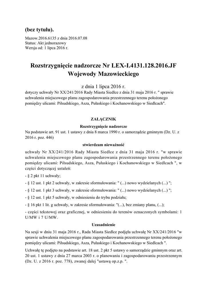 (bez tytułu). Mazow.2016.6135 z dnia 2016.07.08 Status: Akt jednorazowy Wersja od: 1 lipca 2016 r. Rozstrzygnięcie nadzorcze Nr LEX-I.4131.128.2016.JF Wojewody Mazowieckiego z dnia 1 lipca 2016 r. dotyczy uchwały Nr XX/241/2016 Rady Miasta Siedlce z dnia 31 maja 2016 r. " sprawie uchwalenia miejscowego planu zagospodarowania przestrzennego terenu położonego pomiędzy ulicami: Piłsudskiego, Asza, Pułaskiego i Kochanowskiego w Siedlcach". ZAŁĄCZNIK Rozstrzygnięcie nadzorcze Na podstawie art. 91 ust. 1 ustawy z dnia 8 marca 1990 r. o samorządzie gminnym (Dz. U. z 2016 r. poz. 446) stwierdzam nieważność uchwały Nr XX/241/2016 Rady Miasta Siedlce z dnia 31 maja 2016 r. "w sprawie uchwalenia miejscowego planu zagospodarowania przestrzennego terenu położonego pomiędzy ulicami: Piłsudskiego, Asza, Pułaskiego i Kochanowskiego w Siedlcach ", w części dotyczącej ustaleń: - § 2 pkt 11 uchwały; - § 12 ust. 1 pkt 2 uchwały, w zakresie sformułowania: " (...) nowo wydzielanych (...) "; - § 12 ust. 1 pkt 3 uchwały, w zakresie sformułowania: " (...) nowo wydzielanych (...) "; - § 12 ust. 1 pkt 5 uchwały, w odniesieniu do trybu podziału; - § 16 pkt 1 lit. g uchwały, w zakresie sformułowania: "(...), bez zmiany planu, (...); - części tekstowej oraz graficznej, w odniesieniu do terenów oznaczonych symbolami: 1 U/MW i 7 U/MW. Uzasadnienie Na sesji w dniu 31 maja 2016 r., Rada Miasta Siedlce podjęła uchwałę Nr XX/241/2016 "w sprawie uchwalenia miejscowego planu zagospodarowania przestrzennego terenu położonego pomiędzy ulicami: Piłsudskiego, Asza, Pułaskiego i Kochanowskiego w Siedlcach ". Uchwałę tę podjęto na podstawie art. 18 ust. 2 pkt 5 ustawy o samorządzie gminnym oraz art. 20 ust. 1 ustawy z dnia 27 marca 2003 r. o planowaniu i zagospodarowaniu przestrzennym (Dz. U. z 2016 r. poz. 778), zwanej dalej "ustawą op.z.p. ". Stosownie do zapisów art. 14 ust. 8 ustawy o p.z.p., miejscowy plan zagospodarowania przestrzennego jest aktem prawa miejscowego uchwalanym przez organ stanowiący gminy, tj. radę gminy. Artykuł 94 Konstytucji RP stanowi, iż organy samorządu terytorialnego oraz terenowe organy administracji rządowej, na podstawie i w granicach upoważnień zawartych w ustawie, ustanawiają akty prawa miejscowego obowiązujące na obszarze działania tych organów, a zasady i tryb wydawania aktów prawa miejscowego określa ustawa. W przypadku aktów prawa miejscowego z zakresu planowania przestrzennego, tj. w odniesieniu do miejscowych planów zagospodarowania przestrzennego, regulację zasad i trybu ich sporządzania określa ustawa o p.z.p. Z dyspozycji art. 3 ust. 1 ustawy o p.z.p., wynika, że kształtowanie i prowadzenie polityki przestrzennej na terenie gminy, w tym uchwalanie studium uwarunkowań i kierunków zagospodarowania przestrzennego gminy oraz miejscowych planów zagospodarowania przestrzennego należy do zadań własnych gminy. Biorąc pod uwagę powyższe oraz mając na uwadze dyspozycję art. 20 ust. 2 ustawy o p.z.p., kontrola organu nadzoru w tym przedmiocie nie dotyczy celowości czy słuszności dokonywanych w miejscowym planie zagospodarowania przestrzennego rozstrzygnięć, lecz ogranicza się jedynie do badania zgodności z prawem podejmowanych uchwał, a zwłaszcza przestrzegania zasad planowania przestrzennego oraz, określonej ustawą, procedury planistycznej. Zgodnie z treścią art. 28 ust. 1 ustawy o p.z.p., podstawę do stwierdzenia nieważności uchwały rady gminy w całości lub w części stanowi istotne naruszenie zasad sporządzania planu miejscowego, istotne naruszenie trybu jego sporządzania, a także naruszenie właściwości organów w tym zakresie. Zasady sporządzania aktu planistycznego dotyczą problematyki merytorycznej, która związana jest ze sporządzeniem aktu planistycznego, a więc jego zawartością (część tekstowa, graficzna). Zawartość aktu planistycznego określona została w art. 15 ustawy o p.z.p. Z kolei tryb uchwalenia planu, określony w art. 17 ustawy o p.z.p., odnosi się do kolejno podejmowanych czynności planistycznych, określonych przepisami ustawy, gwarantujących możliwość udziału zainteresowanych podmiotów w procesie planowania (poprzez składanie wniosków i uwag) i pośrednio do kontroli legalności przyjmowanych rozwiązań w granicach uzyskiwanych opinii i uzgodnień. Organ nadzoru zobowiązany jest do badania zgodności uchwały ze stanem prawnym obowiązującym w dacie podjęcia przez radę gminy uchwały i w przypadku stwierdzenia naruszenia prawa, do podjęcia interwencji, stosownej do posiadanych kompetencji w tym zakresie. Na wstępie wskazać należy, że zakres przedmiotowy władztwa planistycznego gminy w ramach, którego ma ona możliwość wpływu na sposób wykonywania prawa własności, przez właścicieli i użytkowników terenów objętych ustaleniami planu miejscowego, nie jest nieograniczony i został szczegółowo określony w ustawie o p.z.p. poprzez wskazanie obowiązkowej i fakultatywnej (dopuszczalnej) treści planu miejscowego (art. 15 ust. 2 i 3) oraz w rozporządzeniu Ministra Infrastruktury z dnia 26 sierpnia 2003 r. w sprawie wymaganego zakresu projektu miejscowego planu zagospodarowania przestrzennego (Dz. U. Nr 164, poz. 1587), w szczególności zaś w jego ustaleniach zawartych w § 3, 4 i 7. Oznacza to, że nie każde rozstrzygnięcie związane swobodnie z przeznaczeniem, zagospodarowaniem i użytkowaniem terenu może być włączone do ustaleń planu, a jedynie takie, które mieści się ściśle w ramach tego, co ustawa określa ogólnie, jako ustalenie przeznaczenia terenu, rozmieszczenia inwestycji celu publicznego i określenie sposobów zagospodarowania i warunków zabudowy terenu, a konkretnie wylicza w art. 15, natomiast ww. rozporządzenie doszczegóławia, jako nakazy, zakazy, dopuszczenia i ograniczenia w zagospodarowaniu terenów, określone w § 4 tego rozporządzenia. W szczególności, wobec zasady hierarchicznoś