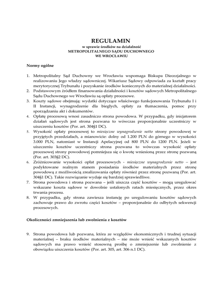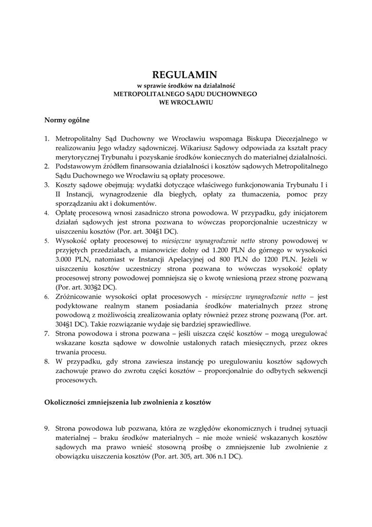 REGULAMIN w sprawie środków na działalność METROPOLITALNEGO SĄDU DUCHOWNEGO WE WROCŁAWIU Normy ogólne 1. Metropolitalny Sąd Duchowny we Wrocławiu wspomaga Biskupa Diecezjalnego w realizowaniu Jego władzy sądowniczej. Wikariusz Sądowy odpowiada za kształt pracy merytorycznej Trybunału i pozyskanie środków koniecznych do materialnej działalności. 2. Podstawowym źródłem finansowania działalności i kosztów sądowych Metropolitalnego Sądu Duchownego we Wrocławiu są opłaty procesowe. 3. Koszty sądowe obejmują: wydatki dotyczące właściwego funkcjonowania Trybunału I i II Instancji, wynagrodzenie dla biegłych, opłaty za tłumaczenia, pomoc przy sporządzaniu akt i dokumentów. 4. Opłatę procesową wnosi zasadniczo strona powodowa. W przypadku, gdy inicjatorem działań sądowych jest strona pozwana to wówczas proporcjonalnie uczestniczy w uiszczeniu kosztów (Por. art. 304§1 DC). 5. Wysokość opłaty procesowej to miesięczne wynagrodzenie netto strony powodowej w przyjętych przedziałach, a mianowicie: dolny od 1.200 PLN do górnego w wysokości 3.000 PLN, natomiast w Instancji Apelacyjnej od 800 PLN do 1200 PLN. Jeżeli w uiszczeniu kosztów uczestniczy strona pozwana to wówczas wysokość opłaty procesowej strony powodowej pomniejsza się o kwotę wniesioną przez stronę pozwaną (Por. art. 303§2 DC). 6. Zróżnicowanie wysokości opłat procesowych - miesięczne wynagrodzenie netto – jest podyktowane realnym stanem posiadania środków materialnych przez stronę powodową z możliwością zrealizowania opłaty również przez stronę pozwaną (Por. art. 304§1 DC). Takie rozwiązanie wydaje się bardziej sprawiedliwe. 7. Strona powodowa i strona pozwana – jeśli uiszcza część kosztów – mogą uregulować wskazane koszta sądowe w dowolnie ustalonych ratach miesięcznych, przez okres trwania procesu. 8. W przypadku, gdy strona zawiesza instancję po uregulowaniu kosztów sądowych zachowuje prawo do zwrotu części kosztów – proporcjonalnie do odbytych sekwencji procesowych. Okoliczności zmniejszenia lub zwolnienia z kosztów 9. Strona powodowa lub pozwana, która ze względów ekonomicznych i trudnej sytuacji materialnej – braku środków materialnych – nie może wnieść wskazanych kosztów sądowych ma prawo wnieść stosowną prośbę o zmniejszenie lub zwolnienie z obowiązku uiszczenia kosztów (Por. art. 305, art. 306 n.1 DC). 10. Decyzję w tej sprawie podejmuje Wikariusz Sądowy, po zbadaniu stanu ubóstwa strony wnoszącej prośbę o zmniejszenie lub zwolnienie z kosztów sądowych (Por. art. 306 n.3 DC). 11. Wikariusz Sądowy prosi Proboszcza miejsca zamieszkania zainteresowanych stron o pisemne potwierdzenie stanu ubóstwa strony wnoszącej prośbę o zmniejszenie lub zwolnienie z kosztów sądowych. 12. Decyzję o zmniejszeniu kosztów sądowych lub o zwolnieniu odnotowuje się w wyroku (Por. art. 304§1 DC). 13. Należy się zatroszczyć, aby nikt z racji swego ubóstwa lub braku środków materialnych na pokrycie kosztów sądowych nie był pozbawiony pomocy sądowej Metropolitalnego Sądu Duchownego we Wrocławiu. 14. Należności pieniężne, jakie wynikają z decyzji o zmniejszeniu lub zwolnieniu z kosztów sądowych w całości pokrywa się z kasy Metropolitalnego Sądu Duchownego we Wrocławiu. 15. Honoraria dla adwokatów uczestniczących w postępowaniu na skutek zlecenia strony uiszcza strona procesowa, która wydała zlecenie. Postanowienie: Powyższe normy Regulaminu w sprawie środków na działalność Metropolitalnego Sądu Duchownego we Wrocławiu obowiązują od dnia zatwierdzenia. Zatwierdzam – Wrocław w dniu 12 października 2012 roku + Marian Gołębiewski Arcybiskup Metropolita Wrocławski --------------------------------Do wiadomości: Metropolitalny Sąd Duchowny we Wrocławiu. 2