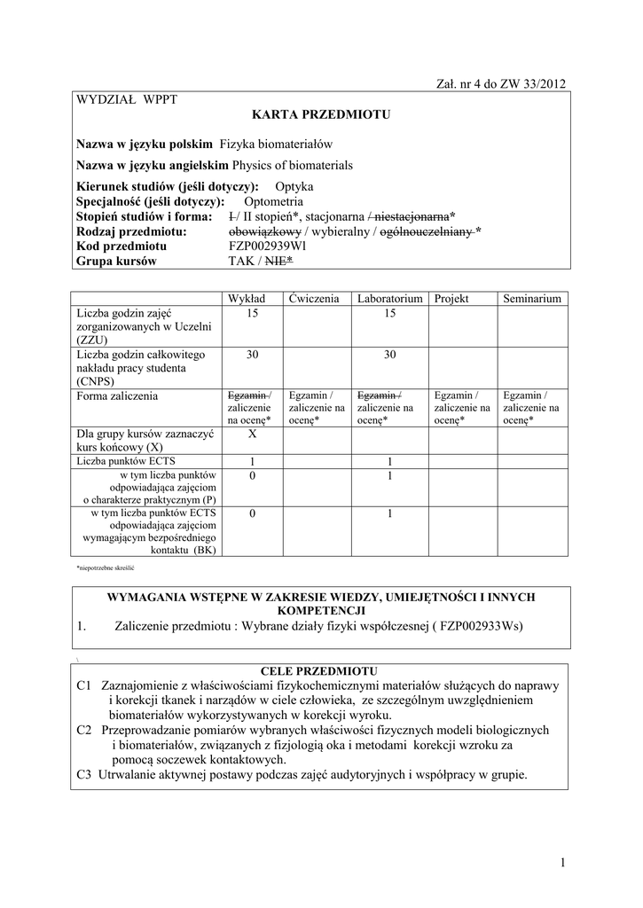 Zał. nr 4 do ZW 33/2012 WYDZIAŁ WPPT KARTA PRZEDMIOTU Nazwa w języku polskim Fizyka biomateriałów Nazwa w języku angielskim Physics of biomaterials Kierunek studiów (jeśli dotyczy): Optyka Specjalność (jeśli dotyczy): Optometria Stopień studiów i forma: I / II stopień*, stacjonarna / niestacjonarna* Rodzaj przedmiotu: obowiązkowy / wybieralny / ogólnouczelniany * Kod przedmiotu FZP002939Wl Grupa kursów TAK / NIE* Liczba godzin zajęć zorganizowanych w Uczelni (ZZU) Liczba godzin całkowitego nakładu pracy studenta (CNPS) Forma zaliczenia Wykład 15 Ćwiczenia Laboratorium Projekt 15 30 Seminarium 30 Egzamin / zaliczenie na ocenę* Egzamin / zaliczenie na ocenę* Egzamin / zaliczenie na ocenę* Dla grupy kursów zaznaczyć kurs końcowy (X) X Liczba punktów ECTS w tym liczba punktów odpowiadająca zajęciom o charakterze praktycznym (P) w tym liczba punktów ECTS odpowiadająca zajęciom wymagającym bezpośredniego kontaktu (BK) 1 0 1 1 0 1 Egzamin / zaliczenie na ocenę* Egzamin / zaliczenie na ocenę* *niepotrzebne skreślić WYMAGANIA WSTĘPNE W ZAKRESIE WIEDZY, UMIEJĘTNOŚCI I INNYCH KOMPETENCJI 1. Zaliczenie przedmiotu : Wybrane działy fizyki współczesnej ( FZP002933Ws) \ CELE PRZEDMIOTU C1 Zaznajomienie z właściwościami fizykochemicznymi materiałów służących do naprawy i korekcji tkanek i narządów w ciele człowieka, ze szczególnym uwzględnieniem biomateriałów wykorzystywanych w korekcji wyroku. C2 Przeprowadzanie pomiarów wybranych właściwości fizycznych modeli biologicznych i biomateriałów, związanych z fizjologią oka i metodami korekcji wzroku za pomocą soczewek kontaktowych. C3 Utrwalanie aktywnej postawy podczas zajęć audytoryjnych i współpracy w grupie. 1 PRZEDMIOTOWE EFEKTY KSZTAŁCENIA Z zakresu wiedzy: PEK_W01 Wskazuje perspektywy rozwoju biomateriałów. PEK_W02 Klasyfikuje biomateriały. PEK_W03 Charakteryzuje biomateriały stosowane w korekcji wzroku. Z zakresu umiejętności: PEK_U01 Przeprowadza pomiary właściwości fizycznych biomateriałów. PEK_U02 Analizuje i interpretuje wyniki pomiarów. Z zakresu kompetencji społecznych: PEK_K01 Współpracuje w grupie. PEK_K02 Postępuje z godnie z zasadami BHP. PEK_K03 Wykazuje aktywną postawę podczas zajęć audytoryjnych. TREŚCI PROGRAMOWE Wy1 Wy2 Wy3 Wy4 Wy5 Wy6 Wy7 Wy8 Forma zajęć - wykład Perspektywy rozwoju biomateriałów a)transplantacje b)implantacje c)regeneracja tkanek Podział biomateriałów i wymagania stawiane biomateriałom Biomateriały stosowane w układzie kostnym człowieka a) metale b) bioceramiki c) materiały bioaktywne Biomedyczne zastosowania polimerów Kompozyty w medycynie Materiały stosowane w korekcji wzroku -szkła (właściwości, wytwarzanie, barwienie) - materiały wytwarzane metodą zol-żel - soczewki kontaktowe -biomedyczne hydrożele Procesy adsorpcji bakterii i sterylizacja biomateriałów Test. Suma godzin Liczba godzin 2 1 2 2 1 5 1 1 15 Forma zajęć - ćwiczenia Liczba godzin Forma zajęć - laboratorium Liczba godzin Ćw1 Suma godzin La1 La2 Formowanie i badanie właściwości cienkich warstw lipidowych. Określanie ładunku powierzchniowego komórek i biomateriałów. poprzez pomiar ruchliwości elektroforetycznej. 3 3 2 La3 La4 La5 Określanie zwilżalności biomateriałów i soczewek kontaktowych poprzez pomiar kąta zwilżania. Analiza rozmiarów mikroporów w biomateriałach i soczewkach kontaktowych. 3 Badanie widm absorpcyjnych barwionych szkieł okularowych. 3 Suma godzin 15 Forma zajęć - projekt 3 Liczba godzin Pr1 Pr2 Pr3 Pr4 … Suma godzin Forma zajęć - seminarium Liczba godzin Se1 Se2 Se3 … Suma godzin STOSOWANE NARZĘDZIA DYDAKTYCZNE N1. Prezentacja multimedialna N2. Wykład N3. Samodzielne pomiary wielkości fizycznych N4. Samodzielne opracowywanie wyników pomiarów przy pomocy programów do obliczeń i analizy statystycznej obrazów. OCENA OSIĄGNIĘCIA PRZEDMIOTOWYCH EFEKTÓW KSZTAŁCENIA Oceny (F – formująca (w trakcie semestru), P – podsumowująca (na koniec semestru) F1 Numer efektu kształcenia Sposób oceny osiągnięcia efektu kształcenia PEK_U02 Ocena sprawozdania pisemnego z wykonanego ćwiczenia laboratoryjnego. P Kolokwium pisemne obejmujące zakres materiału wykładu i ćwiczeń laboratoryjnych. 3 LITERATURA PODSTAWOWA I UZUPEŁNIAJĄCA LITERATURA PODSTAWOWA: [1] S. Błażewicz, L.Stoch, Biomateriały, Akademicka Oficyna Exit, W-wa, 2003 [2] J. Marciniak, Biomateriały, Wyd. Politechniki Ślaskiej, Gliwice, 2002 LITERATURA UZUPEŁNIAJĄCA: [3] L.L. Hench, J.R.Jones, Biomaterials, artificial organs and tissue engineering, Woodhead Publishing Limited, Cambridge, England, 2005. [4] D. Shi, Biomaterials and Tissue Engineering, Springer, 2005. [5] J. Łaskawiec, R. Michalik, Zagadnienia teoretyczne i aplikacyjne w implantach, Wyd. Politechniki Ślaskiej, Gliwice,2002. [6] H. Leda, Kompozyty polimerowe z włóknami ciągłymi, Wyd. Polit. Poznańskiej, 2006 [7] B. Tighe, Contact lens materials. w: Philips A., Speedwell L., eds. Contact lenses. Edinburgh; Butterworth-Heinemann, 2006, 59-78. [8] E. Bennett, V.A. Henry, Clinical manual of contact lenses, Philadelphia; Wolters Kluwer, Lippincott Williams&Wilkins, 2009 [9] H.A. Stein et al., Contact Lenses. Fundamental and clinical use, Slack Incorporated 1997, NJ. OPIEKUN PRZEDMIOTU (IMIĘ, NAZWISKO, ADRES E-MAIL) dr inż. Anna Wróbel, [email protected] doc Stanisława Szarska, [email protected] 4 MACIERZ POWIĄZANIA EFEKTÓW KSZTAŁCENIA DLA PRZEDMIOTU Fizyka biomateriałów Z EFEKTAMI KSZTAŁCENIA NA KIERUNKU Optyka I SPECJALNOŚCI Optometria Cele przedmiotu*** Treści programowe*** Numer narzędzia dydaktycznego*** K2OPT_W09_OPM C1 Wy1, Wy7 N1, N2 K2OPT_W06 K2OPT_W13_OPM C1 C1 Wy2 – W5 Wy6 N1, N2 N1, N2 PEK_U01 K2OPT_U03 (umiejętności) PEK_U02 K2OPT_U03 C2 La1 – La5 N3, N4 C2 La1 – La5 N3, N4 K2OPT_K03 C3 N2, N3 PEK_K02 K2OPT_K03 C3 PEK_K03 K2OPT_K07 C3 Wy1 – Wy7 La1 – La5 Wy1 – Wy7 La1 – La5 Wy1 – Wy7 La1 – La5 Przed