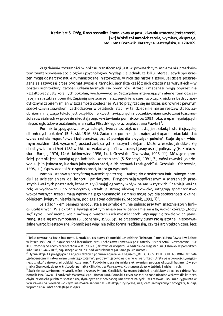 Kazimierz S. Ożóg, Rzeczpospolita Pomnikowa w poszukiwaniu utraconej tożsamości, [w:] Wokół tożsamości: teorie, wymiary, ekspresje, red. Irena Borowik, Katarzyna Leszczyńska, s. 179-189. Zagadnienie tożsamości w obliczu transformacji jest w powszechnym mniemaniu przedmiotem zainteresowania socjologów i psychologów. Wydaje się jednak, że kilku interesujących spostrzeżeń mogą dostarczyć nauki humanistyczne, historyczne, w nich zaś historia sztuki. Jej dzieła postrzegane są zazwyczaj przez pryzmat swojej elitarności, jednakże część z nich otacza nas wszystkich – w postaci architektury, założeń urbanistycznych czy pomników. Artyści i mecenasi mogą poprzez nie kształtować gusty kolejnych pokoleń, wychowywać je. Szczególnie interesującym elementem otaczającej nas sztuki są pomniki. Zapisują one zdarzenia szczególnie ważne, tworząc krajobraz będący specyficznym zapisem zmian w tożsamości społecznej. Warto przyjrzeć się im bliżej, jak również pewnym specyficznym zjawiskom, zachodzącym w ostatnich latach w tej dziedzinie naszej rzeczywistości. Zadaniem niniejszego tekstu jest przybliżenie kwestii związanych z poszukiwaniem społecznej tożsamości zauważalnych w procesie nieustającego wystawiania pomników po 1989 roku, a upamiętniających niepodległościowe podziemie, marszałka Piłsudskiego oraz papieża Jana Pawła II1. Pomnik to „poglądowa lekcja estetyki, tworzy też piękno miasta, jest szkołą historii ojczystej dla młodych pokoleń” (B. Śląski, 1916, 53). Zadaniem pomnika jest najczęściej upamiętniać fakt, dać wyraz czci dla męczeństwa i bohaterstwa, ocalać pamięć dla przyszłych pokoleń. Staje się on widomym znakiem idei, wydarzeń, postaci związanych z naszymi dziejami. Może wreszcie, jak działo się choćby w latach 1944-1989 w PRL - utrwalać w sposób widoczny i jasny ustrój polityczny (H. Kotkowska – Bareja, 1974, 14; A. Jakimowicz, 1956, 14, I. Grzesiuk - Olszewska, 1995, 11). Mówiąc najprościej, pomnik jest „pamiątką po ludziach i zdarzeniach” (S. Stopczyk, 1991, 3), mówi również „o człowieku jako jednostce, ludziach jako społeczności, o ich czynach i zasługach” (I. Grzesiuk – Olszewska, 1995, 11). Opowiada także o społeczności, która go wystawia. Pomniki stanowią specyficzną wartość społeczną – należą do dziedzictwa kulturalnego narodu i są ucieleśnieniem idei honoru i patriotyzmu. Przypominają współczesnym o zdarzeniach przeszłych i ważnych postaciach, które miały (i mają) ogromny wpływ na nas wszystkich. Spełniają ważną rolę w wychowaniu do patriotyzmu, kształtują stronę ideową człowieka, integrują społeczeństwo wokół ważnych treści i mają wpływ na jego tożsamość. Pomniki mogą być dla społeczności lokalnej obiektem świętym, nietykalnym, podlegającym ochronie (S. Stopczyk, 1991, 7)2. Są składnikiem pamięci narodu, stają się symbolem, nie pełniąc przy tym znaczniejszych funkcji utylitarnych. Wielokrotnie bywają istotnym miejscem w panoramie miasta, wokół którego „toczy się” życie. Choć nieme, wiele mówią o miastach i ich mieszkańcach. Wpisując się trwale w ich panoramę, stają się ich symbolami (B. Sochański, 1998, 5)3. Te przedmioty dumy niosą istotne i niepodważalne wartości estetyczne. Pomnik jest więc nie tylko formą rzeźbiarską, czy też architektoniczną, lecz 1 Tekst powstał na bazie fragmentu I. rozdziału rozprawy doktorskiej „Miedziany Pielgrzym. Pomniki Jana Pawła II w Polsce w latach 1980-2005” napisanej pod kierunkiem prof. Lechosława Lameńskiego z Katedry Historii Sztuki Nowoczesnej IHSz KUL, złożonej do oceny recenzentom w VII 2005 r. (jak również w oparciu o badania do magisterium „Człowiek w pomnikach lubelskich 1944-2001”, napisanego w 2002 r. pod kierunkiem tegoż samego Promotora). 2 Słynna akcja AK polegająca na zdjęciu tablicy z pomnika Kopernika z napisem „DER GROSSE DEUTSCHE ASTRONOM” była „jednoznacznym ratowaniem „świętego totemu”, podtrzymującego na duchu w warunkach utraty państwowości „magicznego znaku” zniewolonej polskiej tożsamości”. Podobnie rzecz się miała z ukrywaniem podczas okupacji fragmentów pomnika Grunwaldzkiego w Krakowie, pomnika Kilińskiego w Warszawie, Kochanowskiego w Lublinie i wielu innych. 3 Stają się też symbolem instytucji, które je wystawiły (por. Katolicki Uniwersytet Lubelski i znajdujący się na jego dziedzińcu pomnik Jana Pawła II i Kardynała Wyszyńskiego - Homagium). Pomniki o czym nie można zapominać są ważnym dla każdego chyba człowieka punktem spotkań (najsłynniejsze to z pewnością Mickiewicz na rynku w Krakowie i kolumna Zygmunta w Warszawie). Są wreszcie - o czym nie można zapominać - atrakcją turystyczną, miejscem pamiątkowych fotografii, budują wspomnienia i obraz odległego miejsca. jednocześnie „działaniem na poziomie wyższym – organizującym dusze ludzkie wokół treści ideowych” (Z. Strzałkowski, 1971). Niezwykle pięknie o istocie pomnika pisał ponad 100 lat temu Ignacy Matuszewski: „Pomnik przewyższa inne symbole żywotnością i logiką, gdyż nie jest symbolem dowolnym, lecz symbolem naturalnym, tkwiącym korzeniami w gruncie rzeczywistości. Pomnik krystalizuje w sposób widoczny idee zrodzone w duszy człowieka, który wcielił w siebie pewne dążenia i uczucia całej masy jednostek. (...) [Pomnik powinien być] syntezą doprowadzoną do granic lakoniczności i odzianą w kształty dotykalne, a wskutek tego przemawiającą do uczuć poprzez pośrednictwo zmysłów, tj. w sposób najpewniejszy, a zarazem najdostępniejszy dla szerokich kół społecznych” (I. Matuszewski, 1898). To ogniskowanie powszechnej świadomości, nadziei, radości, podniosłych uczuć odbywa się również w sytuacjach tworzenia lub braku pomnika. Często twórca lub zamawiający, są przekonani o niezwykłości tworzonego dzieła, zawierania 