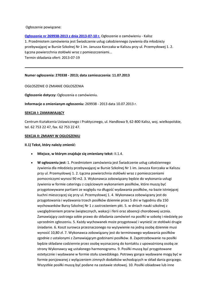 Ogłoszenie powiązane: Ogłoszenie nr 269938-2013 z dnia 2013-07-10 r. Ogłoszenie o zamówieniu - Kalisz 1. Przedmiotem zamówienia jest Świadczenie usług całodziennego żywienia dla młodzieży przebywającej w Bursie Szkolnej Nr 1 im. Janusza Korczaka w Kaliszu przy ul. Przemysłowej 1. 2. Łączna powierzchnia stołówki wraz z pomieszczeniami... Termin składania ofert: 2013-07-19 Numer ogłoszenia: 270338 - 2013; data zamieszczenia: 11.07.2013 OGŁOSZENIE O ZMIANIE OGŁOSZENIA Ogłoszenie dotyczy: Ogłoszenia o zamówieniu. Informacje o zmienianym ogłoszeniu: 269938 - 2013 data 10.07.2013 r. SEKCJA I: ZAMAWIAJĄCY Centrum Kształcenia Ustawicznego i Praktycznego, ul. Handlowa 9, 62-800 Kalisz, woj. wielkopolskie, tel. 62 753 22 47, fax. 62 753 22 47. SEKCJA II: ZMIANY W OGŁOSZENIU II.1) Tekst, który należy zmienić: Miejsce, w którym znajduje się zmieniany tekst: II.1.4. W ogłoszeniu jest: 1. Przedmiotem zamówienia jest Świadczenie usług całodziennego żywienia dla młodzieży przebywającej w Bursie Szkolnej Nr 1 im. Janusza Korczaka w Kaliszu przy ul. Przemysłowej 1. 2. Łączna powierzchnia stołówki wraz z pomieszczeniami pomocniczymi wynosi 90 m2. 3. Wykonawca zobowiązany będzie do wykonania usługi żywienia w formie cateringu z częściowym wykonaniem posiłków, które muszą być przygotowywane partiami ze względu na długość wydawania posiłków, na bazie istniejącej kuchni mieszczącej się przy ul. Przemysłowej 1. 4. Wykonawca zobowiązany jest do przygotowania i wydawania trzech posiłków dziennie przez 5 dni w tygodniu dla 150 wychowanków Bursy Szkolnej Nr 1 z zastrzeżeniem pkt. 5. w dniach nauki szkolnej z uwzględnieniem przerw świątecznych, wakacji i ferii oraz absencji chorobowej ucznia. Zamawiający zastrzega sobie prawo do składania zamówień na posiłki w sobotę i niedzielę po uprzednim zgłoszeniu. 5. Każdy wychowanek może przygotować i wynieść ze stołówki drugie śniadanie. 6. Koszt surowca przeznaczonego na wyżywienie na jedną osobę dziennie musi wynosić 10,80 zł. 7. Wykonawca zobowiązany jest do terminowego wydawania posiłków zgodnie z ustalonymi z Zamawiającym godzinami posiłków. 8. Zapotrzebowanie na posiłki będzie składane codziennie przez osobę wyznaczoną do kontaktu z upoważnioną osobą ze strony Wykonawcy wg ustalonego harmonogramu. 9. Posiłki muszą być przygotowane estetycznie i wydawane w formie stołu szwedzkiego. Potrawy gorące wydawane mogą być w formie porcjowanej z wyłączeniem zimnych dodatków wchodzących w skład dania gorącego. Wszystkie posiłki muszą być podane na zastawie stołowej. 10. Posiłki obiadowe lub inne dania gorące muszą być wydawane z bemarów i podgrzewaczy oraz posiadać odpowiednią temperaturę zgodnie z obowiązującymi normami. 11. Wykonawca musi przedstawić Zamawiającemu z tygodniowym wyprzedzeniem dekadowy jadłospis autoryzowany przez dietetyka z określeniem składu posiłku, kaloryczności i gramatury do stwierdzenia zgodności z umową. Zamawiający w ciągu trzech dni od złożenia przez Wykonawcę dekadowego jadłospisu ma prawo do dokonywania w nim zmian w przypadku stwierdzenia niezgodności z umową. Wykonawca ma obowiązek uwzględnienia zmian. 12. Wykonawca zapewnia urozmaicone posiłki, dania gorące, owoce i warzywa w zależności od sezonowości. 13. W okresie tygodniowym struktura posiłków musi uwzględniać: a) Śniadania - pieczywo mieszane (żytnie, ciemne, pszenne, w tym bułki), masło, wyroby wędliniarskie (drobiowe i wieprzowe), produkty mleczne: jogurt, műsli z mlekiem, płatki z mlekiem, twaróg, sery żółte, białe, sery topione i wędzone, herbatę, kakao/kawę zbożową, jaja, grzane kiełbasy i parówki, dżem, miód, pasty rybne, mięsne, jajeczne, ryby, śledzie, warzywa surowe, np. pomidory, ogórki świeże, paprykę, rzodkiewki, sałaty, dodatki: ketchup łagodny i pikantny, chrzan, musztarda, majonez, koperek, szczypiorek itp. Każde śniadanie musi składać się z następujących produktów: mięsnych, nabiałowych, minimum dwóch rodzajów warzyw i pieczywa mieszanego. b) Struktura obiadów - Obiady muszą składać się z dwóch dań (zupa i drugie danie). W ramach tzw. drugiego dania w tygodniu muszą być podane trzy obiady mięsne, z uwzględnieniem mięsa wieprzowego, drobiowego i wołowego (w tym dwa obiady w formie nie zmielonej), jeden obiad z rybą, jeden obiad bezmięsny w postaci np. pierogów, makaronów, naleśników itp., Do czterech obiadów w tygodniu oprócz ziemniaków (z wykluczeniem ziemniaków puree w proszku), kasz i ryżu dodatkiem muszą być gotowane warzywa lub surówka. Do każdego obiadu musi być podany kompot. c) Struktura kolacji pieczywo mieszane (żytnie, ciemne, pszenne, w tym bułki), masło, herbatę, wyroby wędliniarskie (drobiowe i wieprzowe), produkty mleczne, np. twaróg, sery żółte, białe, sery topione i wędzone, jaja, dżem, pasty rybne, mięsne, jajeczne, warzywa surowe, np. pomidory, ogórki świeże, paprykę, rzodkiewki, sałaty, dodatki: ketchup łagodny i pikantny, chrzan, musztarda, majonez, koperek, szczypiorek itp. Każda kolacja musi składać się z następujących produktów: mięsnych, nabiałowych, minimum dwóch rodzajów warzyw i pieczywa mieszanego. Oprócz w-w produktów na kolację w tygodniu muszą być podane zamiennie dwa dania na ciepło (np. fasolka po bretońsku, bigos, naleśniki, omlety z dodatkami itp.) i dwie sałatki bez dodatku makaronu (np. sałatki śledziowe, rybne, z drobiem, warzywne itp.). Przynajmniej raz dziennie do posiłku musi być podany dodatek w postaci owocu, ciasta (drożdżówki, pączka, racucha itp.) . 14. Wykonawca zobowiązany jest do przygotowania potraw świątecznych i okolicznościowych, które muszą być podane na zastawie stołowej Wykonawcy w uzgodnieniu z Zamawiającym w tygodniu poprzedzającym święta Bożego Narodzenia, Wielkanocy, Tłusty Czwartek oraz Międzynarodowy Dzień Dziecka Kolacja 