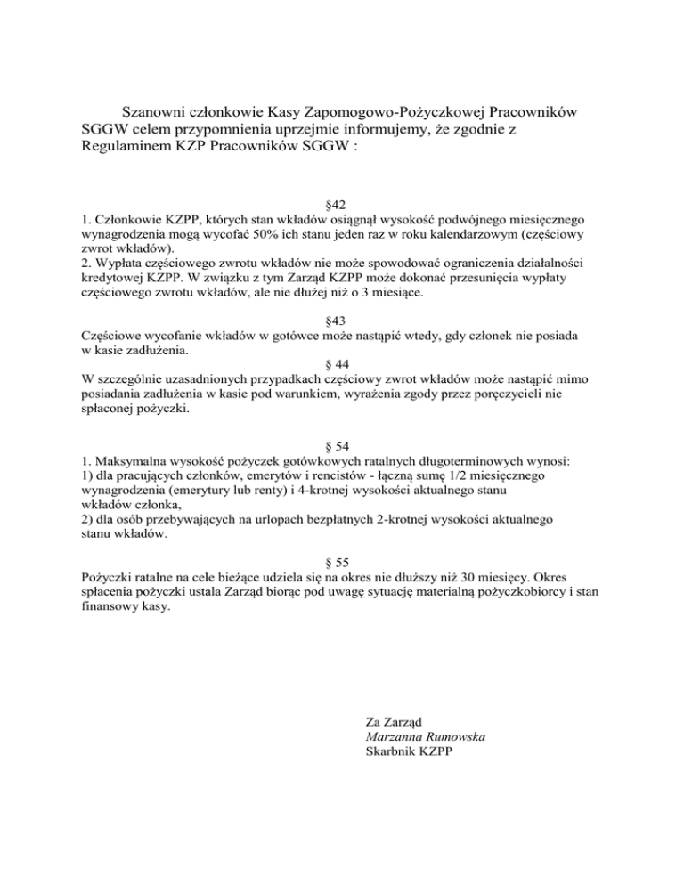 Szanowni członkowie Kasy Zapomogowo-Pożyczkowej Pracowników SGGW celem przypomnienia uprzejmie informujemy, że zgodnie z Regulaminem KZP Pracowników SGGW : §42 1. Członkowie KZPP, których stan wkładów osiągnął wysokość podwójnego miesięcznego wynagrodzenia mogą wycofać 50% ich stanu jeden raz w roku kalendarzowym (częściowy zwrot wkładów). 2. Wypłata częściowego zwrotu wkładów nie może spowodować ograniczenia działalności kredytowej KZPP. W związku z tym Zarząd KZPP może dokonać przesunięcia wypłaty częściowego zwrotu wkładów, ale nie dłużej niż o 3 miesiące. §43 Częściowe wycofanie wkładów w gotówce może nastąpić wtedy, gdy członek nie posiada w kasie zadłużenia. § 44 W szczególnie uzasadnionych przypadkach częściowy zwrot wkładów może nastąpić mimo posiadania zadłużenia w kasie pod warunkiem, wyrażenia zgody przez poręczycieli nie spłaconej pożyczki. § 54 1. Maksymalna wysokość pożyczek gotówkowych ratalnych długoterminowych wynosi: 1) dla pracujących członków, emerytów i rencistów - łączną sumę 1/2 miesięcznego wynagrodzenia (emerytury lub renty) i 4-krotnej wysokości aktualnego stanu wkładów członka, 2) dla osób przebywających na urlopach bezpłatnych 2-krotnej wysokości aktualnego stanu wkładów. § 55 Pożyczki ratalne na cele bieżące udziela się na okres nie dłuższy niż 30 miesięcy. Okres spłacenia pożyczki ustala Zarząd biorąc pod uwagę sytuację materialną pożyczkobiorcy i stan finansowy kasy. Za Zarząd Marzanna Rumowska Skarbnik KZPP