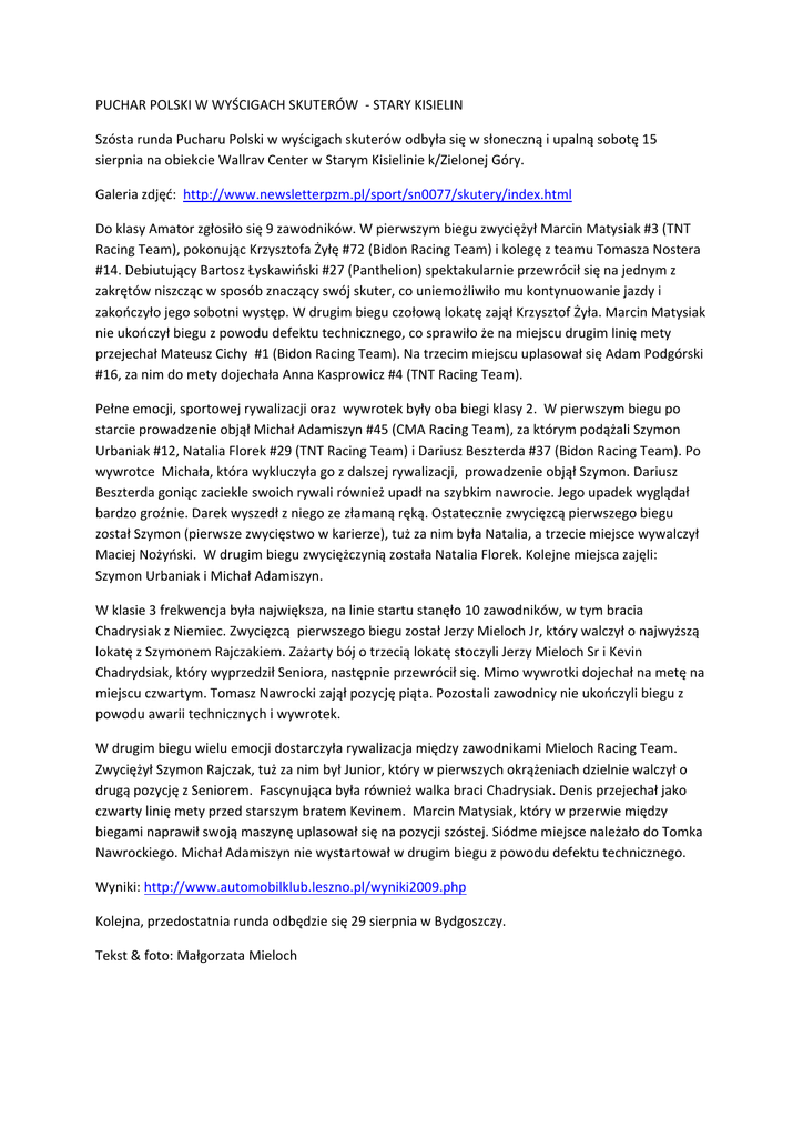 PUCHAR POLSKI W WYŚCIGACH SKUTERÓW ‐ STARY KISIELIN Szósta runda Pucharu Polski w wyścigach skuterów odbyła się w słoneczną i upalną sobotę 15 sierpnia na obiekcie Wallrav Center w Starym Kisielinie k/Zielonej Góry. Galeria zdjęć: http://www.newsletterpzm.pl/sport/sn0077/skutery/index.html Do klasy Amator zgłosiło się 9 zawodników. W pierwszym biegu zwyciężył Marcin Matysiak #3 (TNT Racing Team), pokonując Krzysztofa Żyłę #72 (Bidon Racing Team) i kolegę z teamu Tomasza Nostera #14. Debiutujący Bartosz Łyskawiński #27 (Panthelion) spektakularnie przewrócił się na jednym z zakrętów niszcząc w sposób znaczący swój skuter, co uniemożliwiło mu kontynuowanie jazdy i zakończyło jego sobotni występ. W drugim biegu czołową lokatę zajął Krzysztof Żyła. Marcin Matysiak nie ukończył biegu z powodu defektu technicznego, co sprawiło że na miejscu drugim linię mety przejechał Mateusz Cichy #1 (Bidon Racing Team). Na trzecim miejscu uplasował się Adam Podgórski #16, za nim do mety dojechała Anna Kasprowicz #4 (TNT Racing Team). Pełne emocji, sportowej rywalizacji oraz wywrotek były oba biegi klasy 2. W pierwszym biegu po starcie prowadzenie objął Michał Adamiszyn #45 (CMA Racing Team), za którym podążali Szymon Urbaniak #12, Natalia Florek #29 (TNT Racing Team) i Dariusz Beszterda #37 (Bidon Racing Team). Po wywrotce Michała, która wykluczyła go z dalszej rywalizacji, prowadzenie objął Szymon. Dariusz Beszterda goniąc zaciekle swoich rywali również upadł na szybkim nawrocie. Jego upadek wyglądał bardzo groźnie. Darek wyszedł z niego ze złamaną ręką. Ostatecznie zwycięzcą pierwszego biegu został Szymon (pierwsze zwycięstwo w karierze), tuż za nim była Natalia, a trzecie miejsce wywalczył Maciej Nożyński. W drugim biegu zwyciężczynią została Natalia Florek. Kolejne miejsca zajęli: Szymon Urbaniak i Michał Adamiszyn. W klasie 3 frekwencja była największa, na linie startu stanęło 10 zawodników, w tym bracia Chadrysiak z Niemiec. Zwycięzcą pierwszego biegu został Jerzy Mieloch Jr, który walczył o najwyższą lokatę z Szymonem Rajczakiem. Zażarty bój o trzecią lokatę stoczyli Jerzy Mieloch Sr i Kevin Chadrydsiak, który wyprzedził Seniora, następnie przewrócił się. Mimo wywrotki dojechał na metę na miejscu czwartym. Tomasz Nawrocki zajął pozycję piąta. Pozostali zawodnicy nie ukończyli biegu z powodu awarii technicznych i wywrotek. W drugim biegu wielu emocji dostarczyła rywalizacja między zawodnikami Mieloch Racing Team. Zwyciężył Szymon Rajczak, tuż za nim był Junior, który w pierwszych okrążeniach dzielnie walczył o drugą pozycję z Seniorem. Fascynująca była również walka braci Chadrysiak. Denis przejechał jako czwarty linię mety przed starszym bratem Kevinem. Marcin Matysiak, który w przerwie między biegami naprawił swoją maszynę uplasował się na pozycji szóstej. Siódme miejsce należało do Tomka Nawrockiego. Michał Adamiszyn nie wystartował w drugim biegu z powodu defektu technicznego. Wyniki: http://www.automobilklub.leszno.pl/wyniki2009.php Kolejna, przedostatnia runda odbędzie się 29 sierpnia w Bydgoszczy. Tekst & foto: Małgorzata Mieloch