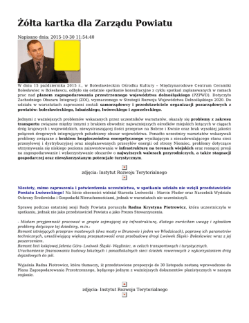 Żółta kartka dla Zarządu Powiatu Napisano dnia: 2015-10-30 11:54:40 W dniu 15 października 2015 r., w Bolesławieckim Ośrodku Kultury – Międzynarodowe Centrum Ceramiki Bolesławiec w Bolesławcu, odbyło się ostatnie spotkanie konsultacyjne z cyklu spotkań zaplanowanych w ramach prac nad planem zagospodarowania przestrzennego województwa dolnośląskiego (PZPWD). Dotyczyło Zachodniego Obszaru Integracji (ZOI), wyznaczonego w Strategii Rozwoju Województwa Dolnośląskiego 2020. Do udziału w warsztatach zaproszeni zostali samorządowcy i przedstawiciele organizacji pozarządowych z powiatów: bolesławieckiego, lubańskiego, lwóweckiego i zgorzeleckiego. Jednymi z ważniejszych problemów wskazanych przez uczestników warsztatów, okazały się problemy z zakresu transportu związane między innymi z brakiem obwodnic najważniejszych ośrodków miejskich leżących w ciągach dróg krajowych i wojewódzkich, niewystraszającej ilości przepraw na Bobrze i Kwisie oraz brak wysokiej jakości połączeń drogowych integrujących południowy obszar województwa. Ponadto uczestnicy warsztatów wskazywali problemy związane z brakiem bezpieczeństwa energetycznego wynikającym z niezadowalającego stanu sieci przesyłowej i dystrybucyjnej oraz nieplanowanych przesyłów energii od strony Niemiec, problemy dotyczące utrzymywania się niskiego poziomu zainwestowania w infrastrukturę na terenach wiejskich oraz rosnącej presji na zagospodarowanie i wykorzystywanie obszarów o najwyższych walorach przyrodniczych, a także stagnacji gospodarczej oraz niewykorzystanym potencjale turystycznym. zdjęcia: Instytut Rozwoju Terytorialnego Niestety, mimo zaproszenia i potwierdzenia uczestnictwa, w spotkaniu udziału nie wzięli przedstawiciele Powiatu Lwóweckiego! Na liście obecności widniał Starosta Lwówecki - Marcin Fluder oraz Naczelnik Wydziału Ochrony Środowiska i Gospodarki Nieruchomościami, jednak w warsztatach nie uczestniczyli. Sprawę podczas ostatniej sesji Rady Powiatu poruszyła Radna Krystyna Piotrowicz, która uczestniczyła w spotkaniu, jednak nie jako przedstawiciel Powiatu a jako Prezes Stowarzyszenia. - Miałam przyjemność pracować w grupie zajmującej się infrastrukturą, dlatego zwróciłam uwagę i zgłosiłam problemy dotyczące tej dziedziny, m.in.: Remont istniejących przepraw mostowych (dwa mosty w Brunowie i jeden we Włodzicach), poprawę ich parametrów technicznych, umożliwiającą większą przepustowość oraz przebudowę drogi Lwówek Śląski- Bolesławiec wraz z jej poszerzeniem. Remont linii kolejowej Jelenia Góra- Lwówek Śląski- Węgliniec, w celach transportowych i turystycznych. Uruchomienie finansowania budowy lokalnych i ponadlokalnych sieci ścieżek rowerowych z wykorzystaniem dróg dojazdowych do pól. Wyjaśnia Radna Piotrowicz, która tłumaczy, iż przedstawione propozycje do 30 listopada zostaną wprowadzone do Planu Zagospodarowania Przestrzennego, będącego jednym z ważniejszych dokumentów planistycznych w naszym regionie. zdjęcia: Instytut Rozwoju Terytorialnego - Niestety diagnoza przeprowadzonej przez Instytut Rozwoju Terytorialnego, który jest autorem strategii, ocenia dostępność infrastruktury drogowej i kolejowej, jako zły, tylko w powiecie lwóweckim. – podkreśla radna Piotrowicz. Podczas ostatniej sesji Rady Powiatu radna mówiła, o tym jak bardzo władze Bolesławca walczyły o wpisanie do planu jednego z ich mostów oraz jak Wójt Warty Bolesławieckiej, przyjechał na spotkanie, tylko po to, żeby czuwać na tym „żeby mu niczego w planie nie zepsuto”, bo z inwestycjami to on sobie sam radzi, teraz stać go nawet na poszerzanie dróg. Naszego powiatu nie stać na takie luksusy, jak wyglądają drogi i mosty wiedzą dobrze wszyscy kierowcy, jak wygląda infrastruktura turystyczna chyba nikomu nie trzeba tłumaczyć. Niestety władze naszego powiatu nie znalazły czasu na udział w tych warsztatach. - Biorąc pod uwagę brak zainteresowania zarządu tak ważną sprawą, wręczam Zarządowi żółtą kartkę. – mówiła podczas sesji poirytowana radna Piotrowicz, po czym otrzymała od kolegów radnych gromkie brawa. Czy Zarząd Powiatu wniesie propozycje do Planu, czy będzie zabiegał o interesy mieszkańców powiatu lwóweckiego, czy żółta kartka zostanie potraktowana poważnie, czy też zostanie zbagatelizowana? O tym przekonamy się po opublikowaniu całego Planu.