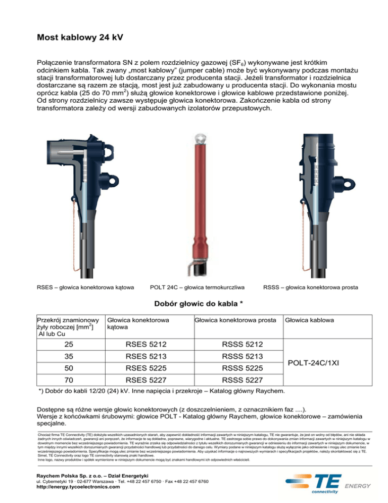 Most kablowy 24 kV Połączenie transformatora SN z polem rozdzielnicy gazowej (SF6) wykonywane jest krótkim odcinkiem kabla. Tak zwany „most kablowy” (jumper cable) może być wykonywany podczas montażu stacji transformatorowej lub dostarczany przez producenta stacji. Jeżeli transformator i rozdzielnica dostarczane są razem ze stacją, most jest już zabudowany u producenta stacji. Do wykonania mostu oprócz kabla (25 do 70 mm2) służą głowice konektorowe i głowice kablowe przedstawione poniżej. Od strony rozdzielnicy zawsze występuje głowica konektorowa. Zakończenie kabla od strony transformatora zależy od wersji zabudowanych izolatorów przepustowych. RSES – głowica konektorowa kątowa POLT 24C – głowica termokurczliwa RSSS – głowica konektorowa prosta Dobór głowic do kabla * Przekrój znamionowy żyły roboczej [mm2] Al lub Cu Głowica konektorowa kątowa Głowica konektorowa prosta 25 RSES 5212 RSSS 5212 35 RSES 5213 RSSS 5213 50 RSES 5225 RSSS 5225 70 RSES 5227 RSSS 5227 Głowica kablowa POLT-24C/1XI *) Dobór do kabli 12/20 (24) kV. Inne napięcia i przekroje – Katalog główny Raychem. Dostępne są różne wersje głowic konektorowych (z doszczelnieniem, z oznacznikiem faz ....). Wersje z końcówkami śrubowymi: głowice POLT - Katalog główny Raychem, głowice konektorowe – zamówienia specjalne. Chociaż firma TE Connectivity (TE) dołożyła wszelkich uzasadnionych starań, aby zapewnić dokładność informacji zawartych w niniejszym katalogu, TE nie gwarantuje, że jest on wolny od błędów, ani nie składa żadnych innych oświadczeń, gwarancji ani poręczeń, że informacje te są dokładne, poprawne, wiarygodne i aktualne. TE zastrzega sobie prawo do dokonywania zmian informacji zawartych w niniejszym katalogu w dowolnym momencie bez wcześniejszego powiadomienia. TE wyraźnie zrzeka się odpowiedzialności z tytułu wszelkich dorozumianych gwarancji w odniesieniu do informacji zawartych w niniejszym dokumencie, w tym między innymi wszelkich dorozumianych gwarancji przydatności handlowej lub przydatności do danego celu. Wymiary podane w niniejszym katalogu służą wyłącznie jako odniesienie i mogą ulec zmianie bez wcześniejszego powiadomienia. Specyfikacje mogą ulec zmianie bez wcześniejszego powiadomienia. Aby uzyskać informacje o najnowszych wymiarach i specyfikacjach projektów, należy skontaktować się z TE. Simel, TE Connectivity oraz logo TE connectivity stanowią znaki handlowe. Inne logo, nazwy produktów i spółek wymienione w niniejszym dokumencie mogą być znakami handlowymi ich odpowiednich właścicieli. Raychem Polska Sp. z o.o. – Dział Energetyki ul. Cybernetyki 19 · 02-677 Warszawa · Tel. +48 22 457 6750 · Fax +48 22 457 6760 http://energy.tycoelectronics.com