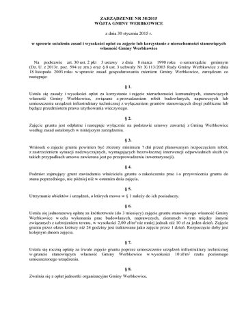 ZARZĄDZENIE NR 38/2015 WÓJTA GMINY WERBKOWICE z dnia 30 stycznia 2015 r. w sprawie ustalenia zasad i wysokości opłat za zajęcie lub korzystanie z nieruchomości stanowiących własność Gminy Werbkowice Na podstawie art. 30 ust. 2 pkt 3 ustawy z dnia 8 marca 1990 roku o samorządzie gminnym (Dz. U. z 2013r. poz. 594 ze zm.) oraz § 8 ust. 3 uchwały Nr X/113/2003 Rady Gminy Werbkowice z dnia 18 listopada 2003 roku w sprawie zasad gospodarowania mieniem Gminy Werbkowice, zarządzam co następuje: § 1. Ustala się zasady i wysokości opłat za korzystanie i zajęcie nieruchomości komunalnych, stanowiących własność Gminy Werbkowice, związane z prowadzeniem robót budowlanych, naprawczych lub umieszczenie urządzeń infrastruktury technicznej z wyłączeniem gruntów stanowiących drogi publiczne lub będące przedmiotem prawa użytkowania wieczystego. § 2. Zajęcie gruntu jest odpłatne i następuje wyłącznie na podstawie umowy zawartej z Gminą Werbkowice według zasad ustalonych w niniejszym zarządzeniu. § 3. Wniosek o zajęcie gruntu powinien być złożony minimum 7 dni przed planowanym rozpoczęciem robót, z zastrzeżeniem sytuacji nadzwyczajnych, wymagających bezzwłocznej interwencji odpowiednich służb (w takich przypadkach umowa zawierana jest po przeprowadzeniu inwentaryzacji). § 4. Podmiot zajmujący grunt zawiadamia właściciela gruntu o zakończeniu prac i o przywróceniu gruntu do stanu poprzedniego, nie później niż w ostatnim dniu zajęcia. § 5. Utrzymanie obiektów i urządzeń, o których mowa w § 1 należy do ich posiadaczy. § 6. Ustala się jednorazową opłatę za krótkotrwałe (do 3 miesięcy) zajęcie gruntu stanowiącego własność Gminy Werbkowice w celu wykonania prac budowlanych, naprawczych, ziemnych w tym między innymi związanych z uzbrojeniem terenu, w wysokości 2,00 zł/m2 nie mniej jednak niż 10 zł za jeden dzień. Zajęcie gruntu przez okres krótszy niż 24 godziny jest traktowane jako zajęcie przez 1 dzień. Rozpoczęcie doby jest kolejnym dniem zajęcia. § 7. Ustala się roczną opłatę za trwałe zajęcie gruntu poprzez umieszczenie urządzeń infrastruktury technicznej w gruncie stanowiącym własność Gminy Werbkowice w wysokości 10 zł/m2 rzutu poziomego umieszczonego urządzenia. § 8. Zwalnia się z opłat jednostki organizacyjne Gminy Werbkowice. § 9. Zajęcie gruntu o powierzchni mniejszej niż 1 m2 przez rzut poziomy obiektu budowlanego lub urządzenia jest traktowane jako zajęcie 1 m2 gruntu. § 10. Zarządzenie określa wzór umowy na krótkotrwałe zajęcie gruntu w celu prowadzenia robót, stanowiący załącznik nr 1 do niniejszego zarządzenia. § 11. Zarządzenie określa wzór umowy na trwale zajęcie gruntu w celu prowadzenia robót, stanowiący załącznik nr 2 do niniejszego zarządzenia. § 12. Stawka opłat powiększona będzie o obowiązujący podatek VAT. § 13. Realizację zarządzenia powierzam inspektorowi ds. mienia komunalnego. § 14. Zarządzenie wchodzi w życie z dniem podpisania. Wójt Lech Bojko Załącznik nr 1 do Zarządzenia nr 38/2015 Wójta Gminy Werbkowice z dnia 30.01.2015r. UMOWA zawarta dnia.................. roku w sprawie krótkotrwałego zajęcia terenu pomiędzy: Gminą Werbkowice z siedziba w Werbkowicach, ul. Zamojska 1, reprezentowana przez Wójta Gminy Werbkowice.................................................. a ….......................................................................................................................................................................... §1 Gmina Werbkowice …..........................z siedziba w Werbkowicach, ul. Zamojska 1 zezwala na krótkotrwałe zajęcie części działki położonej obręb …................... oznaczonej numerem 2 ewidencyjnym …............ o pow. …........... m od dnia …............... roku w celu wykonania prac …............................................................................. §2 Ustala się następujące warunki zajęcia terenu: 1. Zajmujący teren odpowiada za stan bezpieczeństwa na zajmowanym gruncie i ponosi całkowitą odpowiedzialność cywilna wobec osób trzecich z tytułu szkód mogących zaistnieć w związku z prowadzonymi robotami. 2. Po zakończeniu prac ….......................... zobowiązuje się do doprowadzenia terenu do stanu jaki był przed przystąpieniem do wykonania robót, a w przypadku powstania szkód do wypłacenia odszkodowania. 3. W miejscu wykonywania wykopów należy przyjąć odtworzenie nawierzchni. 4. Zobowiązuje się …....................... do powiadomienia właściciela terenu o zakończeniu robót i przywrócenia gruntu do poprzedniego stanu użyteczności, z dniem upływu terminu na jaki zawarto umowę oraz do dokonania protokolarnego odbioru z udziałem przedstawiciela Urzędu Gminy. 5. W przypadku niewykonania zobowiązania, o którym mowa w § 2 ust. 4 umowy, po skutecznym doręczeniu wezwania do doprowadzenia gruntu do stanu pierwotnego, właściciel nieruchomości zleci wykonanie prac innemu podmiotowi, a kosztami naprawy obciąży wnioskodawcę. 6. Zwrot terenu nastąpi na podstawie protokołu zdawczo – odbiorczego. 7. W przypadku stwierdzenia niedotrzymania warunków określonych w niniejszej umowie, tj. przekroczenie terminu zajęcia terenu lub zajęcia większej powierzchni niż określona w § 1 umowy zostaną naliczone dodatkowe opłaty za każdy dzień do dnia bazusterkowego odbioru teren, według stawek określonych w § 3 niniejszej umowy. §3 Opłata za krótkotrwałe zajęcie terenu zgodnie z zarządzeniem Wójta Gminy Werbkowice 2 2 Nr …...................... z dnia …............ wynosi …. m x 2,00 zł/m dziennie = …. zł x ….. dni = …... zł, płatne w terminie czternastu dni od dnia otrzymania faktury Vat na konto Gminy: BS Werbkowice 31964200092001000006190001 (nie mniej jednak niż 10 zł za dzień zajęcia). §4 W sprawach nieuregulowanych postanowieniami niniejszej umowy zastosowanie ma