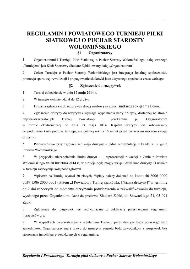 __________________________________________________________________________ REGULAMIN I POWIATOWEGO TURNIEJU PIŁKI SIATKOWEJ O PUCHAR STAROSTY WOŁOMIŃSKIEGO §1 1. Organizatorzy Organizatorami I Turnieju Piłki Siatkowej o Puchar Starosty Wołomińskiego, dalej zwanego „Turniejem” jest Klub Sportowy Siatkarz Ząbki, zwany dalej „Organizatorem”. 2. Celem Turnieju o Puchar Starosty Wołomińskiego jest integracja lokalnej społeczności, promocja sportowej rywalizacji i propagowanie siatkówki jako aktywnego spędzania czasu wolnego. §2 Zgłoszenie do rozgrywek 1. Turniej odbędzie się w dniu 17 maja 2014 r. 2. W turnieju weźmie udział do 12 drużyn. 3. Drużyna zgłasza się do rozgrywek drogą mailową na adres: [email protected]. 4. Zgłoszenie drużyny do rozgrywek wymaga wypełnienia karty drużyny, dostępnej na stronie http://siatkarzzabki.pl/ Turniej Powiatowy i przekazania jej Organizatorom w formie elektronicznej do dnia 09 maja 2014. Kapitan drużyny jest zobowiązany do podpisania karty podczas turnieju, nie później niż na 15 minut przed pierwszym meczem swojej drużyny. 5. Pierwszeństwo przy zgłoszeniach mają drużyny – jedna reprezentacja z każdej z 12 gmin Powiatu Wołomińskiego. 6. W przypadku niezapełnienia limitu drużyn – 1 reprezentacji z każdej z Gmin z Powiatu Wołomińskiego do 28 kwietnia 2014 r., w turnieju będą mogły wziąć udział inne drużyny. O udziale w turnieju zadecyduje kolejność zgłoszeń. 7. Wpisowe na Turniej wynosi 50 złotych. Wpłaty należy dokonać na konto 46 8006 0000 0039 1586 2000 0001 tytułem „I Powiatowy Turniej siatkówki, [Nazwa drużyny]” w terminie do 2 dni roboczych od momentu otrzymania potwierdzenia o zakwalifikowaniu do turnieju, wysłanego przez Organizatora. Dane do przelewu: Siatkarz Ząbki, ul. Słowackiego 21, 05-091 Ząbki. 8. Zgłoszenie do rozgrywek jest jednoznaczne z deklaracją przestrzegania regulaminu i przepisów gry. 9. W wypadkach nieprzestrzegania regulaminu Turnieju przez drużynę bądź poszczególnych zawodników, Organizatorzy mają prawo do usunięcia zespołu bądź zawodników z rozgrywek bez stosowania innych kar przewidzianych w regulaminie. ___________________________________________________________________________ Regulamin I Powiatowego Turnieju piłki siatkowe o Puchar Starosty Wołomińskiego __________________________________________________________________________ 10. W Turnieju mogą brać udział tylko zawodnicy, którzy zostali zgłoszeni do rozgrywek zgodnie z regulaminem rozgrywek. 11. W Turnieju mogą brać udział zarówno amatorzy jak i zawodnicy z klubów IV i III ligi. 12. Zawodnik może być zgłoszony tylko do jednej drużyny. 13. Zawodnicy mogą być zgłaszani tylko przed rozpoczęciem rozgrywek. 14. Zawodnicy biorący udział w Turnieju zobowiązani są poddać się wcześniej badaniom lekarskim stwierdzającym ich dobry stan zdrowia. 15. Ubezpieczenie NNW dla zawodników jest zapewniane przez Organizatorów. 16. W Turnieju mogą brać jedynie osoby, które ukończyły 18 rok życia. 17. Zawodnik, który nie ukończył 18 roku nie może wziąć udziału w Turnieju. §3 Organizacja rozgrywek 1. Za organizację rozgrywek Turnieju odpowiedzialni są Organizatorzy. 2. Oficjalnym źródłem informacji o rozgrywkach i decyzjach Organizatorów jest strona internetowa http://siatkarzzabki.pl/ i e-maile rozsyłane przez Organizatorów na adresy i numery kontaktowe podane w kartach zgłoszeniowych drużyn. 3. Rozgrywki obejmują: Fazę grupową; Ćwierćfinały; Półfinały; Finał i mecz o 3 miejsce . 1. Terminarz rozgrywek ustalany jest przez Organizatorów. Organizatorzy zastrzegają sobie prawo do zmian w terminarzu w trakcie rozgrywek. Szczegółowy terminarz uzależniony będzie od liczby zgłoszonych drużyn i zostanie zamieszczony na stronie internetowej http://siatkarzzabki.pl/ najpóźniej 14 maja br. 2. Wszystkie wyniki z rundy drużyny wykluczonej z rozgrywek zostają anulowane, jeśli rozegra ona mniej niż 50% meczy w Turnieju, a jeżeli rozegra ich więcej - wyniki zostaną utrzymane, zaś w meczach nierozegranych - zostaną przyznane walkowery dla drużyn przeciwnych. Drużyna, która została wykluczona, sklasyfikowana zostaje na ostatnim miejscu. 3. Wszelkie protesty muszą być składane do Organizatorów w formie pisemnej (osobiście) najpóźniej w ciągu 15 minut od momentu zakończenia meczu.. 4. Na rozpatrzenie protestu i wydanie decyzji Organizatorzy mają maksymalnie 15 minut. §4 5. Boisko ma wymiary 9 x 18 metrów. 6. Wysokość siatki wynosi 2,42 m. Przepisy gry ___________________________________________________________________________ Regulamin I Powiatowego Turnieju piłki siatkowe o Puchar Starosty Wołomińskiego __________________________________________________________________________ 7. Zawodnicy muszą grać w butach przeznaczonych na halę. 8. Organizatorzy zapewniają piłki do rozgrywania spotkań. 9. Drużyna składa się z 6 do 10 zawodników. 10. Na boisku może przebywać maksymalnie 6 osób. 11. Mecz może się rozpocząć gdy drużyna dysponuje składem co najmniej pięcioosobowym. 12. Ilość zmian jest nieograniczona. 13. Dopuszcza się zmiany powrotne. 14. Każdej drużynie przysługują dwie przerwy na żądanie w każdym secie (nie ma przerw technicznych). 15. Zmiany mogą być dokonywane jedynie podczas przerwy w grze. W przypadku naruszenia tego przepisu gry sędzia ma prawo zastosować odpowiednią karę. 16. Kapitan musi zgłosić się do sędziego przed rozpoczęciem spotkania w celu przeprowadzenia losowania drużyny serwującej. 17. Do rozmowy z arbitrem upoważniony jest jedynie kapitan. 18. Wszystkie zespoły są odpowiedzialne za osoby im towarzyszące. W przypadku niewłaściwego zachowania się osób towarzyszących, Organizatorzy mogą zweryfikować wynik meczu, ukarać drużynę finansowo bądź wykluczyć z Turnieju. 19. Sędzia ma prawo nie dopuścić do gry zawodnika będącego pod wpływ