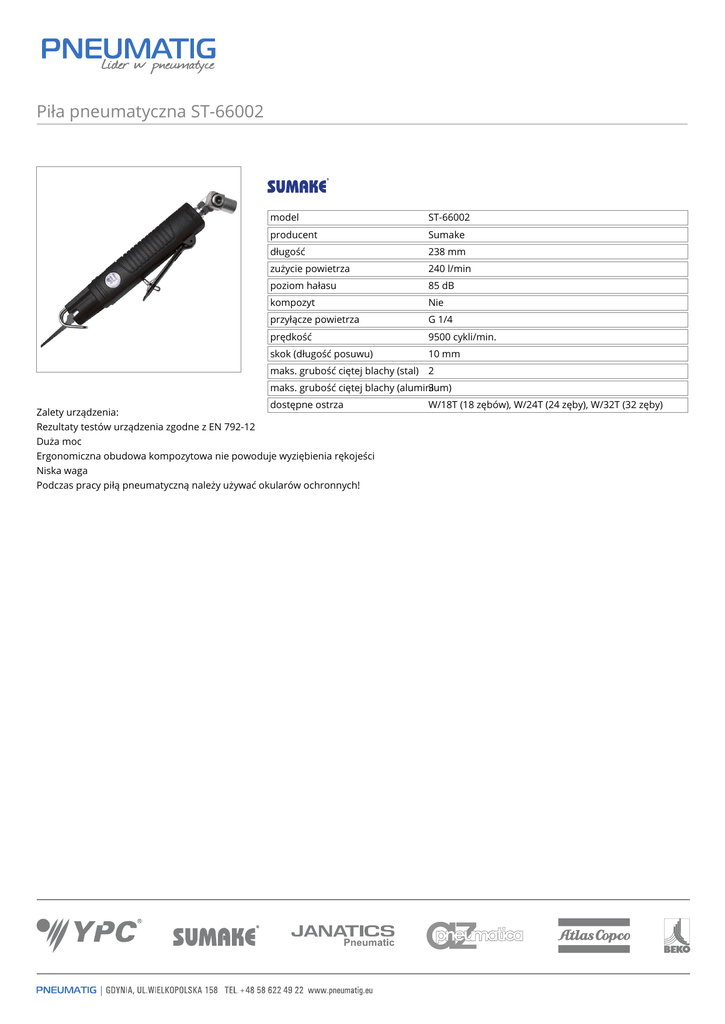 Piła pneumatyczna ST-66002 model ST-66002 producent Sumake długość 238 mm zużycie powietrza 240 l/min poziom hałasu 85 dB kompozyt Nie przyłącze powietrza G 1/4″ prędkość 9500 cykli/min. skok (długość posuwu) 10 mm maks. grubość ciętej blachy (stal) 2 maks. grubość ciętej blachy (aluminium) 3 dostępne ostrza Zalety urządzenia: Rezultaty testów urządzenia zgodne z EN 792-12 Duża moc Ergonomiczna obudowa kompozytowa nie powoduje wyziębienia rękojeści Niska waga Podczas pracy piłą pneumatyczną należy używać okularów ochronnych! W/18T (18 zębów), W/24T (24 zęby), W/32T (32 zęby)
