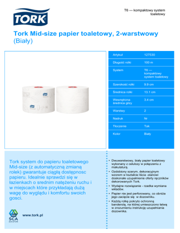 T6 — kompaktowy system toaletowy Tork Mid-size papier toaletowy, 2-warstwowy (Biały) Tork system do papieru toaletowego Mid-size (z automatyczną zmianą rolek) gwarantuje ciągłą dostępnosc papieru. Idealnie sprawdzi się w łazienkach o srednim natężeniu ruchu i w miejscach które przykładają dużą wagę do wyglądu i komfortu swoich gosci. www.tork.pl Artykuł 127530 Długość rolki 100 m System T6 — kompaktowy system toaletowy Szerokość rolki 9.9 cm Średnica rolki 13.1 cm Wewnętrzna średnica gilzy 3.4 cm Warstwy 2 Nadruk Nr Tłoczenie Tak Kolor Biały • Dwuwarstwowy, biały papier toaletowy wykonany z celulozy w połączeniu z makulaturą. • Ozdobiony szarym, dekoracyjnym wzorem w kształcie liścia -stanowi doskonałe uzupełnienie oferty ręczników dekorowanych Tork. • Wydajne rozwiązanie - rzadka wymiana wkładów. • Papier nie jest perforowany, co obniża jego zacięcie się w dozowniku. • Każdą rolkę pokryto ochronną banderolą, na której umieszczono łatwą w zrozumieniu instrukcję uzupełniania dozownika. T6 — kompaktowy system toaletowy Informacje o opakowaniu Opakowanie pojedyncze Opakowanie transportowe Paleta EAN 7322540475876 7322540475883 7322540575859 Sztuki 1 27 810 Opakowania pojedyncze - 27 810 Wysokość 99 mm 314 mm 1720 mm Szerokość 132 mm 403 mm 806 mm Długość 132 mm 403 mm 1209 mm Objętość 1.7 dm3 51 dm3 1.5 m3 Waga netto 307 g 8.3 kg 248.59 kg Waga brutto 327 g 9.2 kg 276.66 kg Rodzaj opakowania - Carton - Wybierz dozownik 557508 557500 Alternatywne produkty 127510 Certyfikaty produktu Kontakt SCA Hygiene Sp. z o.o. ul. Puławska 435A 02-801 Warszawa, Polska Tel.: +48 22 543 75 00 Faks: +48 22 543 75 01 Tork jest marką grupy SCA, Svenska Cellulosa Aktiebolaget. Grupa SCA oferuje artykuły higieniczne oraz produkty pochodzenia drzewnego w ponad 100 krajach. Więcej informacji można znaleźć pod adresem www.sca.com www.tork.pl