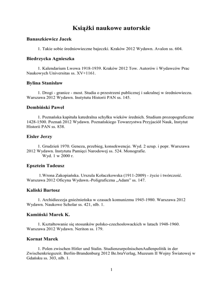 KsiąŜki naukowe autorskie Banaszkiewicz Jacek 1. Takie sobie średniowieczne bajeczki. Kraków 2012 Wydawn. Avalon ss. 604. Biedrzycka Agnieszka 1. Kalendarium Lwowa 1918-1939. Kraków 2012 Tow. Autorów i Wydawców Prac Naukowych Universitas ss. XV+1161. Bylina Stanisław 1. Drogi - granice - most. Studia o przestrzeni publicznej i sakralnej w średniowieczu. Warszawa 2012 Wydawn. Instytutu Historii PAN ss. 145. Dembiński Paweł 1. Poznańska kapituła katedralna schyłku wieków średnich. Studium prozopograficzne 1428-1500. Poznań 2012 Wydawn. Poznańskiego Towarzystwa Przyjaciół Nauk, Instytut Historii PAN ss. 838. Eisler Jerzy 1. Grudzień 1970. Geneza, przebieg, konsekwencje. Wyd. 2 uzup. i popr. Warszawa 2012 Wydawn. Instytutu Pamięci Narodowej ss. 524. Monografie. Wyd. 1 w 2000 r. Epsztein Tadeusz 1.Wrona Zakopiańska. Urszula Kołaczkowska (1911-2009) - Ŝycie i twórczość. Warszawa 2012 Oficyna Wydawn.-Poligraficzna „Adam” ss. 147. Kaliski Bartosz 1. Archidiecezja gnieźnieńska w czasach komunizmu 1945-1980. Warszawa 2012 Wydawn. Naukowe Scholar ss. 421, nlb. 1. Kamiński Marek K. 1. Kształtowanie się stosunków polsko-czechosłowackich w latach 1948-1960. Warszawa 2012 Wydawn. Neriton ss. 179. Kornat Marek 1. Polen zwischen Hitler und Stalin. StudienzurpolnischenAußenpolitik in der Zwischenkriegszeit. Berlin-Brandenburg 2012 Be.braVerlag, Muzeum II Wojny Światowej w Gdańsku ss. 303, nlb. 1. 1 KriegseisenWojciech 1. Die Protestanten in Polen-Litauen (1696-1763). RechtlicheLage, Organisation und Beziehungenzwischen den evangelischenGlaubensgemeinschaften. Wyd. 1 w jęz. niemieckim, popr. i uzup. Wiesbaden 2011 HarrassowitzVerlag ss. VI, 350. Jabloniana. Quellen und ForschungenzureuropäischenKulturgeschichte der FrühenNeuzeit. Bd. 2. Wyd. 1 w jęz. polskim w r. 1996. Kucharczyk Grzegorz 1. Pierwszy holocaust XX wieku. Wyd. 2 popr. Warszawa 2012 Wydawn. Fronda ss. 243, nlb. 10. Wyd. 1 w 2004 r. 2. Russell Kirk (1918-1994). Myśl polityczna amerykańskiego konserwatysty. Warszawa 2012 Wydawn. Prohibita ss. 266. Nalewajko Małgorzata 1. Nieznani a bliscy. Historyczne i społeczne uwarunkowania recepcji polskiej imigracji przełomu XX i XXI wieku w Hiszpanii. Warszawa 2012 Wydawn. Instytutu Historii PAN ss. 484. Trajdos Tadeusz 1. Wpółautor: SedemstoročihradovL'ubovňa a Dunajec. StaráĽubovňa 2012 Ľubovnianskemúzeum ss. 103, nlb. 1. Wspólnie z: Števik Miroslav. 2. Wpółautor: Siedem wieków zamków Lubowla i Dunajec. Niedzica 2012 Stow. Historyków Sztuki, Muzeum - Zespół Zamkowy w Niedzicy ss. 103, nlb. 1. Wspólnie z: Števik Miroslav. Wiślicz-Iwańczyk Tomasz 1. Upodobanie. MałŜeństwo i związki nieformalne na wsi polskiej XVII-XVIII wieku. WyobraŜenia społeczne i jednostkowe doświadczenia. Wrocław 2012 Wydawn. Chronicon, Instytut Historii PAN ss. 278. 2 KsiąŜki naukowe warsztatowe Bukowski Waldemar 1. Współoprac. i red.: Słownik historyczno-geograficzny województwa krakowskiego w średniowieczu. Cz. IV, z. 3: Mieszczyński Staw - Mogilany. Pod red. ... Oprac. ... Kraków 2011 Wydawn. Tow. Naukowego „SocietasVistulana” ss. 244. Wspólnie z: Laberschek J., Marzec A., Mikuła M., Nabiałek K., Wolski M., Zdanek M. Chłapowski Krzysztof 1. Oprac.: Księga wpisów podkanclerzego Jana Tarnowskiego MK 137 z Archiwum Głównego Akt Dawnych w Warszawie 1592. Oprac. ... Warszawa 2012 Wydawn. DiG ss. 309, nlb. 1. Sumariusz Metryki Koronnej. Seria Nowa. T. 6. Gąsiorowska Patrycja 1. Oprac.: HolzapfelHeribert: Podręcznik historii Zakonu Braci Mniejszych. Tyniec 2012 Wydawn. Benedyktynów Tyniec ss. 503. Gruca Anna 1. Współoprac. i red.: Bibliografia historii polskiej za rok 2010. Pod red. ... Oprac. ... Warszawa 2012 Instytut Historii PAN ss. XI, 820. Wspólnie z: Gąsiorowski S., Gołdyn P., Jędryka S., Kabata J. A. Jurek Tomasz 1. Współoprac. i red.: Słownik historyczno-geograficzny województwa poznańskiego w średniowieczu. Pod. red. … Oprac. ... Cz. V, z. 1: Ś. Poznań 2011 Wydawn. Poznańskiego Towarzystwa Przyjaciół Nauk ss. 256. Instytut Historii PAN. Wspólnie z: Dembiński P., Gidaszewski T., Górska-Gołaska K., Rutkowska G., Skierska I. Kornat Marek 1. Oprac.: Jerzy Giedroyc, Czesław Miłosz. Listy 1964-1972. Oprac. ... Warszawa 2011 Spółdzielnia Wydawn. „Czytelnik” ss. 641, nlb. 2. TakŜe autor przypisów. 2. Oprac.: Jerzy Giedroyc, Czesław Miłosz. Listy 1973-2000. Oprac. ... Warszawa 2012 Spółdzielnia Wydawn. „Czytelnik” ss. 614, nlb. 2. TakŜe autor przypisów. 3. Oprac.: Łubieński Michał: Refleksje i reminiscencje. Wstęp, oprac. i przypisy... Warszawa 2012 Wydawn. Sejmowe ss. 214, nlb 2. 3 Romek Zbigniew 1. Współoprac.: Bibliografia prac Profesora Andrzeja Wierzbickiego za lata 1971-2011. Oprac. ... Warszawa 2012 Instytut Historii PAN ss. 24. Wspólnie z: Wolniewicz M. Romanowski Andrzej 1. Red.: Polski słownik biograficzny. Warszawa-Kraków 2012 t. 48 z. 196-198. Instytut Historii PAN. 3 Zaremska Hanna 1. Współoprac.: Bronisław Geremek. O średniowieczu. Wybór artykułów i przedmowa ... Oprac. ... Warszawa 2012 Instytut Historii PAN ss. 814, 8 il. Wspólnie z: Niegowska Agnieszka. 4 KsiąŜki naukowe redagowane Borejsza Jerzy 1. Red.: The Crimean War 1853-1856. Colonial Skirmish or Rehearsal for World War? Empires, Nations, and Individuals. Ed. ... Warszawa 2011 Wydawn. Neriton, InstytutHistorii PAN ss. 536. Materiały z konferencji, która odbyła się w Warszawie w Instytucie Historii PAN w październiku 2007 r. Przedruk rosyjskojęzycznej części ksiąŜki ukazał się pt.: The Russian Empire and the Crimean War w czasopiśmie Russian Studies in History Vol. 51: 2012 no 1 s. 1- 96. Brus Anna 1. Red.: Śliwowska Wiktoria: Historyczne peregrynacje. Szkice z dziejów Polaków i Rosjan w XIX wieku. Warszawa 2012 Instytut Historii PAN ss. 494, nlb. 1. Epsztein Tadeusz 1. Współred.: Generalne Gubernatorstwo. Relacje i dokumenty. Oprac. Aleksandra Bańkowska. Warszawa 2012 śydowski In