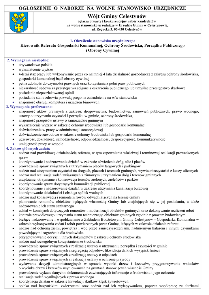 OGŁOSZENIE O NABORZE NA WOLNE STANOWISKO URZĘDNICZE Wójt Gminy Celestynów ogłasza otwarty i konkurencyjny nabór kandydatów na wolne stanowisko urzędnicze w Urzędzie Gminy w Celestynowie, ul. Regucka 3, 05-430 Celestynów 1. Określenie stanowiska urzędniczego: Kierownik Referatu Gospodarki Komunalnej, Ochrony Środowiska, Porządku Publicznego i Obrony Cywilnej 2. Wymagania niezbędne: obywatelstwo polskie wykształcenie wyższe 4-letni staż pracy lub wykonywanie przez co najmniej 4 lata działalność gospodarczą z zakresu ochrony środowiska, gospodarki komunalnej bądź obrony cywilnej pełna zdolność do czynności prawnych oraz korzystania z pełni praw publicznych niekaralność sądowa za przestępstwa ścigane z oskarżenia publicznego lub umyślne przestępstwo skarbowe posiadanie nieposzlakowanej opinii posiadanie stanu zdrowia pozwalającego na zatrudnienie na w/w stanowisku znajomość obsługi komputera i urządzeń biurowych 3. Wymagania preferowane: znajomość aktów prawnych z zakresu: drogownictwa, budownictwa, zamówień publicznych, prawo wodnego, ustawy o utrzymaniu czystości i porządku w gminie, ochrony środowiska, znajomość przepisów ustawy o samorządzie gminnym wykształcenie wyższe w zakresie ochrony środowiska lub gospodarki komunalnej doświadczenie w pracy w administracji samorządowej doświadczenie zawodowe w zakresie ochrony środowiska lub gospodarki komunalnej uczciwość, dokładność, samodzielność, odpowiedzialność, dyspozycyjność, komunikatywność umiejętność pracy w zespole 4. Zakres głównych zadań: nadzór nad prawidłową działalnością referatu, w tym zapewnienia właściwej i terminowej realizacji prowadzonych spraw koordynowanie i nadzorowanie działań w zakresie oświetlenia dróg, ulic i placów prowadzenie spraw związanych z utrzymaniem placów targowych i parkingów nadzór nad utrzymaniem czystości na drogach, placach i terenach gminnych, wywóz nieczystości z koszy ulicznych nadzór nad realizacją zadań związanych z zimowym utrzymaniem dróg i terenów gminnych urządzanie, utrzymanie i konserwacja terenów zielonych, zieleńców i parków koordynowanie spraw dotyczących komunikacji publicznej koordynowanie i nadzorowanie działań w zakresie utrzymania kanalizacji burzowej koordynowanie działalności i obsługa spółek wodnych nadzór nad konserwacją i remontem rowów odwadniających na terenie Gminy planowanie remontów obiektów będących własnością Gminy lub znajdujących się w jej posiadaniu, a także nadzorowanie ich stanu sanitarnego udział w komisjach dotyczących remontów i modernizacji obiektów gminnych oraz dokonywanie rozliczeń robót kontrola prawidłowego utrzymania stanu technicznego obiektów gminnych zgodnie z prawem budowlanym bieżące nadzorowanie i współdziałanie z Zakładem Budżetowym Gminy Celestynów - Gospodarka Komunalna w zakresie wykonywania zadań i robót powierzonych przez Gminę, leżących w zakresie działania referatu nadzór nad ochroną ziemi, powietrza i wód przed zanieczyszczeniami, nadmiernym hałasem i innymi czynnikami powodującymi zagrożenie dla środowiska przygotowywanie decyzji i innych dokumentów z zakresu ochrony środowiska nadzór nad szczególnym korzystaniem ze środowiska prowadzenie spraw związanych z realizacją ustawy o utrzymaniu porządku i czystości w gminie prowadzenie spraw związanych z segregacją odpadów, likwidacja dzikich wysypisk śmieci prowadzenie spraw związanych z realizacją ustawy o odpadach prowadzenie spraw związanych z realizacją ustawy o ochronie przyrody wydawanie decyzji administracyjnych w sprawie wycinki drzew i krzewów, przygotowywanie wniosków o wycinkę drzew i krzewów usytuowanych na gruntach stanowiących własność Gminy prowadzenie wykazu danych o dokumentach zawierających informacje o środowisku i jego ochronie realizacja zadań wynikających z prawa wodnego koordynacja działań w zakresie likwidacji skutków klęsk żywiołowych opieka nad bezpańskimi zwierzętami oraz nadzór nad ich wyłapywaniem, poprzez współpracę ze służbami weterynaryjnymi współpraca ze stowarzyszeniami ekologicznymi prowadzenie spraw, wydawanie opinii, decyzji dotyczących powszechnego obowiązku obrony Rzeczypospolitej Polskiej, w zakresie niezastrzeżonym dla innych komórek organizacyjnych współdziałanie z organami wojskowymi w sprawach związanych z wykonywaniem czynności powszechnego obowiązku obronności, w szczególności realizacja czynności związanych z akcją kurierską planowanie zadań z zakresu obrony cywilnej, a także wydatków finansowych na działalność obrony cywilnej w gminie opracowywanie i opiniowanie planów obrony cywilnej tworzenie i przygotowywanie do działań jednostek organizacyjnych obrony cywilnej organizowanie i koordynowanie szkoleń oraz ćwiczeń obrony cywilnej przygotowywanie i zapewnienie działania systemu wykrywania i alarmowania oraz systemu wczesnego ostrzegania o zagrożeniach przygotowywanie i organizowanie ewakuacji ludności planowanie i zapewnienie ochrony oraz ewakuacji dóbr kultury na wypadek zagrożenia zniszczeniem zaopatrywanie organów i formacji obrony cywilnej w sprzęt, środki techniczne umundurowanie niezbędne do wykonywania zadań obrony cywilnej, a także zapewnienie odpowiednich warunków ich przechowywania, konserwacji, eksploatacji i remontu koordynowanie działaniami w czasie stanu klęski żywiołowej współdziałanie z Policją i Państwową Strażą Pożarną dla zapewnienia bezpieczeństwa publicznego nadzór merytoryczny nad Ochotniczymi Strażami Pożarnymi prowadzenie spraw związanych z realizacją ustawy o zarządzaniu kryzysowym 5. Wymagane dokumenty: 1. List motywacyjny 2. Curriculum Vitae 3. Kserokopia dowodu osobistego 4. Oświadczenie o wyrażeniu zgody na przetwarzanie danych osobowych do celów rekrutacji 5. Oświadczenie o posiadaniu pełnej zdolności do czynności prawnych i korzystaniu z pełni praw