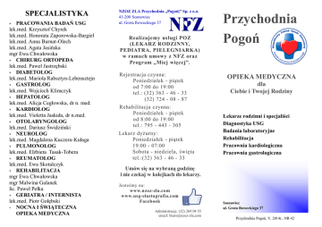 SPECJALISTYKA PRACOWANIA BADAŃ USG lek.med. Krzysztof Chyrek lek.med. Honorata Zaporowska-Bargieł lek.med. Anna Burnat-Olech lek.med. Agata Jasińska mgr Ewa Chwałowska CHIRURG ORTOPEDA lek.med. Paweł Jastrzębski DIABETOLOG lek.med. Mariola Rabsztyn-Lebensztejn GASTROLOG lek.med. Wojciech Klimczyk HEPATOLOG lek.med. Alicja Cegłowska, dr n. med. KARDIOLOG lek.med. Violetta Jaskuła, dr n.med. OTOLARYNGOLOG lek.med. Dariusz Świdziński NEUROLOG lek.med. Magdalena Kuczera-Kułaga PULMONOLOG lek.med. Elżbieta Tasak-Tobera REUMATOLOG lek.med. Ewa Skotalczyk REHABILITACJA mgr Ewa Chwałowska mgr Malwina Galanek lic. Paweł Pełka GERIATRA / INTERNISTA lek.med. Piotr Gołębski NOCNA I ŚWIĄTECZNA OPIEKA MEDYCZNA NZOZ ZLA Przychodnia „Pogoń|” Sp. z o.o. 41-200 Sosnowiec ul. Grota Roweckiego 37 Realizujemy usługi POZ (LEKARZ RODZINNY, PEDIATRA, PIELEGNIARKA) w ramach umowy z NFZ oraz Program „Miej więcej”. Rejestracja czynna: Poniedziałek - piątek od 7:00 do 19:00 tel.: (32) 363 - 46 - 33 (32) 724 - 08 - 87 Rehabilitacja czynna: Poniedziałek - piątek od 8:00 do 19:00 tel.: 795 - 443 - 305 Lekarz dyżurny: Poniedziałek - piątek 19:00 - 07:00 Sobota - niedziela, święta tel.:(32) 363 - 46 - 33 Przychodnia Pogoń OPIEKA MEDYCZNA dla Ciebie i Twojej Rodziny Lekarze rodzinni i specjaliści Diagnostyka USG Badania laboratoryjne Rehabilitacja Pracownia kardiologiczna Pracownia gastrologiczna Umów się na wybraną godzinę i nie czekaj w kolejkach do lekarzy. Jesteśmy na: www.nzoz-zla.com www.usg-elastografia.com Facebook Administracja: (32) 269 04 55 email: [email protected] Sosnowiec ul. Grota Roweckiego 37 Przychodnia Pogoń, V, 2014r., NR 42 AKTUALNOŚCI STREFA PACJENTA Dzień dziecka Czy osobom w podeszłym wieku przysługuje Dom Pomocy Społecznej? Z okazji zbliżającego się Dnia Dziecka zapraszamy Państwa Pociechy 31 maja do bezpłatnych przesiewowych badań w kierunku PŁASKOSTOPIA. Brak odpowiedniej ilości ruchu oraz siedzący tryb życia sprawiają, że stopy dzieci są nieprawidłowo wysklepione, a tym samym stanowią krzywy fundament dla kończyn i kręgosłupa. Badanie będzie polegało na wykonaniu odcisku stóp oraz jego analizie. Serdecznie zapraszamy. Zapisy w rejestracji: (32) 363 46 33. Otóż okazuje się, że nie wystarczy być starszym wiekiem, nie wystarczy też być schorowanym, gdyż jak to określił w ostatnim czasie Wojewódzki Sąd Administracyjny w Gdańsku wiek, choroba lub niepełnosprawność osoby starającej się o skierowanie musi być tego rodzaju, że uniemożliwia jej nie tylko samodzielne funkcjonowanie w dotychczasowym środowisku, ale uniemożliwia jej normalną egzystencję i samoobsługę, pomimo innych możliwości pomocy (III SA/Gd 126/14). Tak więc warto pamiętać, iż w sytuacji, gdy Pacjent nie może otrzymać miejsca w Domu Pomocy Społecznej, a stan jego zdrowia utrudnia mu codzienne funkcjonowanie, należy starać się o pomoc w postaci usług opiekuńczych i pielęgnacyjnych. Dla osób, których stan zdrowia jest skrajnie zły (i/lub leczenie paliatywne), a rodzina nie jest w stanie zapewnić właściwej opieki medycznej, NFZ przewidział Zakłady OpiekuńczoLecznicze - szczegóły u lekarza rodzinnego. CIEKAWOSTKI EKUZ Wkrótce wakacje i czas rodzinnych wyjazdów za granicę. Czy pamiętamy, aby się ubezpieczyć? Raczej nie. Z pomocą wszystkim ubezpieczonym przychodzi NFZ, który bezpłatnie wydaje karty EKUZ obowiązujące na terenie krajów Unii Europejskiej oraz jeszcze w kilku innych państwach. W razie nagłego pogorszenia zdrowia właścicielowi karty przysługują takie same świadczenia zdrowotne, jak obywatelowi państwa, w którym się znajduje. A zatem jeśli planujecie Państwo wyjazd, już dziś złóżcie wniosek do NFZ. Szczegóły na: www.ekuz.nfz.gov.pl