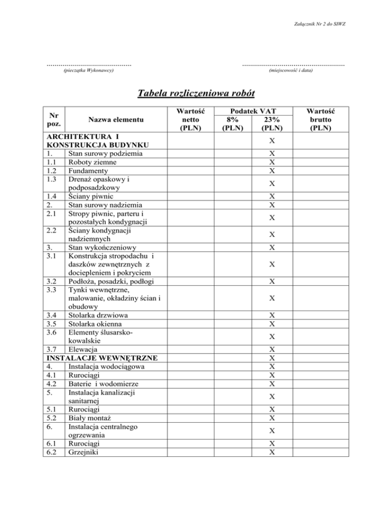 Załącznik Nr 2 do SIWZ - Tabela rozliczeniowa robót