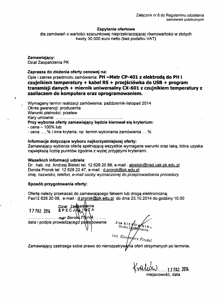 Załącznik nr 6 do Regulaminu udzielania zamówień publicznych Zapytanie ofertowe dla zamówień o wartości szacunkowej nieprzekraczającej równowartości w złotych kwoty 30 000 euro netto (bez podatku VAT) Zamawiający: Dział Zaopatrzenia PK Zaprasza do złożenia oferty cenowej na: PH -Metr CP-401 z elektrodą do PH i czujnikiem temperatury + kabel RS + przejściówka do USB + program transmisji danych + miernik uniwersalny CX-601 z czujnikiem temperatury z zasilaczem do komputera oraz oprogramowaniem. Opis i zakres przedmiotu zamówienia: Wymagany termin realizacji zamówienia: październik-listopad 2014 Okres gwarancji: producenta Warunki płatności: przelew Kary umowne: . przy wyborze oferty zamawiający będzie kierował się kryterium: - cena - 1000/0 lub: - cena ..... % i inne kryteria; np. termin wykonania zamówienia .... % dotyczące wyboru najkorzystniejszej oferty: Zamawiający wybierze ofertę spełniającą wszystkie wymagane Informacje największą liczbę warunki oraz taką, która uzyska punktów zgodnie z wyżej przyjętymi kryteriami. Wszelkich informacji udziela: Dr: "hab. inż. Andrzej Bielski tel. 126282088, e-mail: [email protected] Dorota Prorok tel. 126282247, e-mail: [email protected] imię! nazwisko! telefon! e-mail osoby wyznaczonej do przeprowadzenia procedury Sposób przygotowania oferty: Ofertę należy przekazać do zamawiającego faksem lub drogą elektroniczną. Fax12 62820 OS, e-mail: [email protected] do dnia 23.10.2014 do godziny 10.00 17 PAź. 2014 Dział Za SPECJ ...................... rtłłlr. Dora data i podpis prowadząceg inż . Zamawiający zastrzega .lG ae sobie prawo do nierozpatryw erz P' lndel ia ofert otrzymanych po terminie. lrl t~W 1. 7. PAt lOn.. miejscowość, dała