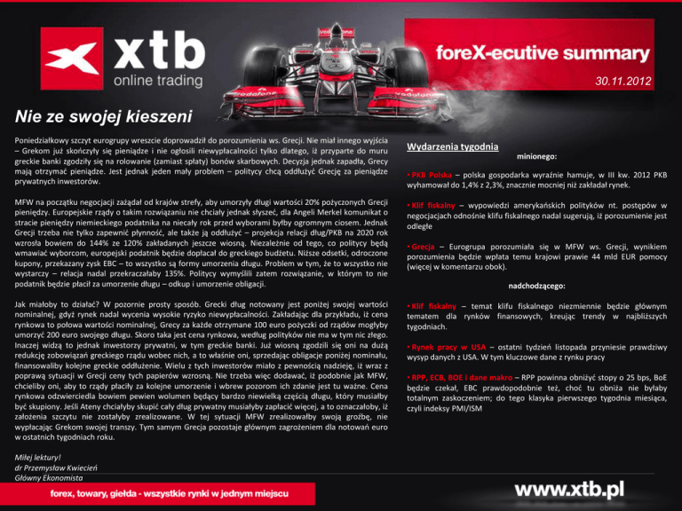 30.11.2012 Nie ze swojej kieszeni Poniedziałkowy szczyt eurogrupy wreszcie doprowadził do porozumienia ws. Grecji. Nie miał innego wyjścia – Grekom już skończyły się pieniądze i nie ogłosili niewypłacalności tylko dlatego, iż przyparte do muru greckie banki zgodziły się na rolowanie (zamiast spłaty) bonów skarbowych. Decyzja jednak zapadła, Grecy mają otrzymać pieniądze. Jest jednak jeden mały problem – politycy chcą oddłużyć Grecję za pieniądze prywatnych inwestorów. Wydarzenia tygodnia minionego: • PKB Polska – polska gospodarka wyraźnie hamuje, w III kw. 2012 PKB wyhamował do 1,4% z 2,3%, znacznie mocniej niż zakładał rynek. MFW na początku negocjacji zażądał od krajów strefy, aby umorzyły długi wartości 20% pożyczonych Grecji pieniędzy. Europejskie rządy o takim rozwiązaniu nie chciały jednak słyszeć, dla Angeli Merkel komunikat o stracie pieniędzy niemieckiego podatnika na niecały rok przed wyborami byłby ogromnym ciosem. Jednak Grecji trzeba nie tylko zapewnić płynność, ale także ją oddłużyć – projekcja relacji dług/PKB na 2020 rok wzrosła bowiem do 144% ze 120% zakładanych jeszcze wiosną. Niezależnie od tego, co politycy będą wmawiać wyborcom, europejski podatnik będzie dopłacał do greckiego budżetu. Niższe odsetki, odroczone kupony, przekazany zysk EBC – to wszystko są formy umorzenia długu. Problem w tym, że to wszystko nie wystarczy – relacja nadal przekraczałaby 135%. Politycy wymyślili zatem rozwiązanie, w którym to nie podatnik będzie płacił za umorzenie długu – odkup i umorzenie obligacji. • Klif fiskalny – wypowiedzi amerykańskich polityków nt. postępów w negocjacjach odnośnie klifu fiskalnego nadal sugerują, iż porozumienie jest odległe Jak miałoby to działać? W pozornie prosty sposób. Grecki dług notowany jest poniżej swojej wartości nominalnej, gdyż rynek nadal wycenia wysokie ryzyko niewypłacalności. Zakładając dla przykładu, iż cena rynkowa to połowa wartości nominalnej, Grecy za każde otrzymane 100 euro pożyczki od rządów mogłyby umorzyć 200 euro swojego długu. Skoro taka jest cena rynkowa, według polityków nie ma w tym nic złego. Inaczej widzą to jednak inwestorzy prywatni, w tym greckie banki. Już wiosną zgodzili się oni na dużą redukcję zobowiązań greckiego rządu wobec nich, a to właśnie oni, sprzedając obligacje poniżej nominału, finansowaliby kolejne greckie oddłużenie. Wielu z tych inwestorów miało z pewnością nadzieję, iż wraz z poprawą sytuacji w Grecji ceny tych papierów wzrosną. Nie trzeba więc dodawać, iż podobnie jak MFW, chcieliby oni, aby to rządy płaciły za kolejne umorzenie i wbrew pozorom ich zdanie jest tu ważne. Cena rynkowa odzwierciedla bowiem pewien wolumen będący bardzo niewielką częścią długu, który musiałby być skupiony. Jeśli Ateny chciałyby skupić cały dług prywatny musiałyby zapłacić więcej, a to oznaczałoby, iż założenia szczytu nie zostałyby zrealizowane. W tej sytuacji MFW zrealizowałby swoją groźbę, nie wypłacając Grekom swojej transzy. Tym samym Grecja pozostaje głównym zagrożeniem dla notowań euro w ostatnich tygodniach roku. • Klif fiskalny – temat klifu fiskalnego niezmiennie będzie głównym tematem dla rynków finansowych, kreując trendy w najbliższych tygodniach. Miłej lektury! dr Przemysław Kwiecień Główny Ekonomista • Grecja – Eurogrupa porozumiała się w MFW ws. Grecji, wynikiem porozumienia będzie wpłata temu krajowi prawie 44 mld EUR pomocy (więcej w komentarzu obok). nadchodzącego: • Rynek pracy w USA – ostatni tydzień listopada przyniesie prawdziwy wysyp danych z USA. W tym kluczowe dane z rynku pracy • RPP, ECB, BOE i dane makro – RPP powinna obniżyć stopy o 25 bps, BoE będzie czekał, EBC prawdopodobnie też, choć tu obniża nie byłaby totalnym zaskoczeniem; do tego klasyka pierwszego tygodnia miesiąca, czyli indeksy PMI/ISM Temat tygodnia: czy hamowanie gospodarki osłabi złotego? Dane o PKB w Polsce za trzeci kwartał były fatalne. W przypadku PKB często jest tak, iż tempo wzrostu nie idzie w parze z jego strukturą. Przykład: w trzecim kwartale amerykańska gospodarka przyspieszyła do 2,7%A, ale ponad połowa tego wzrostu to wydatki rządu federalnego i zapasy (uznawane za nietrwałe komponenty). W przypadku polskich danych mamy jednak pełną zgodność: spadek tempa wzrostu (do 1,4%) oraz słabą strukturę. Dane nie pozostawiają wątpliwości: jest gorzej niż można było przypuszczać. Spowolnienie widoczne jest we wszystkich obszarach gospodarki. Maleje dynamika eksportu, co jest efektem spowolnienia w Europie. Dynamika inwestycji jest już ujemna – wpływ poczynań międzynarodowych korporacji i wygaszania projektów publicznych. Tego jednak można było się spodziewać. Załamanie konsumpcji w trzecim kwartale jest jednak niespodzianką (spodziewaliśmy się raczej jej stopniowego schładzania) i nie rokuje najlepiej na kolejne kwartały. Według bardzo wstępnych prognoz spodziewamy się spowolnienia tempa wzrostu do 0,8% w czwartym kwartale i 0,5% w pierwszym kwartale przyszłego roku – to byłby dołek. W całym bieżącym roku wzrost wyniósłby 2%, w przyszłym zaś już tylko 1,3%. Z odpowiedzią monetarną jest pewien problem, gdyż obecna Rada w ostatnich miesiącach prowadziła bardzo kontrowersyjną politykę. Gdyby jednak założyć, iż od tej pory decyzje Rady będą już oparte wyłącznie na perspektywach makro to obniżka w grudniu powinna być bezdyskusyjna, a w przyszłym roku stopy mogłyby spaść do 3-3,25%. W tym miejscu dochodzimy do sedna problemu: czy słabnąca gospodarka będzie początkiem osłabienia złotego? Teoretycznie są ku temu przesłanki. Dyferencjał na kontraktach FRA w ostatnim czasie pogorszył się dla PLN i po tej publikacji to jeszcze powinno się pogłębić. Niższy wzrost to też problem z budżetem w przyszłym 