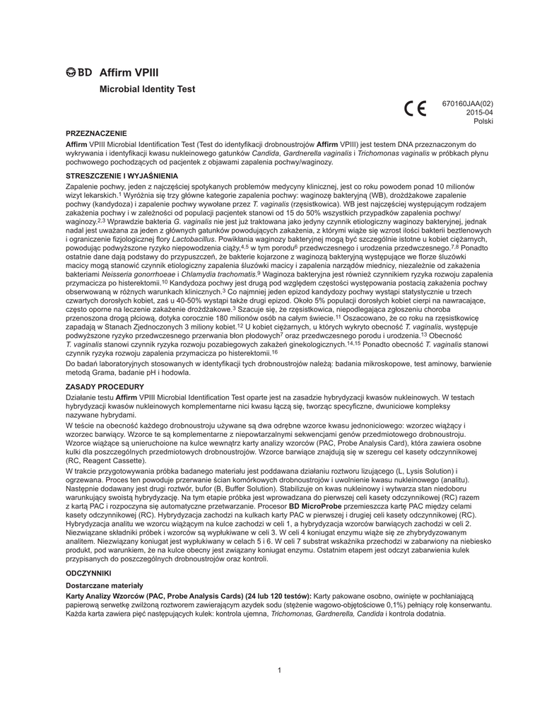 B Affirm VPIII Microbial Identity Test 670160JAA(02) 2015-04 Polski PRZEZNACZENIE Affirm VPIII Microbial Identification Test (Test do identyfikacji drobnoustrojów Affirm VPIII) jest testem DNA przeznaczonym do wykrywania i identyfikacji kwasu nukleinowego gatunków Candida, Gardnerella vaginalis i Trichomonas vaginalis w próbkach płynu pochwowego pochodzących od pacjentek z objawami zapalenia pochwy/waginozy. STRESZCZENIE I WYJAŚNIENIA Zapalenie pochwy, jeden z najczęściej spotykanych problemów medycyny klinicznej, jest co roku powodem ponad 10 milionów wizyt lekarskich.1 Wyróżnia się trzy główne kategorie zapalenia pochwy: waginozę bakteryjną (WB), drożdżakowe zapalenie pochwy (kandydoza) i zapalenie pochwy wywołane przez T. vaginalis (rzęsistkowica). WB jest najczęściej występującym rodzajem zakażenia pochwy i w zależności od populacji pacjentek stanowi od 15 do 50% wszystkich przypadków zapalenia pochwy/ waginozy.2,3 Wprawdzie bakteria G. vaginalis nie jest już traktowana jako jedyny czynnik etiologiczny waginozy bakteryjnej, jednak nadal jest uważana za jeden z głównych gatunków powodujących zakażenia, z którymi wiąże się wzrost ilości bakterii beztlenowych i ograniczenie fizjologicznej flory Lactobacillus. Powikłania waginozy bakteryjnej mogą być szczególnie istotne u kobiet ciężarnych, powodując podwyższone ryzyko niepowodzenia ciąży,4,5 w tym porodu6 przedwczesnego i urodzenia przedwczesnego.7,8 Ponadto ostatnie dane dają podstawy do przypuszczeń, że bakterie kojarzone z waginozą bakteryjną występujące we florze śluzówki macicy mogą stanowić czynnik etiologiczny zapalenia śluzówki macicy i zapalenia narządów miednicy, niezależnie od zakażenia bakteriami Neisseria gonorrhoeae i Chlamydia trachomatis.9 Waginoza bakteryjna jest również czynnikiem ryzyka rozwoju zapalenia przymacicza po histerektomii.10 Kandydoza pochwy jest drugą pod względem częstości występowania postacią zakażenia pochwy obserwowaną w różnych warunkach klinicznych.3 Co najmniej jeden epizod kandydozy pochwy wystąpi statystycznie u trzech czwartych dorosłych kobiet, zaś u 40-50% wystąpi także drugi epizod. Około 5% populacji dorosłych kobiet cierpi na nawracające, często oporne na leczenie zakażenie drożdżakowe.3 Szacuje się, że rzęsistkowica, niepodlegająca zgłoszeniu choroba przenoszona drogą płciową, dotyka corocznie 180 milionów osób na całym świecie.11 Oszacowano, że co roku na rzęsistkowicę zapadają w Stanach Zjednoczonych 3 miliony kobiet.12 U kobiet ciężarnych, u których wykryto obecność T. vaginalis, występuje podwyższone ryzyko przedwczesnego przerwania błon płodowych7 oraz przedwczesnego porodu i urodzenia.13 Obecność T. vaginalis stanowi czynnik ryzyka rozwoju pozabiegowych zakażeń ginekologicznych.14,15 Ponadto obecność T. vaginalis stanowi czynnik ryzyka rozwoju zapalenia przymacicza po histerektomii.16 Do badań laboratoryjnych stosowanych w identyfikacji tych drobnoustrojów należą: badania mikroskopowe, test aminowy, barwienie metodą Grama, badanie pH i hodowla. ZASADY PROCEDURY Działanie testu Affirm VPIII Microbial Identification Test oparte jest na zasadzie hybrydyzacji kwasów nukleinowych. W testach hybrydyzacji kwasów nukleinowych komplementarne nici kwasu łączą się, tworząc specyficzne, dwuniciowe kompleksy nazywane hybrydami. W teście na obecność każdego drobnoustroju używane są dwa odrębne wzorce kwasu jednoniciowego: wzorzec wiążący i wzorzec barwiący. Wzorce te są komplementarne z niepowtarzalnymi sekwencjami genów przedmiotowego drobnoustroju. Wzorce wiążące są unieruchoione na kulce wewnątrz karty analizy wzorców (PAC, Probe Analysis Card), która zawiera osobne kulki dla poszczególnych przedmiotowych drobnoustrojów. Wzorce barwiące znajdują się w szeregu cel kasety odczynnikowej (RC, Reagent Cassette). W trakcie przygotowywania próbka badanego materiału jest poddawana działaniu roztworu lizującego (L, Lysis Solution) i ogrzewana. Proces ten powoduje przerwanie ścian komórkowych drobnoustrojów i uwolnienie kwasu nukleinowego (analitu). Następnie dodawany jest drugi roztwór, bufor (B, Buffer Solution). Stabilizuje on kwas nukleinowy i wytwarza stan niedoboru warunkujący swoistą hybrydyzację. Na tym etapie próbka jest wprowadzana do pierwszej celi kasety odczynnikowej (RC) razem z kartą PAC i rozpoczyna się automatyczne przetwarzanie. Procesor BD MicroProbe przemieszcza kartę PAC między celami kasety odczynnikowej (RC). Hybrydyzacja zachodzi na kulkach karty PAC w pierwszej i drugiej celi kasety odczynnikowej (RC). Hybrydyzacja analitu we wzorcu wiążącym na kulce zachodzi w celi 1, a hybrydyzacja wzorców barwiących zachodzi w celi 2. Niezwiązane składniki próbek i wzorców są wypłukiwane w celi 3. W celi 4 koniugat enzymu wiąże się ze zhybrydyzowanym analitem. Niezwiązany koniugat jest wypłukiwany w celach 5 i 6. W celi 7 substrat wskaźnika przechodzi w zabarwiony na niebiesko produkt, pod warunkiem, że na kulce obecny jest związany koniugat enzymu. Ostatnim etapem jest odczyt zabarwienia kulek przypisanych do poszczególnych drobnoustrojów oraz kontroli. ODCZYNNIKI Dostarczane materiały Karty Analizy Wzorców (PAC, Probe Analysis Cards) (24 lub 120 testów): Karty pakowane osobno, owinięte w pochłaniającą papierową serwetkę zwilżoną roztworem zawierającym azydek sodu (stężenie wagowo-objętościowe 0,1%) pełniący rolę konserwantu. Każda karta zawiera pięć następujących kulek: kontrola ujemna, Trichomonas, Gardnerella, Candida i kontrola dodatnia. 1 Kasety Odczynnikowe (RC, Reagent Cassettes) (24 lub 120 testów): Odczynniki znajdują się w szczelnie zamkniętych, pokrytych folią kasetach z szeregiem cel. Każda kaseta ma siedem cel. Zawierają one (numeracja od przodu ku tyłowi kasety): Cela nr 1 Zbiornik na próbki pochodzące od pacjentki, fabrycznie pusty Cela nr 2 Roztwó