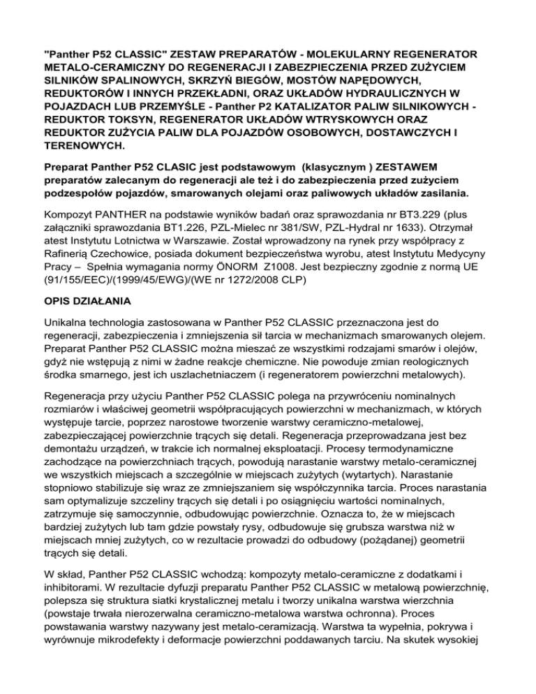 "Panther P52 CLASSIC" ZESTAW PREPARATÓW - MOLEKULARNY REGENERATOR METALO-CERAMICZNY DO REGENERACJI I ZABEZPIECZENIA PRZED ZUŻYCIEM SILNIKÓW SPALINOWYCH, SKRZYŃ BIEGÓW, MOSTÓW NAPĘDOWYCH, REDUKTORÓW I INNYCH PRZEKŁADNI, ORAZ UKŁADÓW HYDRAULICZNYCH W POJAZDACH LUB PRZEMYŚLE - Panther P2 KATALIZATOR PALIW SILNIKOWYCH REDUKTOR TOKSYN, REGENERATOR UKŁADÓW WTRYSKOWYCH ORAZ REDUKTOR ZUŻYCIA PALIW DLA POJAZDÓW OSOBOWYCH, DOSTAWCZYCH I TERENOWYCH. Preparat Panther P52 CLASIC jest podstawowym (klasycznym ) ZESTAWEM preparatów zalecanym do regeneracji ale też i do zabezpieczenia przed zużyciem podzespołów pojazdów, smarowanych olejami oraz paliwowych układów zasilania. Kompozyt PANTHER na podstawie wyników badań oraz sprawozdania nr BT3.229 (plus załączniki sprawozdania BT1.226, PZL-Mielec nr 381/SW, PZL-Hydral nr 1633). Otrzymał atest Instytutu Lotnictwa w Warszawie. Został wprowadzony na rynek przy współpracy z Rafinerią Czechowice, posiada dokument bezpieczeństwa wyrobu, atest Instytutu Medycyny Pracy – Spełnia wymagania normy ÖNORM Z1008. Jest bezpieczny zgodnie z normą UE (91/155/EEC)/(1999/45/EWG)/(WE nr 1272/2008 CLP) OPIS DZIAŁANIA Unikalna technologia zastosowana w Panther P52 CLASSIC przeznaczona jest do regeneracji, zabezpieczenia i zmniejszenia sił tarcia w mechanizmach smarowanych olejem. Preparat Panther P52 CLASSIC można mieszać ze wszystkimi rodzajami smarów i olejów, gdyż nie wstępują z nimi w żadne reakcje chemiczne. Nie powoduje zmian reologicznych środka smarnego, jest ich uszlachetniaczem (i regeneratorem powierzchni metalowych). Regeneracja przy użyciu Panther P52 CLASSIC polega na przywróceniu nominalnych rozmiarów i właściwej geometrii współpracujących powierzchni w mechanizmach, w których występuje tarcie, poprzez narostowe tworzenie warstwy ceramiczno-metalowej, zabezpieczającej powierzchnie trących się detali. Regeneracja przeprowadzana jest bez demontażu urządzeń, w trakcie ich normalnej eksploatacji. Procesy termodynamiczne zachodzące na powierzchniach trących, powodują narastanie warstwy metalo-ceramicznej we wszystkich miejscach a szczególnie w miejscach zużytych (wytartych). Narastanie stopniowo stabilizuje się wraz ze zmniejszaniem się współczynnika tarcia. Proces narastania sam optymalizuje szczeliny trących się detali i po osiągnięciu wartości nominalnych, zatrzymuje się samoczynnie, odbudowując powierzchnie. Oznacza to, że w miejscach bardziej zużytych lub tam gdzie powstały rysy, odbudowuje się grubsza warstwa niż w miejscach mniej zużytych, co w rezultacie prowadzi do odbudowy (pożądanej) geometrii trących się detali. W skład, Panther P52 CLASSIC wchodzą: kompozyty metalo-ceramiczne z dodatkami i inhibitorami. W rezultacie dyfuzji preparatu Panther P52 CLASSIC w metalową powierzchnię, polepsza się struktura siatki krystalicznej metalu i tworzy unikalna warstwa wierzchnia (powstaje trwała nierozerwalna ceramiczno-metalowa warstwa ochronna). Proces powstawania warstwy nazywany jest metalo-ceramizacją. Warstwa ta wypełnia, pokrywa i wyrównuje mikrodefekty i deformacje powierzchni poddawanych tarciu. Na skutek wysokiej temperatury, powstającej w miejscach lokalnego tarcia, następuje „zespalanie” cząsteczek Panther P52 CLASSIC. Stopione cząsteczki Panther P52 CLASSIC charakteryzują się wysokim stopniem adhezji z metalem, przenoszą cząsteczki metalu w zużyte miejsca, gdzie występuje najwyższa temperatura, spowodowana tarciem i tam dyfundują. W tych miejscach połączone cząsteczki metalu i Panther P52 CLASSIC (dyfundując), odbudowują powierzchnie, tworząc warstwę ceramiczno-metalową. Panther P52 CLASSIC należy stosować przede wszystkim do remontu oraz profilaktycznie, dla zabezpieczenia mechanizmów przed skutkami tarcia, przedłużając znacząco ich żywotność i czas bezawaryjnej pracy. Trwałość nowo utworzonej warstwy wierzchniej jest znacznie większa i nie posiada żadnych znanych odpowiedników tak z uwagi na przewodność cieplną jak i ścieralność. Nanotechnologia Panther GP ( P52 ) jest inżynierią materiałowa na poziomie molekularnym. Zasadnicze parametry warstwy ceramiczno-metalowej powstałej po obróbce: ● Współczynnik tarcia kinematycznego: 0,015 – tj. 10-cio krotnie mniejszy niż w przypadku urządzeń smarowanych tylko olejem lub smarem. (Współczynnik tarcia pary trącej stal po stali w oleju wynosi 0,15). ● Mikrotwardość – 4000-4500 MPa (400 – 450 kg/mm2) (dla porównania mikrotwardość stali wynosi przeciętnie 600 MPa (60 kg/mm2) ● Wytrzymałość na ściskanie: 2500 MPa (250 kg/mm2); ● Wysoka odporność obrobionej preparatem PANTHER P52 powierzchni na korozję agresywnymi substancjami chemicznymi. KORZYŚCI EKSPLOATACYJNE TECHNOLOGII PANTHER P52 Remont, regeneracja i odbudowa geometrii detali w trakcie ich eksploatacji, poprzez tworzenie warstwy metalo-ceramicznej wypełniającej, pokrywającej i wyrównującej porysowania, defekty i wyżłobienia. 1.Nie trzeba demontować ani też wyłączać z eksploatacji mechanizmu, aby go wyremontować i zabezpieczyć przed tarciem. 2.W przypadku całkowitego (awaryjnego) wycieku oleju ze skrzyni biegów lub reduktora tylnego mostu – możliwość krótkotrwałej kontynuacji jazdy bez uszkodzenia mechanizmów. Znacznie zwiększa bezpieczeństwo i niezawodności mechanizmów, co nie jest bez znaczenia w ekstremalnych warunkach eksploatacji. 3.Zmniejszenie współczynnika tarcia spowodowane powstałą w procesie warstwą metaloceramiczną tym samym zwiększenie sprawności mechanizmu – mocy silnika. 4.Zabezpiecza przed skutkami niepożądanego tarcia i wydatne zmniejsza współczynnik tarcia (do wartości po niżej 0,02), tym samym obniża wytwarzanie ciepła pomiędzy trącymi się metalowymi częściami. 5.Technologia zatrzymuje i zapobiega powstawaniu pittingu. 6.Powoduje zmniejszenie drgań i hałasu. 7.Podnosi i wyrównuje ciśnienie sprężania do 