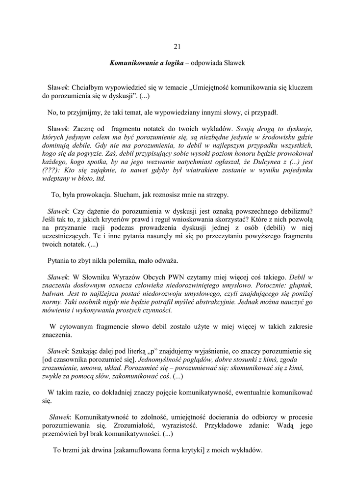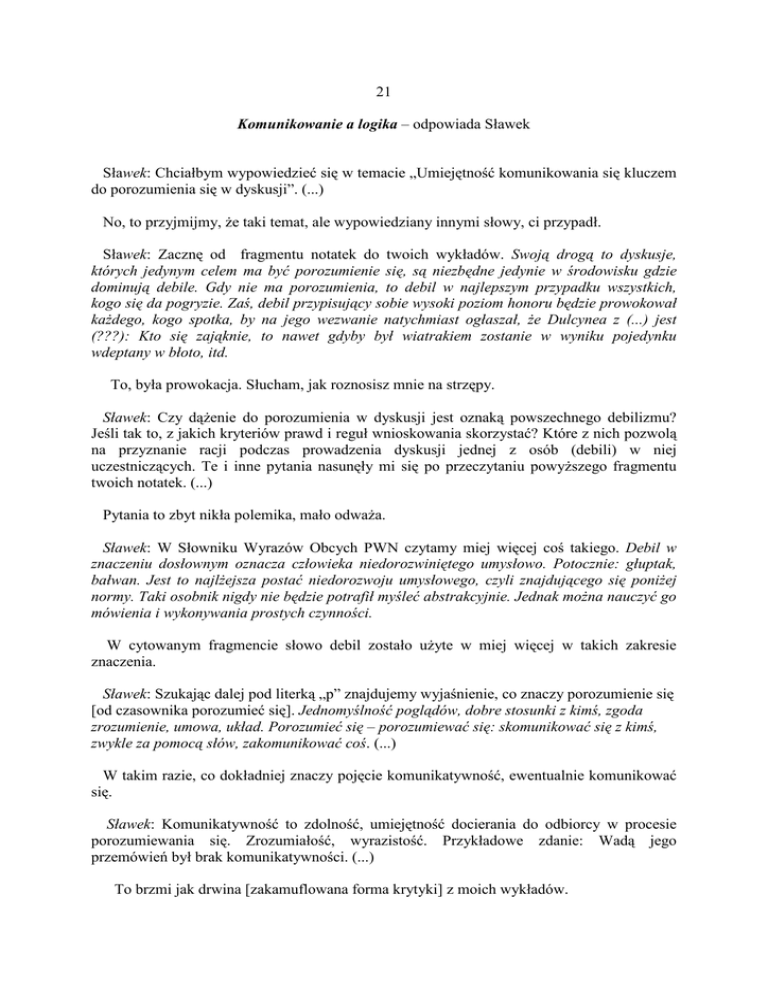 21 Komunikowanie a logika – odpowiada Sławek Sławek: Chciałbym wypowiedzieć się w temacie „Umiejętność komunikowania się kluczem do porozumienia się w dyskusji”. (...) No, to przyjmijmy, Ŝe taki temat, ale wypowiedziany innymi słowy, ci przypadł. Sławek: Zacznę od fragmentu notatek do twoich wykładów. Swoją drogą to dyskusje, których jedynym celem ma być porozumienie się, są niezbędne jedynie w środowisku gdzie dominują debile. Gdy nie ma porozumienia, to debil w najlepszym przypadku wszystkich, kogo się da pogryzie. Zaś, debil przypisujący sobie wysoki poziom honoru będzie prowokował kaŜdego, kogo spotka, by na jego wezwanie natychmiast ogłaszał, Ŝe Dulcynea z (...) jest (???): Kto się zająknie, to nawet gdyby był wiatrakiem zostanie w wyniku pojedynku wdeptany w błoto, itd. To, była prowokacja. Słucham, jak roznosisz mnie na strzępy. Sławek: Czy dąŜenie do porozumienia w dyskusji jest oznaką powszechnego debilizmu? Jeśli tak to, z jakich kryteriów prawd i reguł wnioskowania skorzystać? Które z nich pozwolą na przyznanie racji podczas prowadzenia dyskusji jednej z osób (debili) w niej uczestniczących. Te i inne pytania nasunęły mi się po przeczytaniu powyŜszego fragmentu twoich notatek. (...) Pytania to zbyt nikła polemika, mało odwaŜa. Sławek: W Słowniku Wyrazów Obcych PWN czytamy miej więcej coś takiego. Debil w znaczeniu dosłownym oznacza człowieka niedorozwiniętego umysłowo. Potocznie: głuptak, bałwan. Jest to najlŜejsza postać niedorozwoju umysłowego, czyli znajdującego się poniŜej normy. Taki osobnik nigdy nie będzie potrafił myśleć abstrakcyjnie. Jednak moŜna nauczyć go mówienia i wykonywania prostych czynności. W cytowanym fragmencie słowo debil zostało uŜyte w miej więcej w takich zakresie znaczenia. Sławek: Szukając dalej pod literką „p” znajdujemy wyjaśnienie, co znaczy porozumienie się [od czasownika porozumieć się]. Jednomyślność poglądów, dobre stosunki z kimś, zgoda zrozumienie, umowa, układ. Porozumieć się – porozumiewać się: skomunikować się z kimś, zwykle za pomocą słów, zakomunikować coś. (...) W takim razie, co dokładniej znaczy pojęcie komunikatywność, ewentualnie komunikować się. Sławek: Komunikatywność to zdolność, umiejętność docierania do odbiorcy w procesie porozumiewania się. Zrozumiałość, wyrazistość. Przykładowe zdanie: Wadą jego przemówień był brak komunikatywności. (...) To brzmi jak drwina [zakamuflowana forma krytyki] z moich wykładów. Sławek: Umiejętność porozumienia się i komunikowania nie jest wcale taką prostą czynnością. Dlatego przystępując do dyskusji musimy mieć opanowane te umiejętności tak, aby ktokolwiek mógł nas zrozumieć. (...) Ktokolwiek, to takŜe autor wypowiedzi. Autorowi zwykle wydaje się, Ŝe wie, co mówi. Sławek: Słowny przekaz informacji, nie mówiąc juŜ o przekazywaniu sobie znanych prawd musi zmierzać do tego, aby przekonać słuchacza. Nawet wtedy gdyby to był debil czy imbecyl. (...) Co do tego to zgody między nami nie ma. Sławek: Umiejętności wysławiania się, stanowi siłę samą w sobie podczas prowadzonej dyskusji. Docenił to takŜe Platon w dialogu „Eutydem” Cytuję:„Dionizodoros nachyla mi się odrobinę do ucha, cała twarz mu się śmieje i mówi: Wiesz, Sokratesie, ja ci z góry mówię, Ŝe jakkolwiek chłopak odpowie, zostanie zbity”. Na co Sokrates odpowiedział „PrzecieŜ naprzód, jak mówił Prodikos, trzeba się nauczyć o właściwym uŜywaniu słów”; Dalej Sokrates komentował „A tyś nie zwrócił uwagi na to, Ŝe ten sam wyraz oznacza stan ludzi o cechach wprost przeciwnych, i tych, co mają wiedzę, i tych, co nie.” Tu widzimy, jakie zagroŜenie wyniknęło z braku tejŜe umiejętności. Niezrozumienie przez drugą stronę, czyli brak komunikatywności. (...) No i mnie się wszystko zgadza. Właściwe uŜywanie słów to jedna z umiejętności, poprzez którą demonstrujemy zdolność do abstrakcyjnego myślenia. Gdy tej umiejętności nie mamy dobrze opanowanej, to zręczny adwersarz bez trudu przerobi nas w imbecyla. Sławek: No, to zadajmy sobie pytanie. Czy mamy prawo ocenić, Ŝe ten uczeń z dialogu „Etudem” był debilem. On jedynie dąŜył do porozumienia podczas dyskusji. Usiłował przekonać adwersarzy. (...) Twoim zdaniem pewnie absolutnie nie. On brał udział w dyskusji, w której powinien się spodziewać podstępów. Niemym uczestnikiem tej dyskusji był takŜe Sokrates, który podstęp wykrył. W takim kontekście brak podstaw do oceny ucznia. Uczeń miał za zadanie stworzyć tło, na którym popisze się mistrz. Sławek: Takie podejście ustawia nas [uczniów, studentów lub słuchaczy] w roli debili. PrzecieŜ istotą człowieczeństwa jest umiejętność komunikowania się i dąŜenie do porozumienia się. Dzięki temu jesteśmy w stanie rozwiązywać nasze problemy przez dyskusje. (...) Nie znam przyczyn, dla których jacyś rywale lub adwersarze mieliby człowieczeństwo tak rozumieć. Znam za to przysłowie: Gdzie dwóch się bije, tam zwykle trzeci korzysta. Zaś rywalizacja zwykle polega na wykorzystywaniu słabych stron przeciwnika. Sławek: Gdyby tak rzeczywiście było, to efektem powinna być wynikająca z tego powszechna frustracja. A nie trzeba nikogo przekonywać, iŜ nasilająca się frustracja zamienia się w agresję, która zostaje skierowana w obiekt, który ją wywołał.(...) A ja sugerowałem, Ŝe tego rodzaju frustracja jest objawem debilizmu. Zaś agresja debila zwykle jest rozładowywana, poprzez szczekanie na obcego [podporządkowywaniu się ceremonii szczucia] i gryzieniu, kogo się tylko da. Kundel szczeka na obcego, gdy ten przybliŜa się do jego terenu lub miski. Uczeń szczeka na nauczyciela, gdy ten odkrywa braki w jego wykształceniu. W obu przypadkach jest to prawda pod warunkiem ograniczonej inteligencji i silnej frustracji. Sławek: UwaŜam, Ŝe twoj