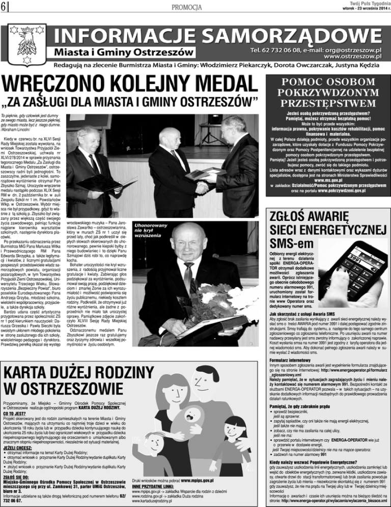 6 WRÊCZONO KOLEJNY MEDAL „ZA ZAS£UGI DLA MIASTA I GMINY OSTRZESZÓW” wtorek - 23 wrzeœnia 2014 r. POMOC OSOBOM POKRZYWDZONYM PRZESTÊPSTWEM Jesteœ osob¹ pokrzywdzon¹ przestêpstwem? Pamiêtaj, mo¿esz otrzymaæ bezp³atn¹ pomoc! Mo¿e to byæ przede wszystkim: informacja prawna, pokrywanie kosztów rehabilitacji, pomoc finansowa i materialna. W ca³ej Polsce dzia³aj¹ podmioty, przede wszystkim organizacje pozarz¹dowe, które uzyska³y dotacje z Funduszu Pomocy Pokrzywdzonym oraz Pomocy Postpenitencjarnej na udzielenie bezp³atnej pomocy osobom pokrzywdzonym przestêpstwem. Pamiêtaj! Je¿eli jesteœ osob¹ pokrzywdzon¹ przestêpstwem i potrzebujesz pomocy, zwróæ siê do takiego podmiotu. Lista adresów wraz z danymi kontaktowymi oraz wykazami dy¿urów specjalistów, dostêpna jest na stronach Ministerstwa Sprawiedliwoœci www.ms.gov.pl w zak³adce: Dzia³alnoœæ/Pomoc pokrzywdzonym przestêpstwem oraz na portalu www.pokrzywdzeni.gov.pl To piêknie, gdy cz³owiek jest dumny ze swego miasta, lecz jeszcze piêkniej, gdy miasto mo¿e byæ z niego dumne. /Abraham Lincoln/ Kiedy w czerwcu br. na XLVI Sesji Rady Miejskiej zosta³a wywo³ana, na wniosek Towarzystwa Przyjació³ Ziemi Ostrzeszowskiej, uchwa³a nr XLVI/278/2014 w sprawie przyznania tegorocznego Medalu „Za Zas³ugi dla Miasta i Gminy Ostrzeszów”, ostrzeszowscy radni byli jednog³oœni. To zaszczytne, jedenaste z kolei, samorz¹dowe wyró¿nienie otrzyma³ Pan Zbyszko Szmaj. Uroczyste wrêczenie medalu nast¹pi³o podczas XLIX Sesji RM w dn. 2 paŸdziernika br. w auli Zespo³u Szkó³ nr 1 im. Powstañców Wlkp. w Ostrzeszowie. Wybór miejsca nie by³ przypadkowy, gdy¿ to w³aœnie z t¹ szko³¹ p. Zbyszko by³ zwi¹zany przez wiêksz¹ czêœæ swojego ¿ycia zawodowego, pe³ni¹c funkcjê najpierw kierownika warsztatów szkolnych, nastêpnie dyrektora placówki. Po przekazaniu odznaczenia przez Burmistrza MiG Pana Mariusza Witka i Przewodnicz¹cego RM Pana Edwarda Skrzypka, a tak¿e legitymacji i kwiatów, z licznymi gratulacjami pospieszyli: przedstawiciele w³adz samorz¹dowych powiatu, organizacji pozarz¹dowych, w tym Towarzystwa Przyjació³ Ziemi Ostrzeszowskiej, Uniwersytetu Trzeciego Wieku, Stowarzyszenia „Bezpieczny Powiat”, biuro poselskie Eurodeputowanego Pana Andrzeja Grzyba, m³odzie¿ szkolna, wieloletni wspó³pracownicy, przyjaciele, a tak¿e dyrekcja szko³y. Bardzo udana czêœæ artystyczna przygotowana przez spo³ecznoœæ ZS nr 1 pod kierunkiem nauczycieli: Dariusza Grzesika i Paw³a Sieczki by³a swoistym uk³onem m³odego pokolenia w stronê zas³u¿onego dla ich szko³y, wieloletniego pedagoga i dyrektora. Prawdziw¹ pere³k¹ okaza³ siê wystêp Twój Puls Tygodnia PROMOCJA wroc³awskiego muzyka – Pana Jaros³awa Zawartko – ostrzeszowianina, który w murach ZS nr 1 uczy³ siê przed laty, choæ jak podkreœli³ w ciep³ych s³owach skierowanych do uhonorowanego, pewnie kiepski by³by z niego budowlaniec i to dziêki Panu Szmajowi dziœ robi to, co naprawdê kocha. Bohater uroczystoœci nie kry³ wzruszenia, z radoœci¹ przyjmowa³ liczne gratulacje i kwiaty. Zabieraj¹c g³os podziêkowa³ za wyró¿nienie, podsumowa³ swoj¹ pracê, podziêkowa³ dzieciom i zmar³ej ¯onie za ich wyrozumia³oœæ i mo¿liwoœæ poœwiêcenia siê ¿yciu publicznemu, niekiedy kosztem rodziny. Podkreœli³, ¿e otrzymywa³ ju¿ ró¿ne wyró¿nienia, ale ¿adne z poprzednich nie mia³o tak uroczystej oprawy. Pami¹tkowe zdjêcie zakoñczy³o XLVIII Sesjê Rady Miejskiej Ostrzeszów. Odznaczonemu medalem Panu Zbyszkowi jeszcze raz gratulujemy oraz ¿yczymy zdrowia i wszelkiej pomyœlnoœci w ¿yciu osobistym. Uhonorowany nie kry³ wzruszenia Odbiorcy energii elektrycznej z terenu dzia³ania spó³ki ENERGA-OPERATOR otrzymali dodatkowe mo¿liwoœci zg³aszania awarii. Oprócz istniej¹cego obecnie ca³odobowego numeru alarmowego 991, uruchomiony zosta³ formularz internetowy na tronie www Operatora oraz dedykowany numer sms. Jak skorzystaæ z us³ugi Awaria SMS Aby zg³osiæ brak zasilania wynikaj¹cy z awarii sieci energetycznej nale¿y wys³aæ sms o treœci AWARIA pod numer 3991 i dalej postêpowaæ zgodnie zinstrukcjami. Smsy trafiaj¹ do systemu, a nastêpnie do tego samego centrum zg³oszeniowego co zg³oszenia telefoniczne. Po usuniêciu awarii na numer nadawcy przesy³any jest sms zwrotny informuj¹cy o zakoñczonej naprawie. Koszt wys³ania smsa na numer 3991 jest zgodny z taryf¹ operatora dla jednej wiadomoœci sms. Aby dokonaæ pe³nego zg³oszenia awarii nale¿y w sumie wys³aæ 2 wiadomoœci sms. KARTA DU¯EJ RODZINY W OSTRZESZOWIE Przypominamy, ¿e Miejsko – Gminny Oœrodek Pomocy Spo³ecznej w Ostrzeszowie realizuje ogólnopolski program KARTA DU¯EJ RODZINY. CO TO JEST? Projekt skierowany jest do rodzin zamieszka³ych na terenie Miasta i Gminy Ostrzeszów, maj¹cych na utrzymaniu co najmniej troje dzieci w wieku do ukoñczenia 18 roku ¿ycia lub w przypadku dziecka kontynuuj¹cego naukê do ukoñczenia 25 roku ¿ycia lub bez ograniczeñ wiekowych w przypadku dziecka niepe³nosprawnego legitymuj¹cego siê orzeczeniem o umiarkowanym albo znacznym stopniu niepe³nosprawnoœci, niezale¿nie od sytuacji materialnej. JE¯ELI CHCESZ: • otrzymaæ informacje na temat Karty Du¿ej Rodziny; • otrzymaæ wniosek o przyznanie Karty Du¿ej Rodziny/wydanie duplikatu Karty Du¿ej Rodziny; • z³o¿yæ wniosek o przyznanie Karty Du¿ej Rodziny/wydanie duplikatu Karty Du¿ej Rodziny; ZG£OŒ SIÊ DO: Miejsko-Gminnego Oœrodka Pomocy Spo³ecznej w Ostrzeszowie mieszcz¹cego siê przy ul. Zamkowej 31, parter UMiG Ostrzeszów, biuro nr 3. Informacje udzielane s¹ tak¿e drog¹ telefoniczn¹ pod numerem telefonu 62/ 732 06 67. ZG£OŒ AWARIÊ SIECI ENERGETYCZNEJ SMS-em Formularz internetowy Innym sposobem zg³oszenia awarii jest wype³nienie formularza znajduj¹cego siê na stronie Internetowej: http://www.energaoperator.pl/formularz _zgloszeniowy.xml Nale¿y pamiêtaæ, ¿e w sytuacjach 