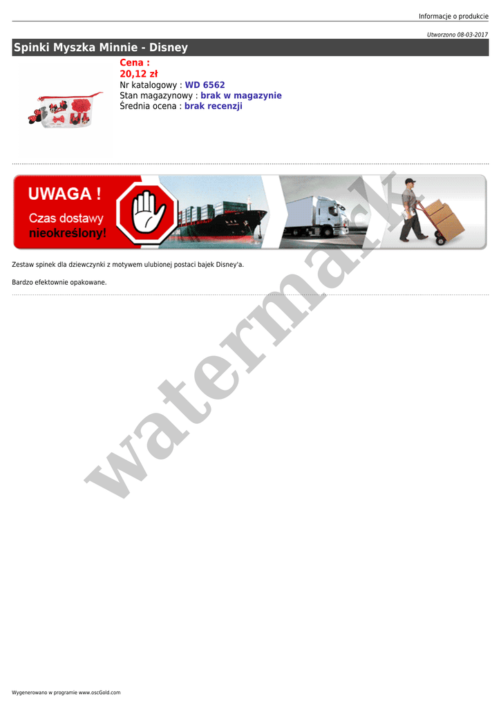 Informacje o produkcie Utworzono 08-03-2017 Spinki Myszka Minnie - Disney Cena : 20,12 zł er m ar k Nr katalogowy : WD 6562 Stan magazynowy : brak w magazynie Średnia ocena : brak recenzji Zestaw spinek dla dziewczynki z motywem ulubionej postaci bajek Disney'a. w at Bardzo efektownie opakowane. Wygenerowano w programie www.oscGold.com