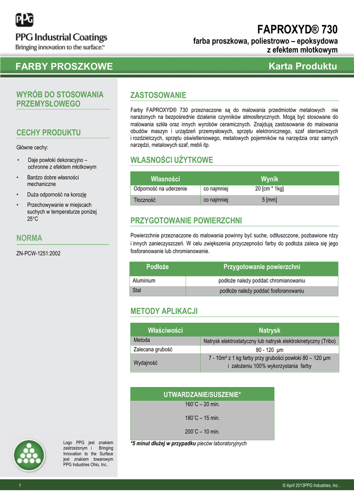 FAPROXYD® 730 S farba proszkowa, poliestrowo – epoksydowa z efektem młotkowym Karta Produktu FARBY PROSZKOWE WYRÓB DO STOSOWANIA PRZEMYSŁOWEGO ZASTOSOWANIE Główne cechy: Farby FAPROXYD® 730 przeznaczone są do malowania przedmiotów metalowych nie narażonych na bezpośrednie działanie czynników atmosferycznych. Mogą być stosowane do malowania szkła oraz innych wyrobów ceramicznych. Znajdują zastosowanie do malowania obudów maszyn i urządzeń przemysłowych, sprzętu elektronicznego, szaf sterowniczych i rozdzielczych, sprzętu oświetleniowego, metalowych pojemników na narzędzia oraz samych narzędzi, metalowych szaf, mebli itp. • Daje powłoki dekoracyjno – ochronne z efektem młotkowym WŁASNOŚCI UŻYTKOWE • Bardzo dobre własności mechaniczne • Duża odporność na korozję • Przechowywanie w miejscach suchych w temperaturze poniżej 25°C CECHY PRODUKTU Własności Wynik Odporność na uderzenie co najmniej 20 [cm * 1kg] Tłoczność co najmniej 5 [mm] PRZYGOTOWANIE POWIERZCHNI Powierzchnie przeznaczone do malowania powinny być suche, odtłuszczone, pozbawione rdzy i innych zanieczyszczeń. W celu zwiększenia przyczepności farby do podłoża zaleca się jego fosforanowanie lub chromianowanie. NORMA ZN-PCW-1251:2002 Podłoże Przygotowanie powierzchni Aluminium podłoże należy poddać chromianowaniu Stal podłoże należy poddać fosforanowaniu METODY APLIKACJI Właściwości Metoda Natrysk elektrostatyczny lub natrysk elektrokinetyczny (Tribo) Zalecana grubość Wydajność Natrysk 80 - 120 μm 7 - 10m² z 1 kg farby przy grubości powłoki 80 – 120 µm i założeniu 100% wykorzystania farby UTWARDZANIE/SUSZENIE* 160˚C – 20 min. 180˚C – 15 min. 200˚C – 10 min. Logo PPG jest znakiem zastrzeżonym i Bringing Innovation to the Surface jest znakiem towarowym PPG Industries Ohio, Inc.. 1 *5 minut dłużej w przypadku pieców laboratoryjnych © April 2013PPG Industries, Inc. . FAPROXYD® 730 S farba proszkowa, poliestrowo – epoksydowa z efektem młotkowym Karta Produktu FARBY PROSZKOWE INFORMACJE BHP Farby proszkowe stwarzają pewne zagrożenie wybuchowe. Należy więc: • • • • unikać gromadzenia się osadów farby proszkowej poza urządzeniami i pojemnikami, stosować wyłącznie urządzenia elektryczne pyłoszczelne zgodnie z normą PN-79/E-08106, instalować i konserwować uziemienia wszystkich elementów metalowych stykających się z farbą proszkową unoszoną przez powietrze, prowadzić okresowe czyszczenie i badanie izolacji urządzeń napylających (pistoletów), pod kątem narażenia na przebicie elektryczne. Dane techniczne zawarte w niniejszym dokumencie oparte są o informacje uważane przez PPG jako obecnie prawidłowe. Niemniej jednak żadna gwarancja dotycząca dokładności, pełności informacji czy też osiągów nie jest dana ani implikowana. Ciągłe prace nad udoskonalaniem technologii farb powodują, że przyszłe dane techniczne mogą nieco różnić się od tych podawanych w niniejszym dokumencie. Prosimy o kontakt z przedstawicielem PPG w celu uzyskania najbardziej aktualnych informacji. PPG Polifarb Cieszyn S.A. Cieszyn, POLAND Tel: +48 33 851 71 00 Fax: +48 33 852 24 93 PPG Coatings Deutschland GmbH Bochum, GERMANY Tel: +49 234 8690 PPG Industries France S.A Saultain, FRANCE Tel: +33 3 27 14 97 00 Fax: +33 3 27 14 98 94 PPG Industries Italia Spa Quattordio, ITALY Tel: + 39 131 7701 Fax: +39 131 773 753 PPG Industrial Coatings B.V. Veenendaal, NETHERLANDS Tel.: +31 318 567 800 PPG Iberica S.A Rubi (Barcelona), SPAIN Tel: +34 93 586 7429 Fax: +34 93 586 7430 PPG Dr. A. Schoch AG (Ltd.) Burgdof, SWITZERLAND Tel : +41 421 42 42 Fax: +41 421 42 99 PPG Industries (UK) Ltd Birmingham, UK Tel.: +44 121 423 7345 Fax: +44 121 423 7303 PPG Industries Sales, inc Istanbul, TURKEY Tel: +90 212 286 2150 Fax: +90 212 286 21 59 PPG WEB SITES: www.ppg.com & www.ppgindustrialcoatings.com 2 © April 2013PPG Industries, Inc. .