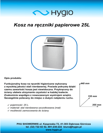 Kosz na ręczniki papierowe 25L Opiswproduktu Funkcjonalnywkoszwnawręcznikiwhigienicznewwykonany zwwysokiejwjakościwstaliwnierdzewnejhwPosiadawpokrywęwdziękiw czemuwzawartośćwkoszawjestwniewidocznahwPrzykręconywdow ścianywułatwiawutrzymaniewczystościwwwkażdejwtoaleciehww Znakomiciewwspółgrawzwnowoczesnymwwystrojemwwnętrzh Szczególniewpolecanywdowmiejscwowdużymwnatężeniuwruchuhw 440 mm 155 mm pojemność: 25 L materiał: stal nierdzewna szczotkowana (mat) możliwość zamocowania do ściany PHUwSHOWERWISwulhwKasprzakaw7F9wmd@jgjwDąbrowawGórniczaw telhw(jF)w7FFwgFwZF9w69d@Fjg@FFFwwbiuro@hygiohpl wwwhhygiohpl 355 mm