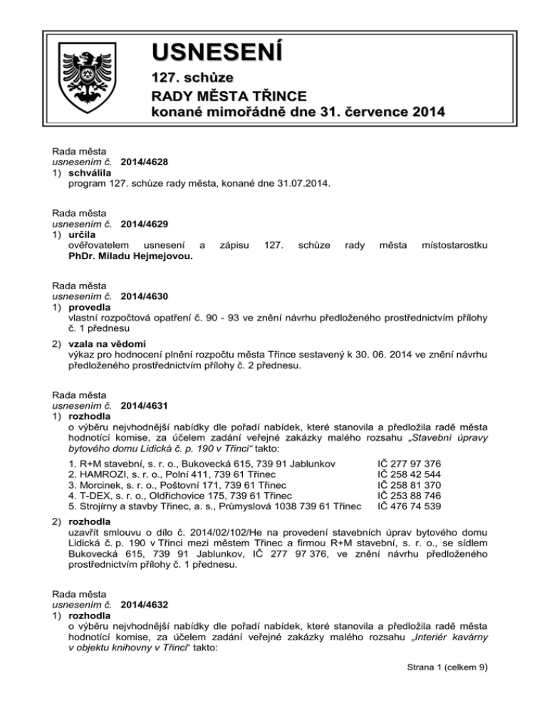 USNESENÍ 127. schůze RADY MĚSTA TŘINCE konané mimořádně dne 31. července 2014 Rada města usnesením č. 2014/4628 1) schválila program 127. schůze rady města, konané dne 31.07.2014. Rada města usnesením č. 2014/4629 1) určila ověřovatelem usnesení a PhDr. Miladu Hejmejovou. zápisu 127. schůze rady města místostarostku Rada města usnesením č. 2014/4630 1) provedla vlastní rozpočtová opatření č. 90 - 93 ve znění návrhu předloženého prostřednictvím přílohy č. 1 přednesu 2) vzala na vědomí výkaz pro hodnocení plnění rozpočtu města Třince sestavený k 30. 06. 2014 ve znění návrhu předloženého prostřednictvím přílohy č. 2 přednesu. Rada města usnesením č. 2014/4631 1) rozhodla o výběru nejvhodnější nabídky dle pořadí nabídek, které stanovila a předložila radě města hodnotící komise, za účelem zadání veřejné zakázky malého rozsahu „Stavební úpravy bytového domu Lidická č. p. 190 v Třinci“ takto: 1. R+M stavební, s. r. o., Bukovecká 615, 739 91 Jablunkov 2. HAMROZI, s. r. o., Polní 411, 739 61 Třinec 3. Morcinek, s. r. o., Poštovní 171, 739 61 Třinec 4. T-DEX, s. r. o., Oldřichovice 175, 739 61 Třinec 5. Strojírny a stavby Třinec, a. s., Průmyslová 1038 739 61 Třinec IČ 277 97 376 IČ 258 42 544 IČ 258 81 370 IČ 253 88 746 IČ 476 74 539 2) rozhodla uzavřít smlouvu o dílo č. 2014/02/102/He na provedení stavebních úprav bytového domu Lidická č. p. 190 v Třinci mezi městem Třinec a firmou R+M stavební, s. r. o., se sídlem Bukovecká 615, 739 91 Jablunkov, IČ 277 97 376, ve znění návrhu předloženého prostřednictvím přílohy č. 1 přednesu. Rada města usnesením č. 2014/4632 1) rozhodla o výběru nejvhodnější nabídky dle pořadí nabídek, které stanovila a předložila radě města hodnotící komise, za účelem zadání veřejné zakázky malého rozsahu „Interiér kavárny v objektu knihovny v Třinci“ takto: Strana 1 (celkem 9) 1. Szturc interiery, s. r. o., Nýdek 151, 739 96 Nýdek 2. DZ - ZARU, s. r. o., Kaštanová 435, 739 61 Třinec 3. Vltavotýnský nábytek, s. r. o., Průmyslová 566, 375 01 Týn nad Vltavou IČ 031 81 081 IČ 278 11 964 IČ 251 72 085 2) rozhodla uzavřít smlouvu o dílo č. 2014/02/096/Li na provedení prací, dodávek a zhotovení děl nutných k dokončení a zprovoznění interiéru kavárny v knihovně Třinec mezi městem Třinec a firmou Szturc interiery, s. r. o., se sídlem Nýdek 151, 739 96 Nýdek, IČ 031 81 081, ve znění návrhu předloženého prostřednictvím přílohy č. 1 přednesu. Rada města usnesením č. 2014/4633 1) rozhodla o výběru nejvhodnější nabídky dle pořadí nabídek, které stanovila a předložila radě města hodnotící komise, za účelem zadání veřejné zakázky malého rozsahu „Sadové úpravy přední části bytových domů na ul. Slezské v Třinci“ takto: 1. Zámecký dvůr, s. r. o., U Statku 1/301, 736 01 Havířov – Bludovice 2. IVÁNEK-ZEMAN, v. o. s., Žabeň 55, 738 01 Žabeň 3. Zahradnictví Šimková, s. r. o., Bystřice 1139, 739 95 Bystřice nad Olší IČ 278 34 395 IČ 451 97 857 IČ 607 75 742 2) rozhodla uzavřít smlouvu o dílo č. 2014/02/097/Ku na sadové úpravy přední části bytových domů na ul. Slezské v Třinci mezi městem Třinec a firmou Zámecký dvůr, s. r. o., se sídlem U Statku 1/301, 736 01 Havířov-Bludovice, IČ 278 34 395, ve znění návrhu předloženého prostřednictvím přílohy č. 1 přednesu. Rada města usnesením č. 2014/4634 1) rozhodla uzavřít kupní smlouvu č. 2014/01/017 na dodávku minibusu pro seniory Sociálních služeb města Třince a smlouvu č. 2014/01/016 na odkoupení použitého užitkového vozidla zn. Mercedes-Benz 208 D KB rok výroby 1998, mezi příspěvkovou organizací – Sociálními službami města Třince, se sídlem Habrová 302, 739 61 Třinec, IČ 006 00 954 a firmou AUTO Heller, s. r. o., se sídlem Cihelní 481/49, 702 00 Ostrava, IČ 024 50 551, ve znění návrhu předloženého prostřednictvím přílohy č. 1 a č. 2 přednesu 2) pověřila ředitele Sociálních služeb města Třince, příspěvkové organizace, Mgr. Pavla Pezdu, k uzavření smluv č. 2014/01/017 a č. 2014/01/016 dle bodu 1) přednesu, se společností AUTO Heller, s. r. o., se sídlem Cihelní 481/49, 702 00 Ostrava, IČ 024 50 55, ve znění návrhu předloženého prostřednictvím přílohy č. 1 a č. 2 přednesu. Rada města usnesením č. 2014/4635 1) rozhodla revokovat usnesení č. 2014/4565 projednávané na 126. schůzi rady města konané dne 14.07.2014, ve věci vyhlášení veřejné zakázky malého rozsahu na stavební práce „Generální oprava krovu a střechy obytného domu na ul. Havlíčkova č. p. 320 - 322, Třinec“. Rada města usnesením č. 2014/4636 1) rozhodla o výběru nejvhodnější nabídky dle pořadí nabídek, které stanovila a předložila radě města hodnotící komise, za účelem zadání veřejné zakázky malého rozsahu „Rekonstrukce zeleně na autobusovém stanovišti v Třinci“ takto: Strana 2 (celkem 9) 1. UPG, s. r. o., Jablunkovská 407, 739 61 Třinec IČ 253 66 807 2. Zdeněk Mutina, Janáčkova 1173, 735 81 Bohumín IČ 154 96 155 2) rozhodla uzavřít smlouvu o dílo č. 2014/02/100/Ro na provedení úpravy zeleně na autobusovém stanovišti v Třinci mezi městem Třinec a firmou UPG, s. r. o., se sídlem Jablunkovská 407, 739 61 Třinec, IČ 253 66 807, ve znění návrhu předloženého prostřednictvím přílohy č. 1 přednesu. Rada města usnesením č. 2014/4637 1) rozhodla uzavřít smlouvu o dílo č. 2014/02/101/Ku na provedení sadových úprav dělícího pásu na ul. Nádražní v Třinci mezi městem Třinec a firmou ZAHRADY HANYZ, s. r. o., se sídlem Škrbeňská 558, 739 34 Šenov, IČ 286 40 390, ve znění návrhu předloženého prostřednictvím přílohy č. 1 přednesu. Rada města usnesením č. 201