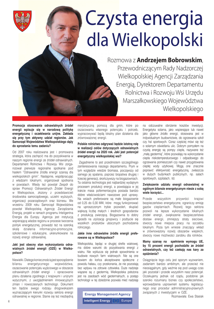 Czysta energia dla Wielkopolski Rozmowa z Andrzejem Bobrowskim, Przewodniczącym Rady Nadzorczej Wielkopolskiej Agencji Zarządzania Energią, Dyrektorem Departamentu Rolnictwa i Rozwoju Wsi Urzędu Marszałkowskiego Województwa Wielkopolskiego Promocja stosowania odnawialnych źródeł energii wpisuje się w narodową politykę energetyczną i oczekiwania unijne. Zakłada się przy tym aktywny udział regionów. Jak Samorząd Województwa Wielkopolskiego dąży do sprostania temu zadaniu? Od 2007 roku realizowana jest i promowana strategia, która zachęcić ma do pozyskiwania w naszym regionie energii ze źródeł odnawialnych. Departament Rolnictwa i Rozwoju Wsi zorganizował pierwsze regionalne spotkanie pod hasłem ”Odnawialne źródła energii szansą dla wielkopolskich gmin”. Następnie, współpracując z władzami lokalnymi, organizował spotkania w powiatach. Wtedy też powstał Zespół do spraw Promocji Odnawialnych Źródeł Energii w Wielkopolsce, złożony z przedstawicieli środowiska samorządowego, uczelni wyższych, organizacji pozarządowych oraz biznesu. We wrześniu 2009 roku Samorząd Województwa powołał Wielkopolską Agencję Zarządzania Energią, projekt w ramach programu Inteligentna Energia dla Europy. Agencja jest instytucją wspierającą władze regionu w procesie tworzenia polityki energetycznej, prowadzi też na szeroką skalę działania informacyjno-promocyjne, szkoleniowe i edukacyjne, ukierunkowane na rozwój energii odnawialnej. Jaki jest obecny stan wykorzystania odnawialnych źródeł energii (OZE) w Wielkopolsce? Niewielki. Dlatego koniecznością jest sporządzenie bilansu energetycznego województwa, oszacowanie potencjału wyjściowego w obszarze odnawialnych źródeł energii i opracowanie planu działania zgodnego z krajowymi i unijnymi wytycznymi, z uwzględnieniem innowacyjnych zmian i nowoczesnych technologii. Dokument ten będzie swego rodzaju drogowskazem wyznaczającym kierunki rozwoju sektora energii odnawialnej w regionie. Stanie się też niezbędną 6 merytoryczną pomocą dla gmin, które po oszacowaniu własnego potencjału i potrzeb, wypracowywać będą lokalny plan działania dla zrównoważonej energii. Polskie rolnictwo odgrywać będzie istotną rolę w realizacji celów dotyczących odnawialnych źródeł energii na 2020 rok. Jaki jest potencjał energetyczny wielkopolskiej wsi? Zagadnienie to jest przedmiotem szczególnego zainteresowania naszego departamentu. Prym w tym względzie wiedzie biomasa, począwszy od samego jej spalania, poprzez biopaliwa drugiej i trzeciej generacji, skończywszy na biogazowniach. Ta ostatnia technologia jest najbardziej wydajnym procesem produkcji energii, a powstająca w jej trakcie masa pofermentacyjna posiada bardzo dobre właściwościami nawozowe pod uprawy. Na wsiach preferowane są małe biogazownie od 0,25 do 0,30 MW, które mogą funkcjonować na uproszczonym trybie pozwoleń, skupiać większą liczbę małych i średnich gospodarstw z produkcją zwierzęcą. Biogazownia to dobry sposób na utylizację gnojowicy i pozbycie się wszelkich produktów ubocznych pochodzenia rolniczego. Jakie inne odnawialne źródła energii preferowane są w Wielkopolsce? Wielkopolska, będąc w drugiej strefie wiatrowej, ma dobre warunki do pozyskiwania energii z wiatru. Nie wyklucza się jednak spowolnienia w budowie nowych farm wiatrowych. Nie są one bowiem do końca akceptowane społeczne z powodu hałasu, czy przekonania, że nie pozostają bez wpływu na zdrowie człowieka. Duże nadzieje wiązane są z geotermią. Wielkopolska położona jest na zasobach wód geotermalnych, a postęp technologii w tej dziedzinie pozwala mieć nadzieję na odczuwalne obniżenie kosztów inwestycji. Energetyka solarna, jako wspierające lub nawet jako główne źródło energii, stosowana jest w indywidualnym budownictwie, do ogrzewania szkół czy hal sportowych. Coraz częściej mówi się też o solarnym oświetlaniu ulic. Dobrym pomysłem na czystą energię są pompy ciepła, nazywane też „małą geotermią”, które pozwalają na wykorzystanie ciepła niskotemperaturowego i odpadowego do ogrzewania pomieszczeń czy nawet przygotowania ciepłej wody użytkowej. Mogą one znacznie poprawić efektywność energetyczną, zwłaszcza w dużych budynkach publicznych, np. salach sportowych, szpitalach, itd. Zwiększenie udziału energii odnawialnej w ogólnym bilansie energetycznym niesie z sobą wiele korzyści... Przede wszystkim przywróci krajowi bezpieczeństwo energetyczne, ograniczy emisję gazów cieplarniach. Rozwój tego sektora pozwoli na lepsze wykorzystanie lokalnych źródeł energii, zwiększenie bezpieczeństwa dostaw energii, zmniejszy straty sieciowe, stworzy nowe miejsca pracy na szczeblu lokalnym. Poza tym wniesie znaczący wkład w zrównoważony rozwój obszarów wiejskich, stworzy nowe możliwości zarobku dla rolników. Mamy szansę na spełnienie wymogu UE, by 15 procent energii pochodziło ze źródeł odnawialnych, czy też czekają nas kary za opóźnienia? Osiągnięcie tego celu jest sporym wyzwaniem, zadaniem bardzo ambitnym, ale przecież nie nieosiągalnym, gdy weźmie się pod uwagę czas jaki pozostał i przede wszystkim nasz potencjał. Oczekujemy jednak od rządu, podobnie jak szeroko rozumiany biznes czy społeczeństwo, wprowadzenia usprawnień systemu legislacyjnego oraz procedur administracyjno-prawnych związanych z inwestycjami w OZE. Rozmawiała: Ewa Stasiak