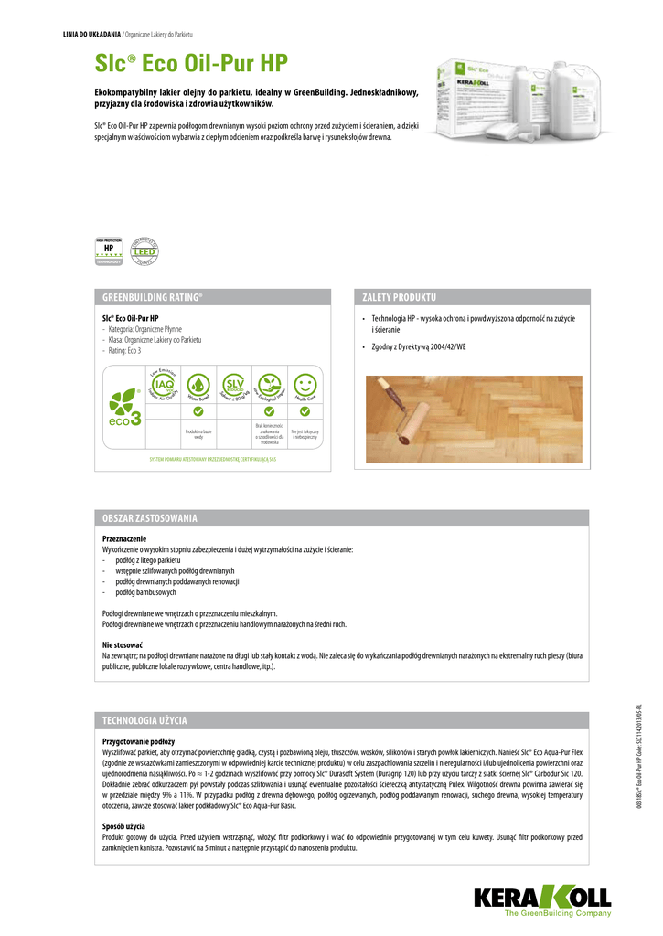 Linia do Układania / Organiczne Lakiery do Parkietu Slc® Eco Oil-Pur HP Ekokompatybilny lakier olejny do parkietu, idealny w GreenBuilding. Jednoskładnikowy, przyjazny dla środowiska i zdrowia użytkowników. Slc® Eco Oil-Pur HP zapewnia podłogom drewnianym wysoki poziom ochrony przed zużyciem i ścieraniem, a dzięki specjalnym właściwościom wybarwia z ciepłym odcieniem oraz podkreśla barwę i rysunek słojów drewna. HIGH PROTECTION CO TECHNOLOGY NT R I BUTES PO TO HP INTS Zalety Produktu Slc® Eco Oil-Pur HP -- Kategoria: Organiczne Płynne -- Klasa: Organiczne Lakiery do Parkietu -- Rating: Eco 3 • Technologia HP - wysoka ochrona i powdwyższona odporność na zużycie i ścieranie ater Based Produkt na bazie wody lve n t ≤ 8 0 g/ Ec ct y lit W kg REDUCED VOC pa SLV IAQ r Air Qua Low 3 oo Emissio So Ind ® ow • Zgodny z Dyrektywą 2004/42/WE n L GreenBuilding Rating® ological Im Brak konieczności znakowania o szkodliwości dla środowiska He alth Care Nie jest toksyczny i niebezpieczny SYSTEM POMIARU ATESTOWANY PRZEZ JEDNOSTKĘ CERTYFIKUJĄCĄ SGS Obszar zastosowania Przeznaczenie Wykończenie o wysokim stopniu zabezpieczenia i dużej wytrzymałości na zużycie i ścieranie: - podłóg z litego parkietu - wstępnie szlifowanych podłóg drewnianych - podłóg drewnianych poddawanych renowacji - podłóg bambusowych Podłogi drewniane we wnętrzach o przeznaczeniu mieszkalnym. Podłogi drewniane we wnętrzach o przeznaczeniu handlowym narażonych na średni ruch. Technologia użycia Przygotowanie podłoży Wyszlifować parkiet, aby otrzymać powierzchnię gładką, czystą i pozbawioną oleju, tłuszczów, wosków, silikonów i starych powłok lakierniczych. Nanieść Slc® Eco Aqua-Pur Flex (zgodnie ze wskazówkami zamieszczonymi w odpowiedniej karcie technicznej produktu) w celu zaszpachlowania szczelin i nieregularności i/lub ujednolicenia powierzchni oraz ujednorodnienia nasiąkliwości. Po ≈ 1-2 godzinach wyszlifować przy pomocy Slc® Durasoft System (Duragrip 120) lub przy użyciu tarczy z siatki ściernej Slc® Carbodur Sic 120. Dokładnie zebrać odkurzaczem pył powstały podczas szlifowania i usunąć ewentualne pozostałości ściereczką antystatyczną Pulex. Wilgotność drewna powinna zawierać się w przedziale między 9% a 11%. W przypadku podłóg z drewna dębowego, podłóg ogrzewanych, podłóg poddawanym renowacji, suchego drewna, wysokiej temperatury otoczenia, zawsze stosować lakier podkładowy Slc® Eco Aqua-Pur Basic. Sposób użycia Produkt gotowy do użycia. Przed użyciem wstrząsnąć, włożyć filtr podkorkowy i wlać do odpowiednio przygotowanej w tym celu kuwety. Usunąć filtr podkorkowy przed zamknięciem kanistra. Pozostawić na 5 minut a następnie przystąpić do nanoszenia produktu. 00318Slc® Eco Oil-Pur HP Code: SLC114 2013/05-PL Nie stosować Na zewnątrz; na podłogi drewniane narażone na długi lub stały kontakt z wodą. Nie zaleca się do wykańczania podłóg drewnianych narażonych na ekstremalny ruch pieszy (biura publiczne, publiczne lokale rozrywkowe, centra handlowe, itp.). Technologia użycia Nanoszenie Nakładać dwie lub trzy warstwy Slc® Eco Oil-Pur HP za pomocą Slc® Roller Plus, zachowując wydajność ≈ 80-100 ml/m2 na warstwę, w zależności od zamierzonego wyglądu wykończenia. Nanoszenie dwóch warstw - wykończenie z efektem naturalnym: nanieść Slc® Eco Oil-Pur HP lub Slc® Eco Aqua-Pur Basic, gdy jest to zalecone; po ≈ 10-12 godzinach wyszlifować przy pomocy Slc® Durasoft System (Duragrip 220) lub przy użyciu tarczy z siatki ściernej Slc® Carbodur Sic 220; dokładnie zebrać odkurzaczem pył powstały podczas szlifowania, usuwając ewentualne pozostałości szmatką antystatyczną Pulex, a następnie nanieść drugą warstwę Slc® Eco Oil-Pur HP. Nanoszenie trzech warstw - wykończenie z efektem jedwabistym: nanieść Slc® Eco Oil-Pur HP lub Slc® Eco Aqua-Pur Basic, gdy jest to zalecone; jak tylko podłoga będzie nadawała się do ruchu pieszego, ale po okresie nie dłuższym niż 3 godziny, nanieść drugą warstwę Slc® Eco Oil-Pur HP. Po ≈ 1-2 godzinach wyszlifować przy pomocy Slc® Durasoft System (Duragrip 220) lub przy użyciu tarczy z siatki ściernej Slc® Carbodur Sic 220; dokładnie zebrać odkurzaczem pył powstały podczas szlifowania, usuwając ewentualne pozostałości ściereczką antystatyczną Pulex, a następnie nanieść trzecią warstwę Slc® Eco Oil-Pur HP. Czyszczenie Czyszczenie narzędzi i usuwanie resztek Slc® Eco Oil-Pur HP wykonuje się wodą przed stwardnieniem produktu. Inne wskazówki Przed użyciem pozostawić produkt w pomieszczeniu, aby nabrał temperatury otoczenia. używać czystych pojemników i narzędzi. po otwarciu opakowania jego zawartość musi być zużyta jak najszybciej. Dla uzyskania jednorodnego wykończenia należy nanosić warstwy o takiej samej grubości i przestrzegać zalecanych ilości. Przed zastosowaniem Slc® Eco Oil-Pur HP zawsze nanosić Slc® Eco Aqua-Pur Flex. W przypadku drewna szczególnie nasiąkliwego może okazać się konieczne, aby uzyskać jednorodne wykończenie, naniesienie trzech warstw, niezależnie od zamierzonego wyglądu wykończenia. W przypadku podłóg fazowanych z jasnych gatunków drewna, nakładać Slc® Eco Oil-Pur HP przy pomocy pędzla o odpowiednich rozmiarach w celu uniknięcia gromadzenia się produktu w rowkach. Konserwacja parkietu: lakierowane podłogi drewniane muszą być co pewien czas poddawane konserwacji. W celu ich oczyszczenia używać neutralnego detergentu Slc® Eco Silopark. W celu okresowej i specjalnej konserwacji używać Slc® Eco Silolux lub Slc® Eco Silowax, w zależności od warunków używania. Wzór informacji technicznej dla projektantów Wykończenie o wysokim stopniu zabezpieczenia i dużej wytrzymałości na zużywanie i ścieranie podłóg drewnianych, wykonywać z użyciem ekokompatybilnego, jednoskładnikowego olejo-lakieru w technologii HP - High Protec