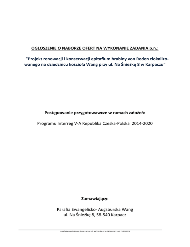 OGŁOSZENIE O NABORZE OFERT NA WYKONANIE ZADANIA p.n.: "Projekt renowacji i konserwacji epitafium hrabiny von Reden zlokalizowanego na dziedzińcu kościoła Wang przy ul. Na Śnieżkę 8 w Karpaczu" Postępowanie przygotowawcze w ramach założeń: Programu Interreg V-A Republika Czeska-Polska 2014-2020 Zamawiający: Parafia Ewangelicko- Augsburska Wang ul. Na Śnieżkę 8, 58-540 Karpacz Parafia Ewangelicko-Augsburska Wang, ul. Na Śnieżkę 8, 58-540 Karpacz, +48 75 7619228 CZĘŚĆ I Informacje ogólne 1. Zamawiający Parafia Ewangelicko-Augsburska WANG ul. Na Śnieżkę 8, 58-540 Karpacz tel. Fax: +48 75 76 19 228 +48 75 75 28 293 Osobą upoważnioną do kontaktów z oferentami jest ks. Edwin Pech – Proboszcz Parafii 2. Opis przedmiotu zamówienia: Przedmiotem zamówienia jest wykonanie zadania p.n.: "Projekt renowacji i konserwacji epitafium hrabiny von Reden zlokalizowanego na dziedzińcu kościoła Wang przy ul. Na Śnieżkę 8 w Karpaczu" W skład zadania wchodzą niżej wymienione prace: 1. opracowanie programu konserwatorskiego wraz z metodologią wykonania zadania zatwierdzonego przez konserwatora zabytków; 2. wykonanie projektu wraz z pozwoleniem na budowę obejmującego: a. część budowlaną: i.oczyszczenie bryły epitafium; ii.naprawa daszku nad epitafium; iii.wzmocnienie części kamiennych; iv. poprawa związania epitafium z podłożem oraz wzmocnienie skarpy poprzez wykonanie jej drenażu i naprawę muru oporowego zlokalizowanego na zapleczu epitafium; v.remont basenu ze źródełkiem (w tym instalacja zasilająca); vi. wykonanie nowej instalacji wodno-kanalizacyjnej (odpływowej) zapewniającej właściwą cyrkulację wody w basenie; b. część renowacyjną: i.oczyszczenie wizerunku hrabiny von Reden; ii.uzupełnienie braków malarskich w wizerunku; iii.odtworzenie liternictwa; iv.wykonanie i montaż stylizowanej tablicy informacyjnej 3. sporządzenie kosztorysu inwestorskiego. Prace będą prowadzone przez Zamawiającego w ramach realizacji zadania głównego pn. „Ekumenia w drodze” Termin wykonania zadania: 30.05.2016 r. 3. Warunki dopuszczające W postępowaniu mogą wziąć udział (złożyć ofertę) oferenci nie wykluczeni na podstawie art. 24 ustawy Prawo zamówień publicznych oraz spełniający warunki zawarte w art. 22 ust. 1 tejże ustawy. Potwierdzeniem spełnienia tych warunków jest złożenie pisemnego oświadczenia stanowiącego załącznik do Formularza ofertowego oraz spełnienie następujących warunków: Parafia Ewangelicko-Augsburska Wang, ul. Na Śnieżkę 8, 58-540 Karpacz, +48 75 7619228 3.1. Posiadanie aktualnych i obowiązujących uprawnień do wykonywania określonej działalności lub czynności, jeżeli ustawy nakładają obowiązek posiadania takich uprawnień; 3.2. Posiadanie niezbędnej wiedzy i doświadczenia do wykonania zamówienia; 3.3. Znajdowanie się w sytuacji ekonomicznej i finansowej zapewniającej wykonanie zamówienia; 3.4. Przeprowadzenie wizji z udziałem Zamawiającego, podczas której Wykonawca zapozna się z zakresem oraz charakterem prac oraz pobierze dodatkowe materiały niezbędne do przygotowania oferty. Dodatkowe wymogi w sprawie oświadczeń i dokumentów, jakie mają dostarczyć wykonawcy w celu potwierdzenia spełniania warunków udziału w postępowaniu: Oświadczenie, że Wykonawca spełnia warunki udziału w postępowaniu, określone w art. 22 ust. 1 ustawy; (załącznik) Zamawiający przy wyborze oferty będzie się kierował regułą: spełnia albo nie spełnia, analizując treść złożonej oferty, w szczególności uwzględniając m.in. zgodność załączonych do oferty dokumentów. Nie spełnienie chociażby jednego z wyżej wymienionych warunków skutkować będzie wykluczeniem Wykonawcy z postępowania. 4. Kryteria oceny złożonych ofert: Cena oraz dodatkowe kryteria i ich znaczenie. Oferty będą oceniane na podstawie następujących kryteriów: 90 % - cena ryczałtowa, 10% - referencje. CZĘŚĆ II Informacje dotyczące składania ofert 1. Postać oferty Sporządzona oferta musi spełniać następujące warunki: 1.1. musi być napisana w języku polskim pismem maszynowym lub technicznym drukowanym niezmywalnym atramentem, 1.2. wszystkie podpisy muszą być czytelne lub opisane pieczątkami imiennymi, złożone przez osobę lub osoby uprawnione do występowania w obrocie prawnym w imieniu wykonawcy, bądź przez upoważnionego przedstawiciela wykonawcy (w tym przypadku upoważnienie do podpisania dokumentów musi być dołączone do oferty), 1.3. wszystkie dokumenty, składające się na ofertę, muszą być przedstawione w formie oryginałów lub kserokopii poświadczonych „Za zgodność z oryginałem” przez upoważnionego przedstawiciela wykonawcy, 1.4. oferta pod rygorem jej odrzucenia i wykluczenia wykonawcy z postępowania musi zawierać następujące dokumenty: zaświadczenie REGON i NIP, wypis z rejestru firm. 2. Termin i miejsce składania ofert Oferty należy dostarczyć do siedziby Parafii Ewangelicko-Augsburskiej WANG w Karpaczu. Oferty wniesione po terminie nie będą rozpatrywane. Dla ofert przesłanych pocztą, przesyłką kurierską, faksem lub mailem liczy się data i godzina ich fizycznego dostarczenia do siedziby Parafii Ewangelicko-Augsburskiej Wang w Karpaczu. Oferty należy dostarczyć do 15.02.2016 r. godzina 1200 do kancelarii Parafii Ewangelicko-Augsburskiej WANG w Karpaczu przy ul. Na Śnieżkę 8, 58-540 Karpacz lub na fax nr: +48 75 75 28 293 lub na adres e-mail [email protected] Oferty mailowe należy potwierdzić w formie papierowej wysłanej na adres Zamawiającego w dniu wysłania e-maila z ofertą. 3. Wybór oferenta Zamawiający wystawi zlecenie Wykonawcy, który przedłoży ofertę najkorzystniejszą z punktu widzenia kryteriów przyjętych w niniejszym postępowaniu, Parafia Ewangelicko-Augsburska Wang, ul. Na Śnieżkę 8, 58-540 Karpacz, +48 75 7619228 4. Informacje dotyczące umowy Termin związania ofertą – 30 dni. 5. Ogłoszenie wyników 5.1. 