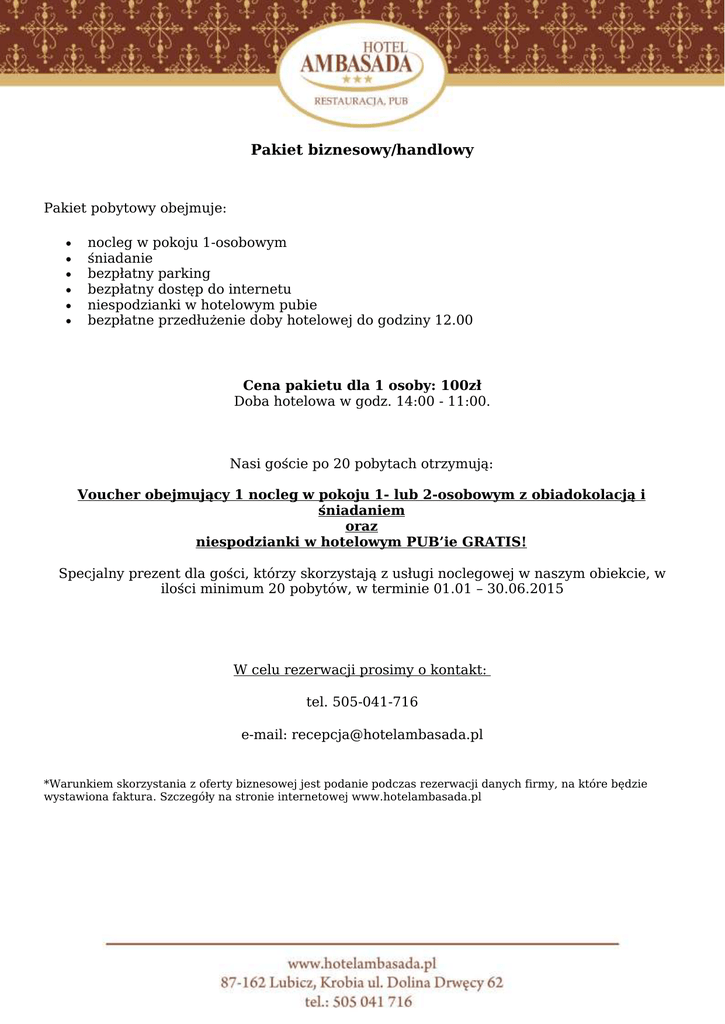 Pakiet biznesowy/handlowy Pakiet pobytowy obejmuje: nocleg w pokoju 1-osobowym śniadanie bezpłatny parking bezpłatny dostęp do internetu niespodzianki w hotelowym pubie bezpłatne przedłużenie doby hotelowej do godziny 12.00 Cena pakietu dla 1 osoby: 100zł Doba hotelowa w godz. 14:00 - 11:00. Nasi goście po 20 pobytach otrzymują: Voucher obejmujący 1 nocleg w pokoju 1- lub 2-osobowym z obiadokolacją i śniadaniem oraz niespodzianki w hotelowym PUB’ie GRATIS! Specjalny prezent dla gości, którzy skorzystają z usługi noclegowej w naszym obiekcie, w ilości minimum 20 pobytów, w terminie 01.01 – 30.06.2015 W celu rezerwacji prosimy o kontakt: tel. 505-041-716 e-mail: [email protected] *Warunkiem skorzystania z oferty biznesowej jest podanie podczas rezerwacji danych firmy, na które będzie wystawiona faktura. Szczegóły na stronie internetowej www.hotelambasada.pl