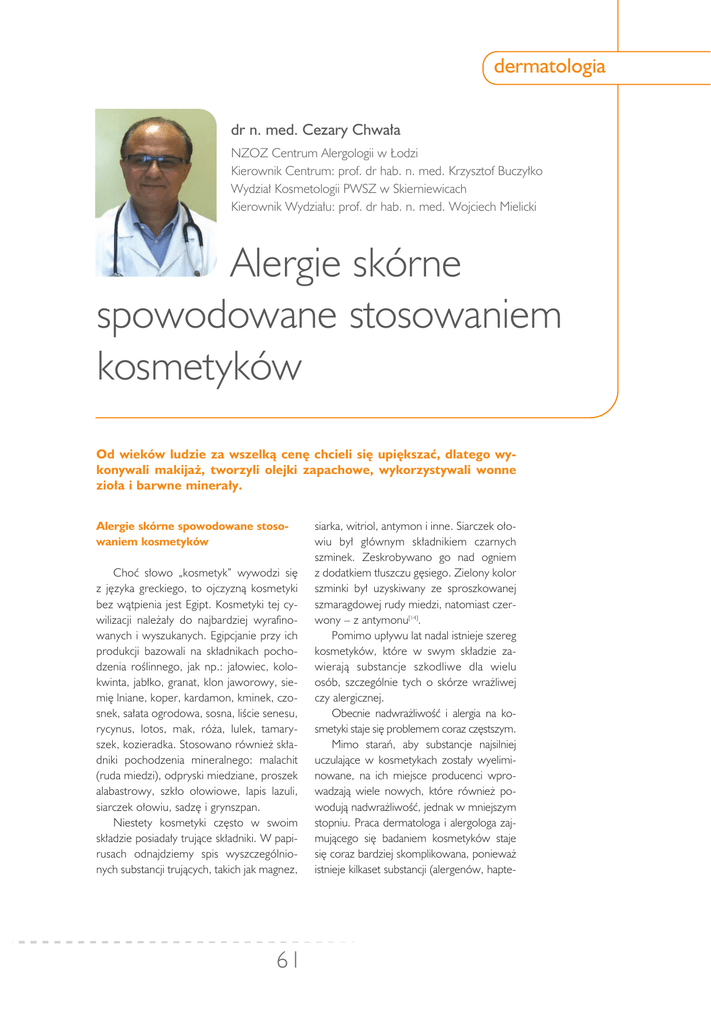 dermatologia dr n. med. Cezary Chwała NZOZ Centrum Alergologii w Łodzi Kierownik Centrum: prof. dr hab. n. med. Krzysztof Buczyłko Wydział Kosmetologii PWSZ w Skierniewicach Kierownik Wydziału: prof. dr hab. n. med. Wojciech Mielicki Alergie skórne spowodowane stosowaniem kosmetyków Od wieków ludzie za wszelką cenę chcieli się upiększać, dlatego wykonywali makijaż, tworzyli olejki zapachowe, wykorzystywali wonne zioła i barwne minerały. Alergie skórne spowodowane stosowaniem kosmetyków Choć słowo „kosmetyk” wywodzi się z języka greckiego, to ojczyzną kosmetyki bez wątpienia jest Egipt. Kosmetyki tej cywilizacji należały do najbardziej wyrafinowanych i wyszukanych. Egipcjanie przy ich produkcji bazowali na składnikach pochodzenia roślinnego, jak np.: jałowiec, kolokwinta, jabłko, granat, klon jaworowy, siemię lniane, koper, kardamon, kminek, czosnek, sałata ogrodowa, sosna, liście senesu, rycynus, lotos, mak, róża, lulek, tamaryszek, kozieradka. Stosowano również składniki pochodzenia mineralnego: malachit (ruda miedzi), odpryski miedziane, proszek alabastrowy, szkło ołowiowe, lapis lazuli, siarczek ołowiu, sadzę i grynszpan. Niestety kosmetyki często w swoim składzie posiadały trujące składniki. W papirusach odnajdziemy spis wyszczególnionych substancji trujących, takich jak magnez, 61 siarka, witriol, antymon i inne. Siarczek ołowiu był głównym składnikiem czarnych szminek. Zeskrobywano go nad ogniem z dodatkiem tłuszczu gęsiego. Zielony kolor szminki był uzyskiwany ze sproszkowanej szmaragdowej rudy miedzi, natomiast czerwony – z antymonu[14]. Pomimo upływu lat nadal istnieje szereg kosmetyków, które w swym składzie zawie ra ją sub stan cje szko dli we dla wie lu osób, szczególnie tych o skórze wrażliwej czy alergicznej. Obecnie nadwrażliwość i alergia na kosmetyki staje się problemem coraz częstszym. Mimo starań, aby substancje najsilniej uczulające w kosmetykach zostały wyeliminowane, na ich miejsce producenci wprowadzają wiele nowych, które również powodują nadwrażliwość, jednak w mniejszym stopniu. Praca dermatologa i alergologa zajmującego się badaniem kosmetyków staje się coraz bardziej skomplikowana, ponieważ istnieje kilkaset substancji (alergenów, hapte- nów) w nich obecnych, które są potencjalnymi sprawcami objawów. Najczęstszymi alergenami zawartymi w kosmetykach są substancje zapachowe (występujące nie tylko w perfumach, ale i w mydłach, pastach do zębów, dezodorantach) oraz konserwanty i barwniki[8]. W perfumach uczulać może aż kilkaset substancji. Dlatego w celach diagnostycznych opracowano mieszaniny kilku najważniejszych składowych. Są to zwykle 2 mieszaniny związków (poniżej wymienione) najczęściej alergizujących i dających odczyny krzyżowe z pozostałymi składowymi perfum: • Mieszanka zapachowa I: alkohol cynamonowy, aldehyd cynamonowy, hydroksycitronellal, amylocynamonowy aldehyd, geraniol, eugenol, izoeugenol, absolut mchu dębowego, • Mieszanka zapachowa II: lyral, cytral, farnezol, cytronelol, aldehyd heksylocynamonowy, kumaryna. Poza wyżej wymienionymi istnieją również inne, rzadziej uczulające, ale potencjalnie niebezpieczne substancje zapachowe zgrupowane w zestawach do testów diagnostycznych[9-10]. Konserwanty są szeroko stosowane w kosmetykach. Ich obecność ma przedłużyć trwałość produktu, chroniąc go przed drobnoustrojami. Większość konserwantów uczula bardzo słabo. Dzięki temu, pomimo powszechnego stosowania w ogromnej liczbie produktów, odsetek osób na nie nadwrażliwych nie jest duży. Najczęściej alergia powstaje w wyniku stosowania kosmetyków i leków zewnętrznych, gdyż konserwanty działają wówczas na skórę chorobowo zmienioną i łatwiej przenikają przez naskórek. Z konserwantów obecnych w kosmetykach dla alergologa i dermatologa najważniejsze są: formalina, parabeny i metyloizotiazolinon. Formalina jest doskonałym konserwantem, ale posiada nieprzyjemny zapach, który zneutralizować można poprzez dodawanie specjalnych substancji zapachowych. Ustalenie więc substancji, która uczuliła chorego, bywa trudne. W przypadku estrów kwasu p-hydroksybenzoesowego, w alergologii bardziej znanych pod nazwą „parabenów”, trudność powyższa także istnieje, choć jest znacznie mniejsza. Pod względem chemicznym są to głównie estry: metylowy, etylowy, propylowy, butylowy i benzylowy (estry o krótszym łańcuchu działają skuteczniej na bakterie, o łańcuchu dłuższym są aktywniejsze w stosunku do grzybów). Dlatego do konserwowania poszczególnych wyrobów używa się zwykle ich różnorodnych mieszanin. Parabeny są bardzo szeroko stosowane i znajdują się w wielu różnorodnych produktach. Szczególnie często są one dodawane do leków, kosmetyków i żywności. Związki te są obecne prawie we wszystkich (99%) kosmetykach takich jak kremy, maseczki, podkłady, locja, maści, pomadki oraz w znacznej części (77%) kosmetyków takich jak szampony, mydła, toniki do włosów. Najczęściej wykrywano ester metylowy (w 98% kosmetyków). Pozostałe estry pod względem występowania można uszeregować następująco: propylowy, etylowy, benzylowy i butylowy[8]. Do badań alergologicznych, czyli tzw. testów płatkowych (jeżeli podejrzewa się parabeny jako substancje wywołujące objawy skórne), używa się najczęściej mieszaniny parabenów złożonej z kompozycji 4 estrów (metylowego, etylowego, butylowego i propylowego). Jednak parabeny uczulają głównie jako składowe leków zewnętrznych, a nieporównywalnie rzadziej w następstwie obecności w kosmetykach. Metyloizotiazolinon, czyli MIT, to popularny konserwant stosowany w różnych produktach, w tym kosmetykach. Mimo relatywnego wzrostu statystyk uczuleń na mety- 62 loizotiazolinon, ogólna liczba osób uczulonych na tę substancję jest niska i wynosi około 2-5% (USA 11,1%)[12]. MIT chroni kosmetyk przed rozwojem mikroorgan