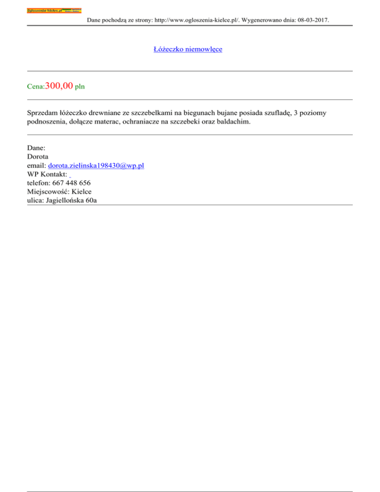 Dane pochodzą ze strony: http://www.ogloszenia-kielce.pl/. Wygenerowano dnia: 08-03-2017. Łóżeczko niemowlęce Cena:300,00 pln Sprzedam łóżeczko drewniane ze szczebelkami na biegunach bujane posiada szufladę, 3 poziomy podnoszenia, dołącze materac, ochraniacze na szczebeki oraz baldachim. Dane: Dorota email: [email protected] WP Kontakt: telefon: 667 448 656 Miejscowość: Kielce ulica: Jagiellońska 60a