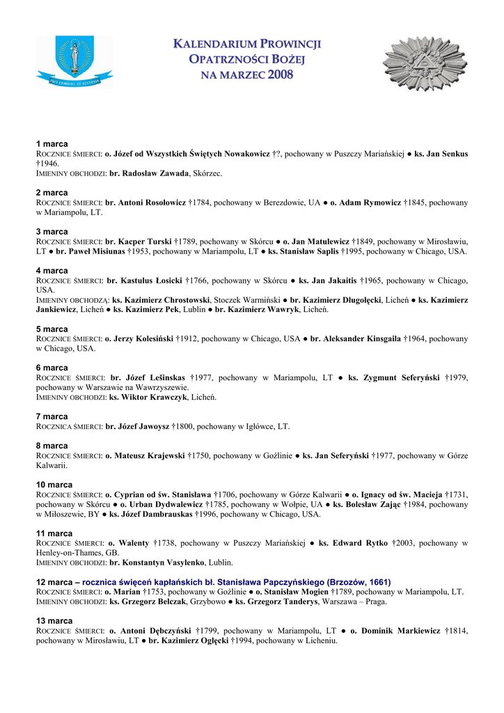 KALENDARIUM PROWINCJI OPATRZNOŚCI BOśEJ NA MARZEC 2008 1 marca ROCZNICE ŚMIERCI: o. Józef od Wszystkich Świętych Nowakowicz †?, pochowany w Puszczy Mariańskiej ● ks. Jan Senkus †1946. IMIENINY OBCHODZI: br. Radosław Zawada, Skórzec. 2 marca ROCZNICE ŚMIERCI: br. Antoni Rosołowicz †1784, pochowany w Berezdowie, UA ● o. Adam Rymowicz †1845, pochowany w Mariampolu, LT. 3 marca ROCZNICE ŚMIERCI: br. Kacper Turski †1789, pochowany w Skórcu ● o. Jan Matulewicz †1849, pochowany w Mirosławiu, LT ● br. Paweł Misiunas †1953, pochowany w Mariampolu, LT ● ks. Stanisław Saplis †1995, pochowany w Chicago, USA. 4 marca ROCZNICE ŚMIERCI: br. Kastulus Łosicki †1766, pochowany w Skórcu ● ks. Jan Jakaitis †1965, pochowany w Chicago, USA. IMIENINY OBCHODZĄ: ks. Kazimierz Chrostowski, Stoczek Warmiński ● br. Kazimierz Długołęcki, Licheń ● ks. Kazimierz Jankiewicz, Licheń ● ks. Kazimierz Pek, Lublin ● br. Kazimierz Wawryk, Licheń. 5 marca ROCZNICE ŚMIERCI: o. Jerzy Kolesiński †1912, pochowany w Chicago, USA ● br. Aleksander Kinsgaila †1964, pochowany w Chicago, USA. 6 marca ROCZNICE ŚMIERCI: br. Józef Lešinskas †1977, pochowany w Mariampolu, LT ● ks. Zygmunt Seferyński †1979, pochowany w Warszawie na Wawrzyszewie. IMIENINY OBCHODZI: ks. Wiktor Krawczyk, Licheń. 7 marca ROCZNICA ŚMIERCI: br. Józef Jawoysz †1800, pochowany w Igłówce, LT. 8 marca ROCZNICE ŚMIERCI: o. Mateusz Krajewski †1750, pochowany w Goźlinie ● ks. Jan Seferyński †1977, pochowany w Górze Kalwarii. 10 marca ROCZNICE ŚMIERCI: o. Cyprian od św. Stanisława †1706, pochowany w Górze Kalwarii ● o. Ignacy od św. Macieja †1731, pochowany w Skórcu ● o. Urban Dydwalewicz †1785, pochowany w Wołpie, UA ● ks. Bolesław Zając †1984, pochowany w Miłoszewie, BY ● ks. Józef Dambrauskas †1996, pochowany w Chicago, USA. 11 marca ROCZNICE ŚMIERCI: o. Walenty †1738, pochowany w Puszczy Mariańskiej ● ks. Edward Rytko †2003, pochowany w Henley-on-Thames, GB. IMIENINY OBCHODZI: br. Konstantyn Vasylenko, Lublin. 12 marca – rocznica święceń kapłańskich bł. Stanisława Papczyńskiego (Brzozów, 1661) ROCZNICE ŚMIERCI: o. Marian †1753, pochowany w Goźlinie ● o. Stanisław Mogien †1789, pochowany w Mariampolu, LT. IMIENINY OBCHODZI: ks. Grzegorz Belczak, Grzybowo ● ks. Grzegorz Tanderys, Warszawa – Praga. 13 marca ROCZNICE ŚMIERCI: o. Antoni Dębczyński †1799, pochowany w Mariampolu, LT ● o. Dominik Markiewicz †1814, pochowany w Mirosławiu, LT ● br. Kazimierz Oglęcki †1994, pochowany w Licheniu. 14 marca ROCZNICE ŚMIERCI: o. Leonard Łaski †1809, pochowany w Skórcu ● o. Karol Łapiński †1851, pochowany w Mariampolu, LT ● ks. Wincenty Dvaranauskas †1966, pochowany w Mariampolu, LT ● v.a. Józef Piaskowski †1991, pochowany w Stockbridge, USA. 15 marca ROCZNICE ŚMIERCI: o. Bartłomiej od Ofiarowania NMP †1719, pochowany w Goźlinie ● o. Michał Zdanowski †1814, pochowany w Rykach ● ks. Jan Katylius †1930, pochowany w Mariampolu, LT ● br. Jan Magaznieks †1987, pochowany w Izvalta, LV. 17 marca ROCZNICE ŚMIERCI: o. Franciszek Stankiewicz †1847, pochowany w Górze Kalwarii ● o. Onufry Szyrwid †1887, zmarł na zesłaniu w Syberii, miejsce pochówku nieznane ● v.a. Piotr Valentukievičius †1976, pochowany w Marianapolis, USA ● br. Antoni Micikievičius †1992, pochowany w Palomene, LT. IMIENINY OBCHODZĄ: ks. Zbigniew Borkowski, Licheń ● ks. Zbigniew Grygorcewicz, Borysów, BY ● ks. Zbigniew Krochmal, Licheń ● ks. Zbigniew Piłat, Rzym, IT ● br. Zbigniew Słaboń, Lublin ● ks. Zbigniew Wawrzyniak, Grudziądz ● ks. Zbigniew Wąsiniak, Licheń. 18 marca ROCZNICE ŚMIERCI: br. Szymon od św. Michała †1712, pochowany w Puszczy Mariańskiej ● ks. Józef Rakickas †1946, zamordowany w czasie drogi na zesłanie, miejsce pochówku nieznane ● ks. Józef Vaišnora †1987, pochowany w Rzymie na Verano, IT. 19 marca – św. Józefa, Oblubieńca NMP – patrona Zgromadzenia Święto patronalne: domu zakonnego w Fawley Court, GB, domu zakonnego i parafii w Orszy, BY, domu zakonnego i parafii w Sulejówku oraz domu zakonnego Warszawa – Marymont. ROCZNICE ŚMIERCI: o. Bernard Ostrowski †1743, pochowany w Skórcu ● o. Hilary Orłowski †1812, pochowany w Skórcu. IMIENINY OBCHODZĄ: br. Bogdan Leśko, Lublin ● ks. Bogdan Zieliński ● ks. Józef Chaim, Skórzec ● ks. Józef Pietuszko, Borysów, BY ● ks. Józef Wołowiec, Góra Kalwaria – Marianki. 20 marca – Wielki Czwartek ROCZNICE ŚMIERCI: o. Wincenty Szumła †1779, pochowany w Berezdowie, UA ● br. Jan Budreckas †1941. 21 marca – Wielki Piątek ROCZNICE ŚMIERCI: br. Józef od św. Jana †1700, pochowany w Puszczy Mariańskiej ● kl. Ignacy Gajowniczek †1945, pochowany w Warszawie na Wawrzyszewie ● ks. Antoni Podziawo †1955, pochowany w Skórcu. 22 marca – Wielka Sobota 23 marca – Zmartwychwstanie Pańskie ROCZNICE ŚMIERCI: ks. Franciszek Megnis †1983, pochowany w Pavlodarze, KAZ ● ks. Wincenty Parulis †1996, pochowany w Chicago, USA ● ks. Paweł Jasiński †2003, pochowany w Henley-on-Thames, GB ● ks. Bonifacy Sarul †2006, pochowany w Stoczku Warmińskim. 24 marca ROCZNICA ŚMIERCI: ks. Feliks Kudirka †1932, pochowany w Chicago, USA. 25 marca ROCZNICA ŚMIERCI: ks. Antoni Mažukna †1965, pochowany w Chicago, USA. 26 marca ROCZNICA ŚMIERCI: br. Homobonus Mecnar †1744. 27 marca ROCZNICE ŚMIERCI: o. Marek Herald †1803, pochowany w Piasecznie ● o. Jan Łokicki †1892, pochowany w Mariampolu, LT. IMIENINY OBCHODZI: v.a. ks. Ernest Yesayan, Erewań, ARM. 28 marca ROCZNICE ŚMIERCI: kl. Stanisław Bogucki †1942, zmarł na zesłaniu, pochowany w Czok-Pak, KAZ ● ks. Władysław Mažonas †1942, zmarł na zesłaniu w łagrze w Krasnojarskim Kraju na Syberii, stacja Reszoty; tamŜe pochowany. 29 marca ROCZNICE ŚMIERCI: o. Iwo Berliński †1742, 