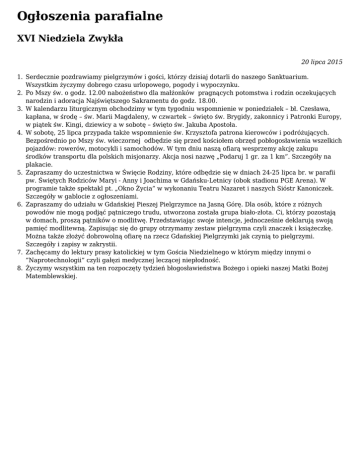 Ogłoszenia parafialne XVI Niedziela Zwykła 20 lipca 2015 1. Serdecznie pozdrawiamy pielgrzymów i gości, którzy dzisiaj dotarli do naszego Sanktuarium. Wszystkim życzymy dobrego czasu urlopowego, pogody i wypoczynku. 2. Po Mszy św. o godz. 12.00 nabożeństwo dla małżonków pragnących potomstwa i rodzin oczekujących narodzin i adoracja Najświętszego Sakramentu do godz. 18.00. 3. W kalendarzu liturgicznym obchodzimy w tym tygodniu wspomnienie w poniedziałek – bł. Czesława, kapłana, w środę – św. Marii Magdaleny, w czwartek – święto św. Brygidy, zakonnicy i Patronki Europy, w piątek św. Kingi, dziewicy a w sobotę – święto św. Jakuba Apostoła. 4. W sobotę, 25 lipca przypada także wspomnienie św. Krzysztofa patrona kierowców i podróżujących. Bezpośrednio po Mszy św. wieczornej odbędzie się przed kościołem obrzęd pobłogosławienia wszelkich pojazdów: rowerów, motocykli i samochodów. W tym dniu naszą ofiarą wesprzemy akcję zakupu środków transportu dla polskich misjonarzy. Akcja nosi nazwę „Podaruj 1 gr. za 1 km”. Szczegóły na plakacie. 5. Zapraszamy do uczestnictwa w Święcie Rodziny, które odbędzie się w dniach 24-25 lipca br. w parafii pw. Świętych Rodziców Maryi - Anny i Joachima w Gdańsku-Letnicy (obok stadionu PGE Arena). W programie także spektakl pt. „Okno Życia” w wykonaniu Teatru Nazaret i naszych Sióstr Kanoniczek. Szczegóły w gablocie z ogłoszeniami. 6. Zapraszamy do udziału w Gdańskiej Pieszej Pielgrzymce na Jasną Górę. Dla osób, które z różnych powodów nie mogą podjąć pątniczego trudu, utworzona została grupa biało-złota. Ci, którzy pozostają w domach, proszą pątników o modlitwę. Przedstawiając swoje intencje, jednocześnie deklarują swoją pamięć modlitewną. Zapisując się do grupy otrzymamy zestaw pielgrzyma czyli znaczek i książeczkę. Można także złożyć dobrowolną ofiarę na rzecz Gdańskiej Pielgrzymki jak czynią to pielgrzymi. Szczegóły i zapisy w zakrystii. 7. Zachęcamy do lektury prasy katolickiej w tym Gościa Niedzielnego w którym między innymi o ”Naprotechnologii” czyli gałęzi medycznej leczącej niepłodność. 8. Życzymy wszystkim na ten rozpoczęty tydzień błogosławieństwa Bożego i opieki naszej Matki Bożej Matemblewskiej.