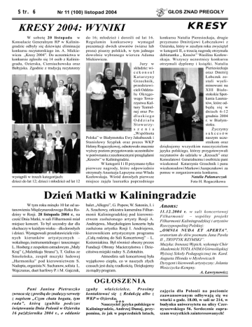 Str. 6 Nr 11 (100) listopad 2004 GŁOS ZNAD PREGOŁY KR E S Y KRESY 2004: WYNIKI W sobotę 20 listopada w Konsulacie Generalnym RP w Kaliningradzie odbyły się dziewiąte eliminacje konkursu recytatorskiego im. A. Mickiewicza „Kresy 2004”. Do uczestnictwa w konkursie zglosiło się 14 osób z Kaliningradu, Ozierska, Cierniachowska oraz Bałtyjska. Zgodnie z tradycją recytatorzy wystąpili w trzech kategorijach: dzieci do lat 12; dzieci i młodzież od lat 12 do 16; młodzież i dorośli od lat 16. Regulamin konkursowy wymagał prezentacji dwóch utworów (wiersz lub proza) pisarzy polskich, w tym jednego dowolnie wybranego wiersza Adama Mickiewicza. Jury w składzie: wicekonsul K a t a r z yn y Grzechnik, przedstawicieli Oddziału Okręgowego Towarzystwa Kultury Teatralnej oraz Podlaskiego Oddziału S t ow a r z ys z e n i a „Wspólnota Polska” w Białymstoku Ewy Jakubaszek i Stanisławy Szypluk oraz prezes WKP Heleny Rogaczykowej, odnotowało znacznie wyższy poziom przygotowania uczestników w porównaniu z zeszłorocznymi przeglądami „Kresów” w Kaliningradzie. W kategorii I i II przyznano tylko pierwsze nagrody, które odpowiednio otrzymały Anastazja Łapszyna oraz Włada Kozłowskaja. Wśród dorosłych pierwsze miejsce zajęła laureatka poprzedniego konkursu Natalia Pieresieckaja, drugie przyznano Dmitrijowi Łobczukowi z Ozierska, który w zeszłym roku zwyciężył w kategorii II, a trzecią nagrodę otrzymała debiutantka „ Kresów” Wasilina Kozłowskaja. Wszyscy uczestnicy konkursu otrzymali dyplomy i książki. Natalia Pieriesieckaja oraz Dmitrij Łobczuk zostali wyeliminowani na XIII Białostokskie Spotkania Laureatów, które odbędą się w dniach 6-12 grudnia 2004 r. w Białymstoku. Życzymy sukcesów naszym uczestnikom oraz dziękujemy wszystkim nauczyczielom języka polskiego, którzy przygotowywali recytatorów do udziału w „Kresach” oraz Konsulatowi Generalnemu i osobiście pani wicekonsul Katarzynie Grzechnik i panu wicekonsulowi Markowi Juzepczukowi za pomoc w zorganizowaniu konkursu. Natalia Pałamarczuk Foto H. Rogaczikowa Dzień Matki w Kaliningradzie W tym roku minęło 10 lat od ustanowienia Międzynarodowego Roku Rodziny w Rosji. 28 listopada 2004 r., na cześć Dnia Matki, w sali Filharmonii miał miejsce koncert. To był szczodry dar dla słuchaczy w każdym wieku – dla dorosłych i dzieci. Występowali przedstawiciele różnych kierunków artystycznych – wokalnego, instrumentalnego i tanecznego: L. Hosberg z zespołem estradowym „Mały Kraj” („Maleńkaja Strana”), T. Galius ze Smoleńska, zespół muzyki ludowej „Harmonika” pod kierownictwem S. Nadopta, organista N. Suchanow, solista L. Wajczunas, duet harfowy P. i M. Gajczuk, balet „Allegro”, G. Popow, W. Satonin, I. i A. Szachowy, orkiestra kameralna Filharmonii Kaliningradzkiej pod kierownictwem zasłużonego artysty Rosji A. Andriejewa.. Muzykologiem koncertu była zasłużona artystka Rosji I. Andriejewa, kierownikiem artystycznym programu „Całą rodziną do Sali Koncertowej” – L. Kożemiakina. Był również obecny prezes Fundacji Obrony Macierzyństwa i Dzieciństwa miejski radny S. Zołotuhin. Atmosfera sali koncertowej była wyjątkowo ciepła, co w naszych złych czasach jest dużą rzadkością. Dziękujemy za mądry program. Anons: 11.12.2004 r. w sali koncertowej Filharmonii – wspólny projekt Filharmonii Kaliningradzkiej i artystów Rzeczypospolitej Polskiej: „OMNIA NUDA ET APERTA”, oratorium do słów poematu Jana Pawła II „TRYPTYK RZYMSKI”. Muzyka: Ireneusz Wypich, wykonuje Chór Akademicki TOTA ANIMA Górnośląskiej Wyższej Szkoły Pedagogicznej im. Kard. Augusta Hlonda w Mysłowicach Dyrygent i kierownik artystyczny: Jolanta Woszczycka-Kempny. A. Ławrynowicz OG ŁOS ZENIA Pani Janina Pietruszko zwraca się z prośbą do znalazcy serwety z napisem „Czym chata bogata, tym rada”, którą zgubiła podczas świętowania Dnia Polonii w Oziersku 16 października 2004 r., o oddanie zguby właścicielce. Prosimy kontaktować się z Redakcją albo z WKP w Oziersku. ***języka polskiego w Nauczyciel Kaliningradzie, Andrzej Dunaj, przypomina, że jak w poprzednich latach, zajęcia dla Polonii na poziomie zaawansowanym odbywają się we wtorki o godz. 18.00, w sali nr 214, w budynku uniwersytetu na ulicy Czernyszewskiego 56. Serdecznie zapraszam wszystkich zainteresowanych!