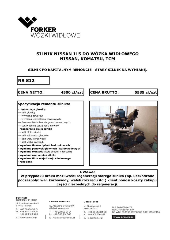 SILNIK NISSAN J15 DO WÓZKA WIDŁOWEGO NISSAN, KOMATSU, TCM SILNIK PO KAPITALNYM REMONCIE - STARY SILNIK NA WYMIANĘ. NR S12 CENA NETTO: 4500 zł/szt CENA BRUTTO: 5535 zł/szt Specyfikacja remontu silnika: - regeneracja głowicy --- szlif głowicy --- wymiana zaworów --- wymiana uszczelnień zaworowych --- frezowanie/docieranie gniazd zaworowych --- sprawdzenie szczelności głowicy - regeneracja bloku silnika --- szlif bloku silnika --- szlif szklanek cylindrów --- szlif wału korbowego --- szlif wałka rozrządu - wymiana tłoków i pierścieni tłokowych - wymiana panewek głównych i korbowodowych - wymiana rozrządu (koła zębate + łańcuch) - wymiana uszczelnień silnika - wymiana filtra oleju i oleju silnikowego - robocizna UWAGA! W przypadku braku możliwości regeneracji starego silnika (np. uszkodzone podzespoły: wał, korbowody, wałek rozrządu itd.) klient ponosi koszty zakupu części niezbędnych do regeneracji.