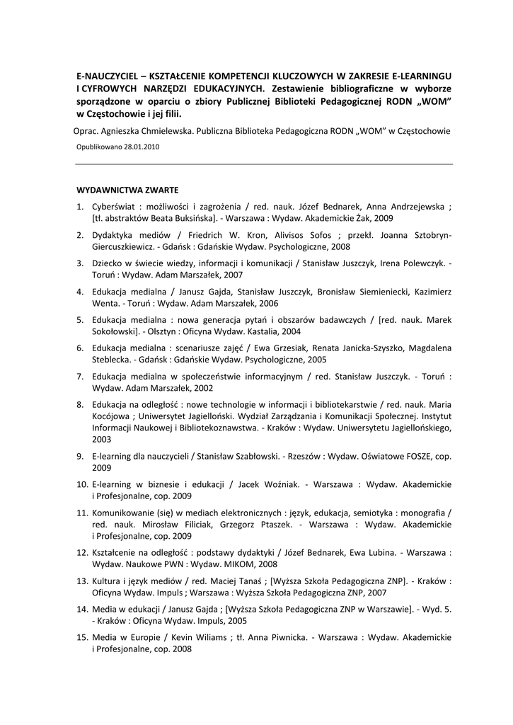 E-NAUCZYCIEL – KSZTAŁCENIE KOMPETENCJI KLUCZOWYCH W ZAKRESIE E-LEARNINGU I CYFROWYCH NARZĘDZI EDUKACYJNYCH. Zestawienie bibliograficzne w wyborze sporządzone w oparciu o zbiory Publicznej Biblioteki Pedagogicznej RODN „WOM” w Częstochowie i jej filii. Oprac. Agnieszka Chmielewska. Publiczna Biblioteka Pedagogiczna RODN „WOM” w Częstochowie Opublikowano 28.01.2010 WYDAWNICTWA ZWARTE 1. Cyberświat : możliwości i zagrożenia / red. nauk. Józef Bednarek, Anna Andrzejewska ; *tł. abstraktów Beata Buksioska+. - Warszawa : Wydaw. Akademickie Żak, 2009 2. Dydaktyka mediów / Friedrich W. Kron, Alivisos Sofos ; przekł. Joanna SztobrynGiercuszkiewicz. - Gdaosk : Gdaoskie Wydaw. Psychologiczne, 2008 3. Dziecko w świecie wiedzy, informacji i komunikacji / Stanisław Juszczyk, Irena Polewczyk. Toruo : Wydaw. Adam Marszałek, 2007 4. Edukacja medialna / Janusz Gajda, Stanisław Juszczyk, Bronisław Siemieniecki, Kazimierz Wenta. - Toruo : Wydaw. Adam Marszałek, 2006 5. Edukacja medialna : nowa generacja pytao i obszarów badawczych / *red. nauk. Marek Sokołowski+. - Olsztyn : Oficyna Wydaw. Kastalia, 2004 6. Edukacja medialna : scenariusze zajęd / Ewa Grzesiak, Renata Janicka-Szyszko, Magdalena Steblecka. - Gdaosk : Gdaoskie Wydaw. Psychologiczne, 2005 7. Edukacja medialna w społeczeostwie informacyjnym / red. Stanisław Juszczyk. - Toruo : Wydaw. Adam Marszałek, 2002 8. Edukacja na odległośd : nowe technologie w informacji i bibliotekarstwie / red. nauk. Maria Kocójowa ; Uniwersytet Jagiellooski. Wydział Zarządzania i Komunikacji Społecznej. Instytut Informacji Naukowej i Bibliotekoznawstwa. - Kraków : Wydaw. Uniwersytetu Jagiellooskiego, 2003 9. E-learning dla nauczycieli / Stanisław Szabłowski. - Rzeszów : Wydaw. Oświatowe FOSZE, cop. 2009 10. E-learning w biznesie i edukacji / Jacek Woźniak. - Warszawa : Wydaw. Akademickie i Profesjonalne, cop. 2009 11. Komunikowanie (się) w mediach elektronicznych : język, edukacja, semiotyka : monografia / red. nauk. Mirosław Filiciak, Grzegorz Ptaszek. - Warszawa : Wydaw. Akademickie i Profesjonalne, cop. 2009 12. Kształcenie na odległośd : podstawy dydaktyki / Józef Bednarek, Ewa Lubina. - Warszawa : Wydaw. Naukowe PWN : Wydaw. MIKOM, 2008 13. Kultura i język mediów / red. Maciej Tanaś ; *Wyższa Szkoła Pedagogiczna ZNP+. - Kraków : Oficyna Wydaw. Impuls ; Warszawa : Wyższa Szkoła Pedagogiczna ZNP, 2007 14. Media w edukacji / Janusz Gajda ; *Wyższa Szkoła Pedagogiczna ZNP w Warszawie+. - Wyd. 5. - Kraków : Oficyna Wydaw. Impuls, 2005 15. Media w Europie / Kevin Wiliams ; tł. Anna Piwnicka. - Warszawa : Wydaw. Akademickie i Profesjonalne, cop. 2008 16. Media w nauczaniu / Józef Bednarek. - Warszawa : Wydaw. MIKOM, 2002 17. Multimedia w kształceniu / Józef Bednarek. - Warszawa : Wydaw. Naukowe PWN, 2006 18. Pedagogika a środki informatyczne i media / red. Maciej Tanaś ; Wyższa Szkoła Pedagogiczna ZNP w Warszawie. - Wyd. 2. - Kraków : Oficyna Wydaw. Impuls ; Warszawa : Wyższa Szkoła Pedagogiczna ZNP, 2005 19. Szkoła w dobie Internetu / red. nauk. Andrzej Nowak, Katarzyna Winkowska-Nowak, Ludmiła Rycielska. - Warszawa : Wydaw. Naukowe PWN, 2009 20. Współczesna technologia informacyjna i edukacja medialna / red. Tadeusz Lewowicki, Bronisław Siemieniecki. - Toruo : Wydaw. Adam Marszałek, cop. 2004 WYDAWNICTWA CIĄGŁE 1. Analiza jakościowa systemów e-learningowych na przykładzie platformy informatycznej Edumatic oraz systemu Moodle / Jacek Marciniak // Edukacja Ustawiczna Dorosłych. - 2007, t. 2, s. 95-113 2. Animacja w podręcznikach elektronicznych i w innych elektronicznych prezentacjach materiałów dydaktycznych / Weronika Stoffova ; oprac. Henryk Budzeo // Edukacja Ustawiczna Dorosłych. - 2007, t. 3, s. 52-57 3. Cyberbiblioterapia - o wadach nowoczesnego kształcenia / Tomasz Kruszewski // Wychowanie na co Dzieo. - 2008, nr 3, s. 6-8 4. Czas na e-learning : technologia informacyjna i komunikacyjna w szkole / Roman Lorens // Dyrektor Szkoły. - 2008, nr 4, s. 12-13 5. Bibliotekarz w e-Twinningu? Jak najbardziej! / Ewa Łopatka // Biblioteka : Centrum Informacji. – 2009, nr 2, s. 10-11 6. Blaski i cienie uczenia w sieci / Grażyna Wieczorkowska // Psychologia w Szkole. - 2007, nr 4, s. 105-112 7. Edukacja online w opinii studentów / Marta Czechowska-Bieługa // Praca Socjalna. - 2009, nr 3, s. 122-132 8. E-learning jako komponent elastycznego układu kształcenia ustawicznego / Zdzisław Wołk // Edukacja Ustawiczna Dorosłych. - 2007, t. 2, s. 72-79 9. E-ZDZ Elektroniczna Platforma Edukacyjna / Marcin Kołodziejczak // Edukacja Ustawiczna Dorosłych. - 2004, t. 2, s. 107-110 10. Edukacja uczestników kultury cyfrowej / Mirosława Bogacz // Biblioteka : Centrum Informacji. – 2008, nr 2, s. 3-5 11. E-learning - potencjał możliwości / Sergo Kuruliszwili // Praca Socjalna. - 2008, nr 2, s. 96100 12. E-learning dla szkół i bibliotek / Bożena Bednarek-Michalska // Wszystko dla Szkoły. - 2005, nr 4, s. 1-7 13. E-learning i nowe media w polityce Unii Europejskiej / Izabela Kwiatkowska // Edukacja Medialna. - 2003, nr 3, s. 20-27 14. E-Twinning w multimedialnym centrum informacji / Bożena Boryczka // Biblioteka : Centrum Informacji. – 2008, nr 2, s. 1-2 15. Efektywnośd dydaktyczna systemów kształcenia dystansowego - kierunki badao / Danuta Moraoska // Chowanna. - 2003, t. 2, s. 135-148 16. Homo sapiens, homo faber, homo ludens, czyli gry i zabawy w elektronicznych kursach / Wojciech Przyłuski // Edukacja Ustawiczna Dorosłych. - 2008, t. 3, s. 97-103 17. Interaktywna satelitarna telewizja edukacyjna - pierwsze doświadczenia, pierwsze problemy / Zdzisław Lekiewicz, Marian Walczak // Edukacja Medialna. - 2002, nr 3, s. 44-47 18. Internet technicznym medium kształcenia / Jolanta Szabłowska // Wszystko dla Szkoły. 2001, nr 7/8, s. 1-2 19. Jak przygotowad dobrą prezentację multimedialną / Anna Kontkiewicz // Biblioteka : Szkolne Centrum Informacji. – 2009, nr 1, s. 24