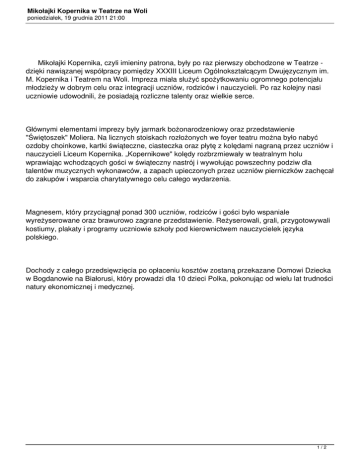 Mikołajki Kopernika w Teatrze na Woli poniedziałek, 19 grudnia 2011 21:00 Mikołajki Kopernika, czyli imieniny patrona, były po raz pierwszy obchodzone w Teatrze dzięki nawiązanej współpracy pomiędzy XXXIII Liceum Ogólnokształcącym Dwujęzycznym im. M. Kopernika i Teatrem na Woli. Impreza miała służyć spożytkowaniu ogromnego potencjału młodzieży w dobrym celu oraz integracji uczniów, rodziców i nauczycieli. Po raz kolejny nasi uczniowie udowodnili, że posiadają rozliczne talenty oraz wielkie serce. Głównymi elementami imprezy były jarmark bożonarodzeniowy oraz przedstawienie "Świętoszek" Moliera. Na licznych stoiskach rozłożonych we foyer teatru można było nabyć ozdoby choinkowe, kartki świąteczne, ciasteczka oraz płytę z kolędami nagraną przez uczniów i nauczycieli Liceum Kopernika. „Kopernikowe" kolędy rozbrzmiewały w teatralnym holu wprawiając wchodzących gości w świąteczny nastrój i wywołując powszechny podziw dla talentów muzycznych wykonawców, a zapach upieczonych przez uczniów pierniczków zachęcał do zakupów i wsparcia charytatywnego celu całego wydarzenia. Magnesem, który przyciągnął ponad 300 uczniów, rodziców i gości było wspaniale wyreżyserowane oraz brawurowo zagrane przedstawienie. Reżyserowali, grali, przygotowywali kostiumy, plakaty i programy uczniowie szkoły pod kierownictwem nauczycielek języka polskiego. Dochody z całego przedsięwzięcia po opłaceniu kosztów zostaną przekazane Domowi Dziecka w Bogdanowie na Białorusi, który prowadzi dla 10 dzieci Polka, pokonując od wielu lat trudności natury ekonomicznej i medycznej. 1/2 Mikołajki Kopernika w Teatrze na Woli poniedziałek, 19 grudnia 2011 21:00 Tu można obejrzeć zdjęcia... naszej płycie. ... aM. tu dowiedzieć się więcej Dyrekcja składa uczniom, wsparcia serdeczne XXXIII charytatywnego którzy Liceum podziękowania Ogólnokształcącego celu sercem naszego wszystkim wspomogli przedświątecznego wychowawcom, Dwujęzycznego MIKOŁAJKI przyczyniając spotkania. nauczycielom, im. Kopernika się tym rodzicom w samym Warszawie i do o w Szczególne składamy: „Świętoszka”; Juliannie Lesiak i Aleksandrze Zygmund za nad przygotowaniem przygotowanie Michałowi i otwartym nagranie Jóźwiakowi „Kolęd i pani Monice Gromek zanadzór olbrzymią pracę włożoną w Bogdanowie; panu Grzegorzowi Śmigierze zaKopernika”; koordynowanie na rzecz rodzinnego domu dziecka -związanych paniom Izabeli zpodziękowania Mikołajkami. Tkacz oraz Izabeli Urbańskiej za działań pomoc we wszystkich działaniach 2/2