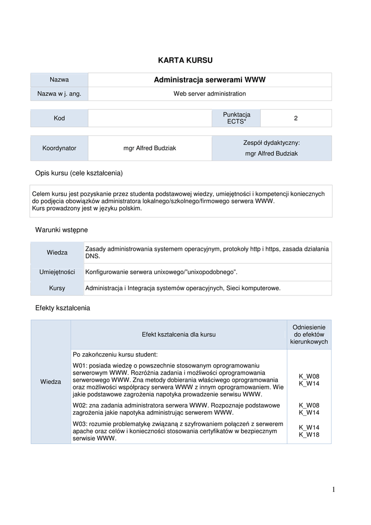 KARTA KURSU Nazwa Administracja serwerami WWW Nazwa w j. ang. Web server administration Punktacja ECTS* Kod Koordynator mgr Alfred Budziak 2 Zespół dydaktyczny: mgr Alfred Budziak Opis kursu (cele kształcenia) Celem kursu jest pozyskanie przez studenta podstawowej wiedzy, umiejętności i kompetencji koniecznych do podjęcia obowiązków administratora lokalnego/szkolnego/firmowego serwera WWW. Kurs prowadzony jest w języku polskim. Warunki wstępne Zasady administrowania systemem operacyjnym, protokoły http i https, zasada działania DNS. Wiedza Umiejętności Kursy Konfigurowanie serwera unixowego/”unixopodobnego”. Administracja i Integracja systemów operacyjnych, Sieci komputerowe. Efekty kształcenia Efekt kształcenia dla kursu Odniesienie do efektów kierunkowych Po zakończeniu kursu student: Wiedza W01: posiada wiedzę o powszechnie stosowanym oprogramowaniu serwerowym WWW. Rozróżnia zadania i możliwości oprogramowania serwerowego WWW. Zna metody dobierania właściwego oprogramowania oraz możliwości współpracy serwera WWW z innym oprogramowaniem. Wie jakie podstawowe zagrożenia napotyka prowadzenie serwisu WWW. K_W08 K_W14 W02: zna zadania administratora serwera WWW. Rozpoznaje podstawowe zagrożenia jakie napotyka administrując serwerem WWW. K_W08 K_W14 W03: rozumie problematykę związaną z szyfrowaniem połączeń z serwerem apache oraz celów i konieczności stosowania certyfikatów w bezpiecznym serwisie WWW. K_W14 K_W18 1 Odniesienie do efektów kierunkowych Efekt kształcenia dla kursu Po zakończeniu kursu student: Umiejętności U01: potrafi zainstalować, skonfigurować i zarządzać najpopularniejszym serwerem WWW apache. K_U07 K_U03 U02: potrafi rejestrować i obsługiwać nazwy domenowe, tworzyć i konfigurować serwery wirtualne oparte o nazwy domenowe i IP. K_U07 K_U08 U03: potrafi generować certyfikaty SSL i uruchamiać serwery WWW na https. K_U07 U04: potrafi uruchomić i nadzorować współprace serwera apache z innymi popularnymi usługami np. serwerem bazodanowym. K_U07 Odniesienie do efektów kierunkowych Efekt kształcenia dla kursu Kompetencje Po zakończeniu kursu student: społeczne K01: jest świadomy celowości i przydatności jakie na rynku pracy może mu dać umiejętność prowadzenia serwera WWW jako jednego z obowiązków służbowych. K_K01 K_K10 Studia stacjonarne Forma zajęć Ćwiczenia w grupach Wykład (W) A K Liczba godzin L S P E P E 30 Studia niestacjonarne Forma zajęć Ćwiczenia w grupach Wykład (W) A Liczba godzin K L S 10 Opis metod prowadzenia zajęć Zajęcia prowadzone są metodą laboratoryjną. Każdy student pracuje na własnym wirtualnym komputerze z zainstalowanym systemem unixopodobnym (sugerowany Linux ale student może wybrać lepiej znany sobie system). W czasie zajęć wykonywane są kolejne prace rozbudowujące serwer WWW, konfigurujące zadane funkcjonalności, monitorujące serwer jak również różne prace związane z prowadzeniem serwisu WWW (np. uruchomienie serwera baz danych). 2 W01 W02 W03 U01 U02 U03 U04 K01 Inne Egzamin pisemny Egzamin ustny Praca pisemna (esej) Referat Udział w dyskusji Projekt grupowy Projekt indywidualny Praca laboratoryjna Zajęcia terenowe Ćwiczenia w szkole Gry dydaktyczne E – learning Formy sprawdzania efektów kształcenia X X X X X X X X Ocenę dobrą lub bardzo dobrą może uzyskać student, który: Kryteria oceny na końcowym kolokwium przedstawi stworzony przez siebie serwer WWW z poprawnie funkcjonującymi konfiguracjami omawianymi w czasie zajęć oraz będzie potrafił wykonać zadane przez prowadzącego modyfikacje tej konfiguracji. Uwagi Zajęcia prowadzone są na rzeczywistych systemach (uruchamianych na wirtualnych komputerach) z pełnymi uprawnieniami administracyjnymi dla studenta. W praktyce w takich zajęciach laboratoryjnych nie da się przewidzieć dokładnie przebiegu zajęć (ze względu na różne problemy, jakie mogą wystąpić przy administrowaniu systemem) i zakresu w jakim da się zrealizować poszczególne punkty. Bardzo różny jest też wstępny poziom studentów - od zawodowych administratorów serwerów WWW aż do całkowicie początkujących. Wymaga to od prowadzącego bardzo dużej elastyczności w prowadzeniu zajęć. Treści merytoryczne (wykaz tematów) 1. Połączenie się z serwerem WWW za pomocą dowolnego narzędzia pozwalającego na tekstową komunikację (telnet, nc itp.) następnie zaobserwowanie działania metod HTTP GET i POST przy współpracy z tym serwerem. Zaobserwowanie zachowania serwera po przesłaniu danych. 2. Instalacja serwera WWW apache2 na własnym wirtualnym serwerze z pełnymi uprawnieniami administracyjnymi. 3. Korzystanie z źródłowej dokumentacji projektu apache. 4. Poruszanie się w strukturze plików konfiguracyjnych apache. 5. Włączanie i wyłączanie ładowalnych modułów oraz wirtualnych serwerów. 6. Konfiguracja serwowania własnego „miejsca sieciowego”. 7. Znajdowanie i stosowanie niezbędnych dyrektyw apache. 8. Podstawowa wiedza o konfiguracji najbardziej popularnego serwera DNS bind (na poziomie pliku strefy). 3 9. Konfiguracja aliasu, wpisu klasy A i delegacji na „własną” gałąź drzewa nazw DNS 10. Przykładowe uruchomienie własnych nazw domenowych w strefie do której jest posiadana delegacja. Zastosowanie tych domen do obsługi konfigurowanego serwera WWW a potem do obsługi na nim różnie skonfigurowanych serwerów wirtualnych 11. Konfigurowanie serwerów wirtualnych rozróżnianych po nazwach i po IP. 12. Uruchomienie wirtualnego hosta współpracującego z serwerem baz danych i językiem php. Konfiguracja php.ini 13. Akceleracja php, instalacja wybranego akceleratora. 14. Moduły mod_rewrite mod_redirect.,zastosowanie wyrażeń regularnych do konfiguracji apache. 15. Uruchomienie transparentnego i anonimowego serwera PROXY na apache. 16. Host wirtualny na https, generowanie i podpisywanie certyfikatu. 17. Instalacja i używanie oprogramowania do monitorowania bi