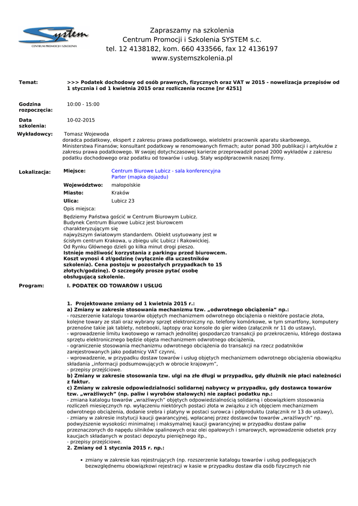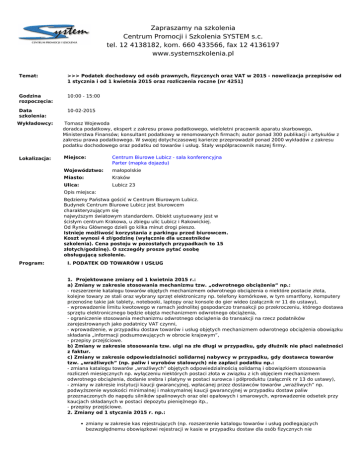 Zapraszamy na szkolenia Centrum Promocji i Szkolenia SYSTEM s.c. tel. 12 4138182, kom. 660 433566, fax 12 4136197 www.systemszkolenia.pl Temat: >>> Podatek dochodowy od osób prawnych, fizycznych oraz VAT w 2015 - nowelizacja przepisów od 1 stycznia i od 1 kwietnia 2015 oraz rozliczenia roczne [nr 4251] Godzina rozpoczęcia: 10:00 - 15:00 Data szkolenia: 10-02-2015 Wykładowcy: Lokalizacja: Tomasz TomaszWojewoda Wojewoda doradca doradcapodatkowy, podatkowy,ekspert ekspertzzzakresu zakresuprawa prawapodatkowego, podatkowego,wieloletni wieloletnipracownik pracownikaparatu aparatuskarbowego, skarbowego, Ministerstwa MinisterstwaFinansów; Finansów;konsultant konsultantpodatkowy podatkowywwrenomowanych renomowanychfirmach; firmach;autor autorponad ponad300 300publikacji publikacjii iartykułów artykułówzz zakresu zakresuprawa prawapodatkowego. podatkowego.WWswojej swojejdotychczasowej dotychczasowejkarierze karierzeprzeprowadził przeprowadziłponad ponad2000 2000wykładów wykładówzzzakresu zakresu podatku podatkudochodowego dochodowegooraz orazpodatku podatkuod odtowarów towarówi iusług. usług.Stały Staływspółpracownik współpracowniknaszej naszejfirmy. firmy. Miejsce: Miejsce: Centrum Biurowe Lubicz - sala konferencyjna Centrum Biurowe Lubicz - sala konferencyjna Parter (mapka dojazdu) Parter (mapka dojazdu) Województwo: Województwo: małopolskie małopolskie Miasto: Kraków Miasto: Kraków Ulica: Lubicz 2323 Ulica: Lubicz Opis miejsca: Opis miejsca: Będziemy Państwa gościć ww Centrum Biurowym Lubicz. Będziemy Państwa gościć Centrum Biurowym Lubicz. Budynek Centrum Biurowe Lubicz jest biurowcem Budynek Centrum Biurowe Lubicz jest biurowcem charakteryzującym sięsię charakteryzującym najwyższym światowym standardem. Obiekt usytuowany jest ww najwyższym światowym standardem. Obiekt usytuowany jest ścisłym centrum Krakowa, uu zbiegu ulic Lubicz i Rakowickiej. ścisłym centrum Krakowa, zbiegu ulic Lubicz i Rakowickiej. OdOd Rynku Głównego dzieli gogo kilka minut drogi pieszo. Rynku Głównego dzieli kilka minut drogi pieszo. Istnieje możliwość korzystania z parkingu przed biurowcem. Istnieje możliwość korzystania z parkingu przed biurowcem. Koszt wynosi 4 zł/godzinę (wyłącznie dla uczestników Koszt wynosi 4 zł/godzinę (wyłącznie dla uczestników szkolenia). Cena postoju ww pozostałych przypadkach toto 1515 szkolenia). Cena postoju pozostałych przypadkach złotych/godzinę). O szczegóły prosze pytać osobę złotych/godzinę). O szczegóły prosze pytać osobę obsługującą szkolenie. obsługującą szkolenie. Program: I. PODATEK OD TOWARÓW I USŁUG 1. Projektowane zmiany od 1 kwietnia 2015 r.: a) Zmiany w zakresie stosowania mechanizmu tzw. „odwrotnego obciążenia” np.: - rozszerzenie katalogu towarów objętych mechanizmem odwrotnego obciążenia o niektóre postacie złota, kolejne towary ze stali oraz wybrany sprzęt elektroniczny np. telefony komórkowe, w tym smartfony, komputery przenośne takie jak tablety, notebooki, laptopy oraz konsole do gier wideo (załącznik nr 11 do ustawy), - wprowadzenie limitu kwotowego w ramach jednolitej gospodarczo transakcji po przekroczeniu, którego dostawa sprzętu elektronicznego będzie objęta mechanizmem odwrotnego obciążenia, - ograniczenie stosowania mechanizmu odwrotnego obciążenia do transakcji na rzecz podatników zarejestrowanych jako podatnicy VAT czynni, - wprowadzenie, w przypadku dostaw towarów i usług objętych mechanizmem odwrotnego obciążenia obowiązku składania „informacji podsumowujących w obrocie krajowym”, - przepisy przejściowe. b) Zmiany w zakresie stosowania tzw. ulgi na złe długi w przypadku, gdy dłużnik nie płaci należności z faktur. c) Zmiany w zakresie odpowiedzialności solidarnej nabywcy w przypadku, gdy dostawca towarów tzw. „wrażliwych” (np. paliw i wyrobów stalowych) nie zapłaci podatku np.: - zmiana katalogu towarów „wrażliwych” objętych odpowiedzialnością solidarną i obowiązkiem stosowania rozliczeń miesięcznych np. wyłączeniu niektórych postaci złota w związku z ich objęciem mechanizmem odwrotnego obciążenia, dodanie srebra i platyny w postaci surowca i półproduktu (załącznik nr 13 do ustawy), - zmiany w zakresie instytucji kaucji gwarancyjnej, wpłacanej przez dostawców towarów „wrażliwych” np. podwyższenie wysokości minimalnej i maksymalnej kaucji gwarancyjnej w przypadku dostaw paliw przeznaczonych do napędu silników spalinowych oraz olei opałowych i smarowych, wprowadzenie odsetek przy kaucjach składanych w postaci depozytu pieniężnego itp., - przepisy przejściowe. 2. Zmiany od 1 stycznia 2015 r. np.: zmiany w zakresie kas rejestrujących (np. rozszerzenie katalogu towarów i usług podlegających bezwzględnemu obowiązkowi rejestracji w kasie w przypadku dostaw dla osób fizycznych nie prowadzących działalności gospodarczej, zmiany w zakresie zwolnień przedmiotowych z obowiązku ewidencjonowania w kasie rejestrującej), nowe regulacje dotyczące świadczenia usług telekomunikacyjnych, nadawczych i elektronicznych na rzecz zagranicznych osób fizycznych i innych zagranicznych podmiotów nie będących podatnikami. 3. Bieżące problemy i zagadnienia np.: faktury korygujące i noty korygujące – zasady rozliczeń podatkowych, rabaty, reklamacje, skonta, niedobory, zwroty towarów, błędy w fakturach, obligatoryjne elementy faktury korygującej i noty korygującej, forma potwierdzenia odbioru faktury korygującej, korekta wielu faktur dla jednego odbiorcy, terminy rozliczeń, refakturowanie usług – zasady rozliczeń, moment powstania obowiązku podatkowego, terminy i warunki do odliczania podatku naliczonego w transakcjach krajowych i międzynarodowych, najczęściej występujące problemy praktyczne związane z potrącaniem podatku naliczonego - zakup usług gastronomicznych i cateringowych, premie pieniężne, ubezpieczenie przy leasingu samochodów, odliczanie poda