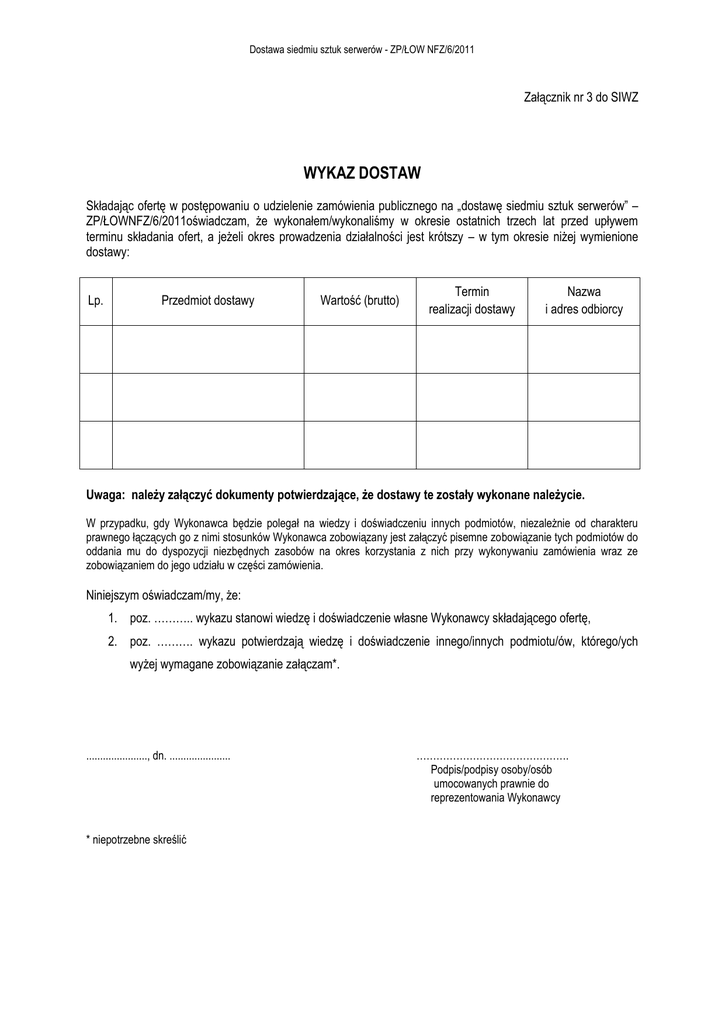 Dostawa siedmiu sztuk serwerów - ZP/ŁOW NFZ/6/2011 Załącznik nr 3 do SIWZ WYKAZ DOSTAW Składając ofertę w postępowaniu o udzielenie zamówienia publicznego na „dostawę siedmiu sztuk serwerów” – ZP/ŁOWNFZ/6/2011oświadczam, że wykonałem/wykonaliśmy w okresie ostatnich trzech lat przed upływem terminu składania ofert, a jeżeli okres prowadzenia działalności jest krótszy – w tym okresie niżej wymienione dostawy: Lp. Przedmiot dostawy Wartość (brutto) Termin realizacji dostawy Nazwa i adres odbiorcy Uwaga: należy załączyć dokumenty potwierdzające, że dostawy te zostały wykonane należycie. W przypadku, gdy Wykonawca będzie polegał na wiedzy i doświadczeniu innych podmiotów, niezależnie od charakteru prawnego łączących go z nimi stosunków Wykonawca zobowiązany jest załączyć pisemne zobowiązanie tych podmiotów do oddania mu do dyspozycji niezbędnych zasobów na okres korzystania z nich przy wykonywaniu zamówienia wraz ze zobowiązaniem do jego udziału w części zamówienia. Niniejszym oświadczam/my, że: 1. poz. ……….. wykazu stanowi wiedzę i doświadczenie własne Wykonawcy składającego ofertę, 2. poz. ………. wykazu potwierdzają wiedzę i doświadczenie innego/innych podmiotu/ów, którego/ych wyżej wymagane zobowiązanie załączam*. ......................, dn. ...................... * niepotrzebne skreślić ………………………………………. Podpis/podpisy osoby/osób umocowanych prawnie do reprezentowania Wykonawcy