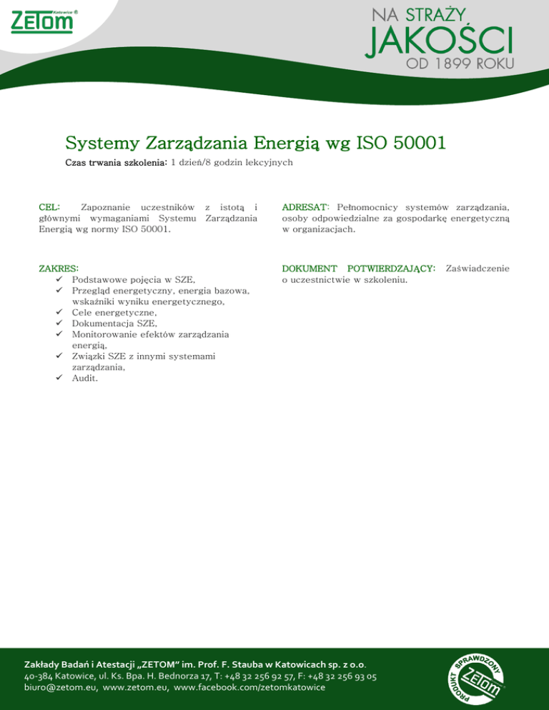 Systemy Zarządzania Energią wg ISO 50001 Czas trwania szkolenia: 1 dzień/8 godzin lekcyjnych CEL: Zapoznanie uczestników z istotą i głównymi wymaganiami Systemu Zarządzania Energią wg normy ISO 50001. ADRESAT: Pełnomocnicy systemów zarządzania, osoby odpowiedzialne za gospodarkę energetyczną w organizacjach. ZAKRES: Podstawowe pojęcia w SZE, Przegląd energetyczny, energia bazowa, wskaźniki wyniku energetycznego, Cele energetyczne, Dokumentacja SZE, Monitorowanie efektów zarządzania energią, Związki SZE z innymi systemami zarządzania, Audit. DOKUMENT POTWIERDZAJĄCY: o uczestnictwie w szkoleniu. Zakłady Badań i Atestacji „ZETOM” im. Prof. F. Stauba w Katowicach sp. z o.o. 40-384 Katowice, ul. Ks. Bpa. H. Bednorza 17, T: +48 32 256 92 57, F: +48 32 256 93 05 [email protected], www.zetom.eu, www.facebook.com/zetomkatowice Zaświadczenie